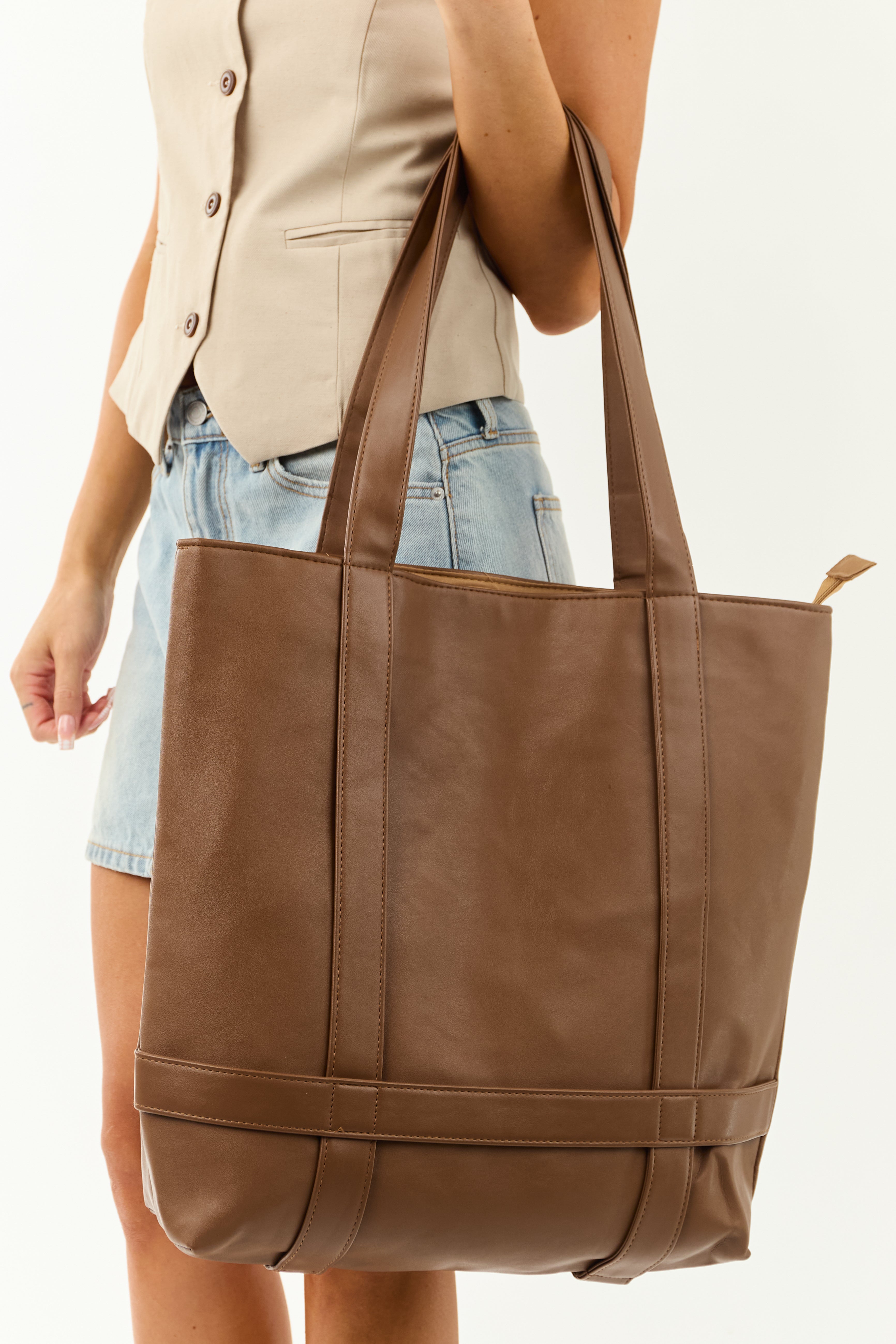 Cognac Faux Leather Extra Large Strappy Tote Bag