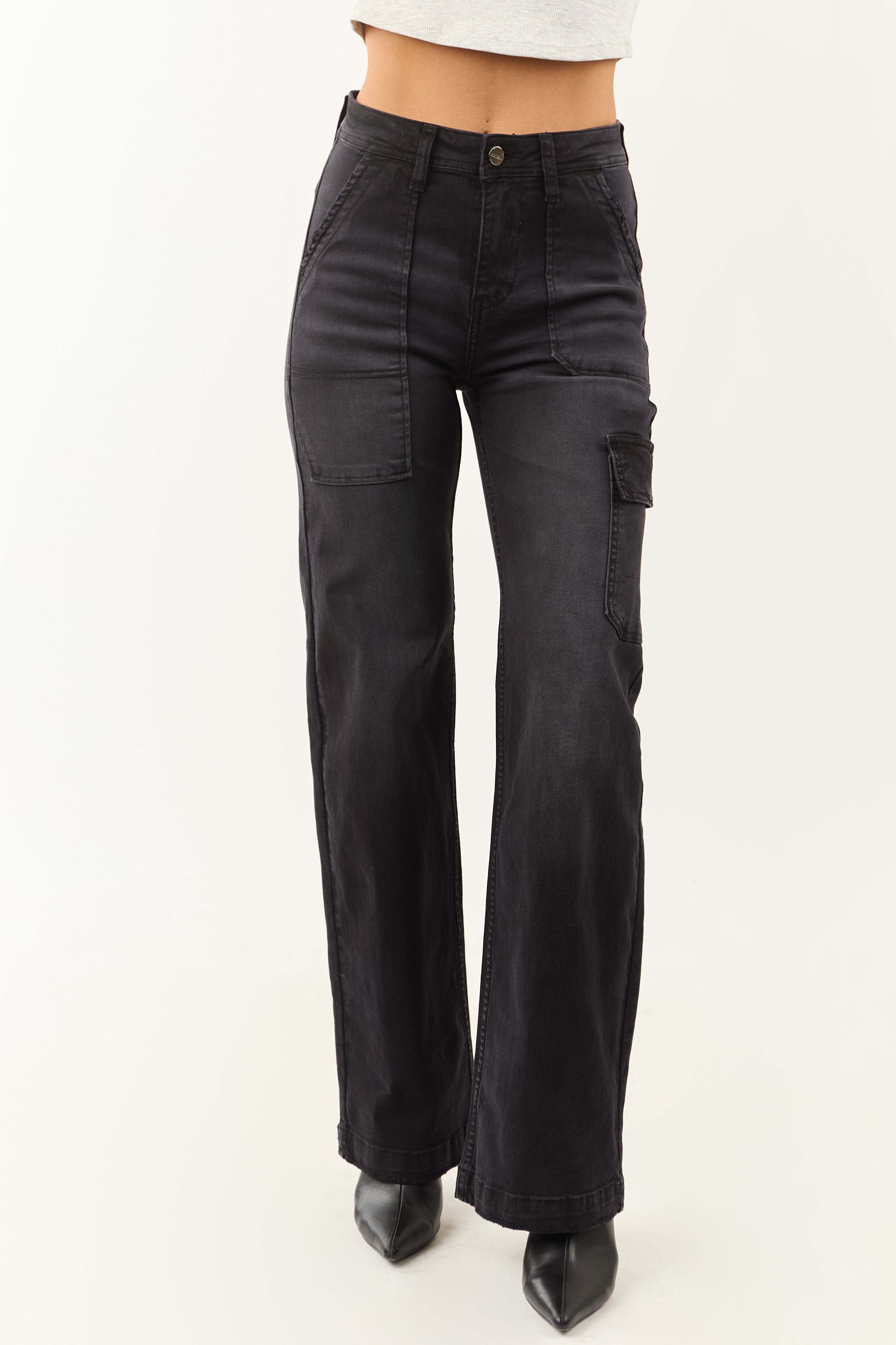 Risen Black Stretchy Wide Leg Cargo Pocket Jeans