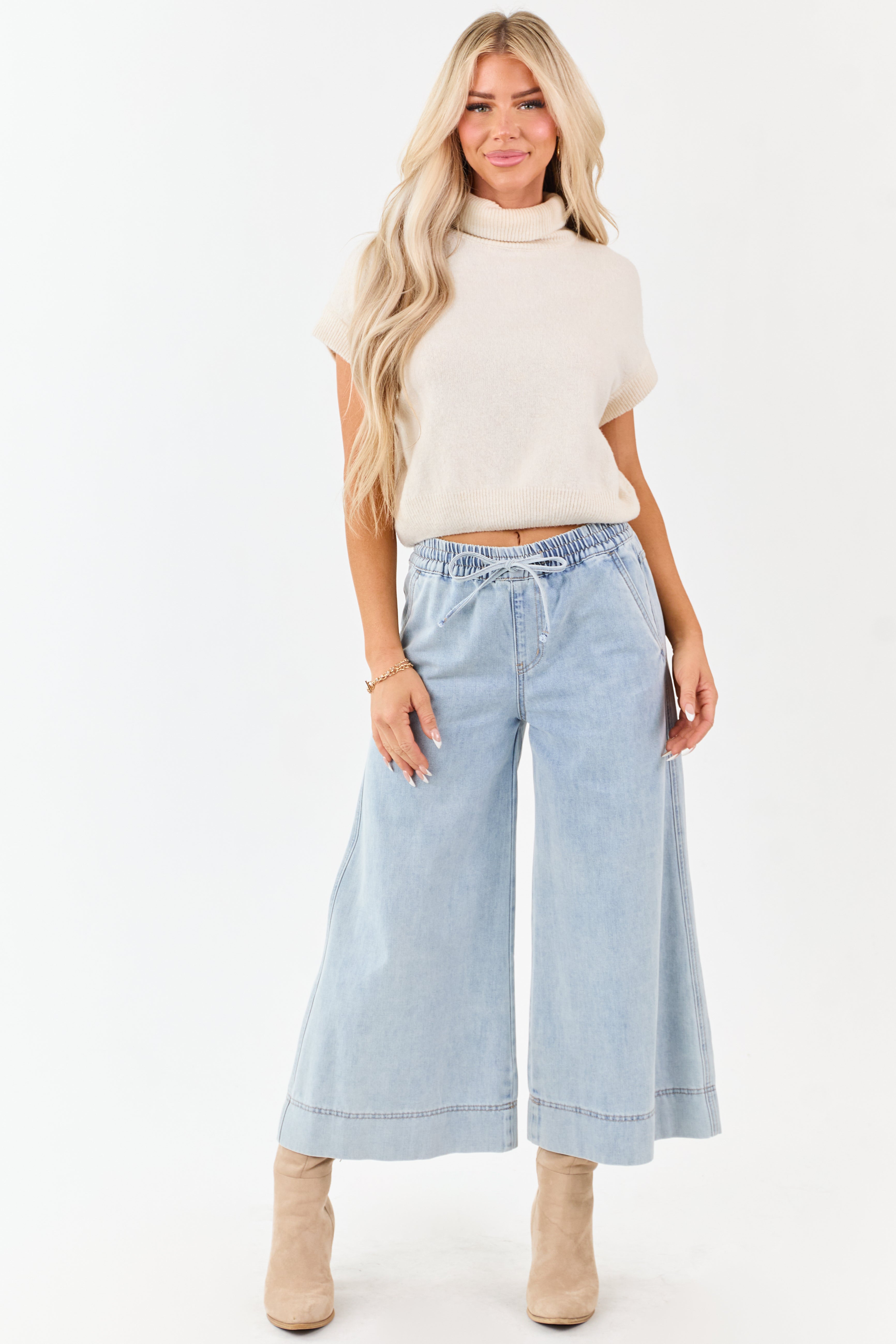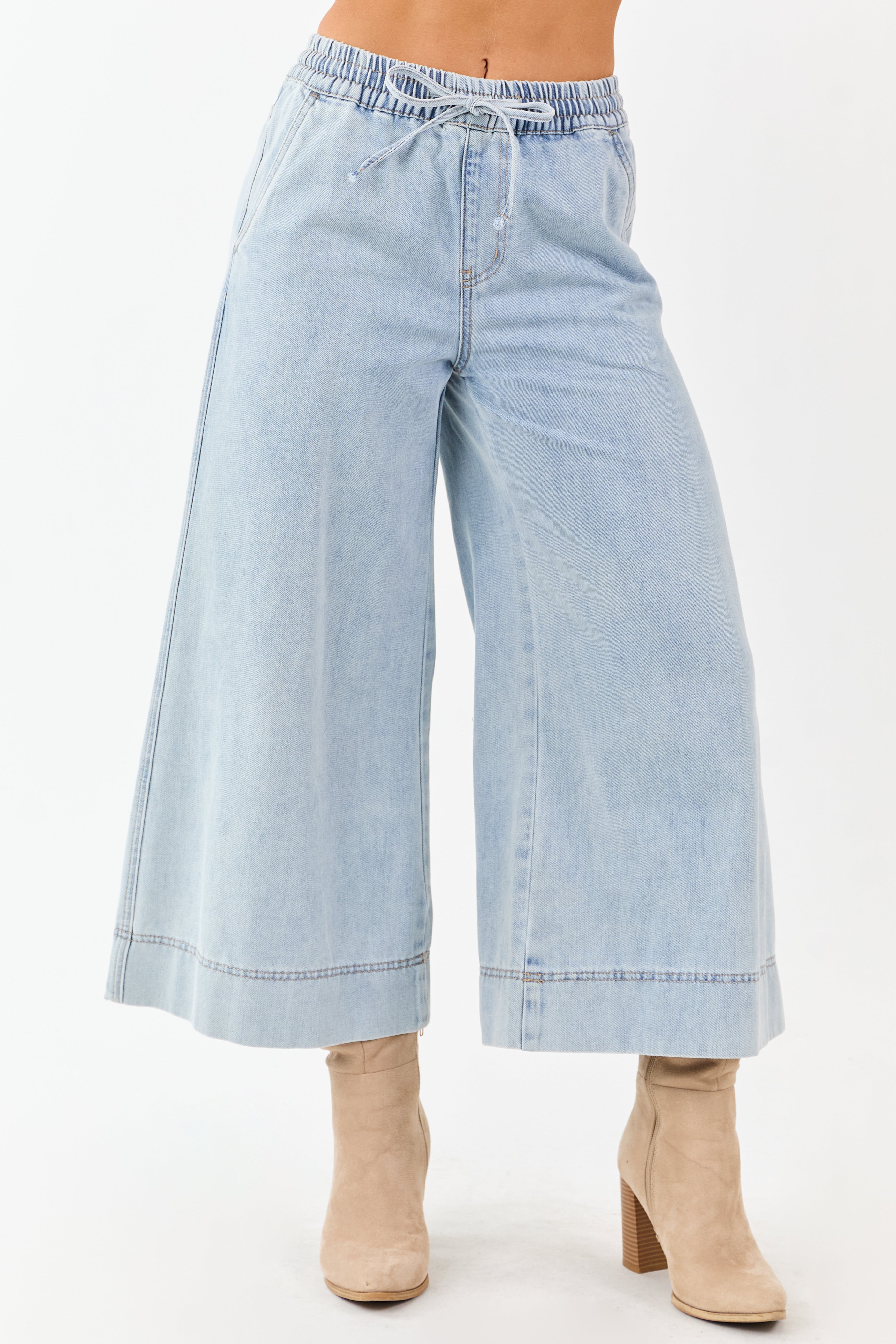 Mica Denim Light Wash Drawstring Wide Capri Jeans