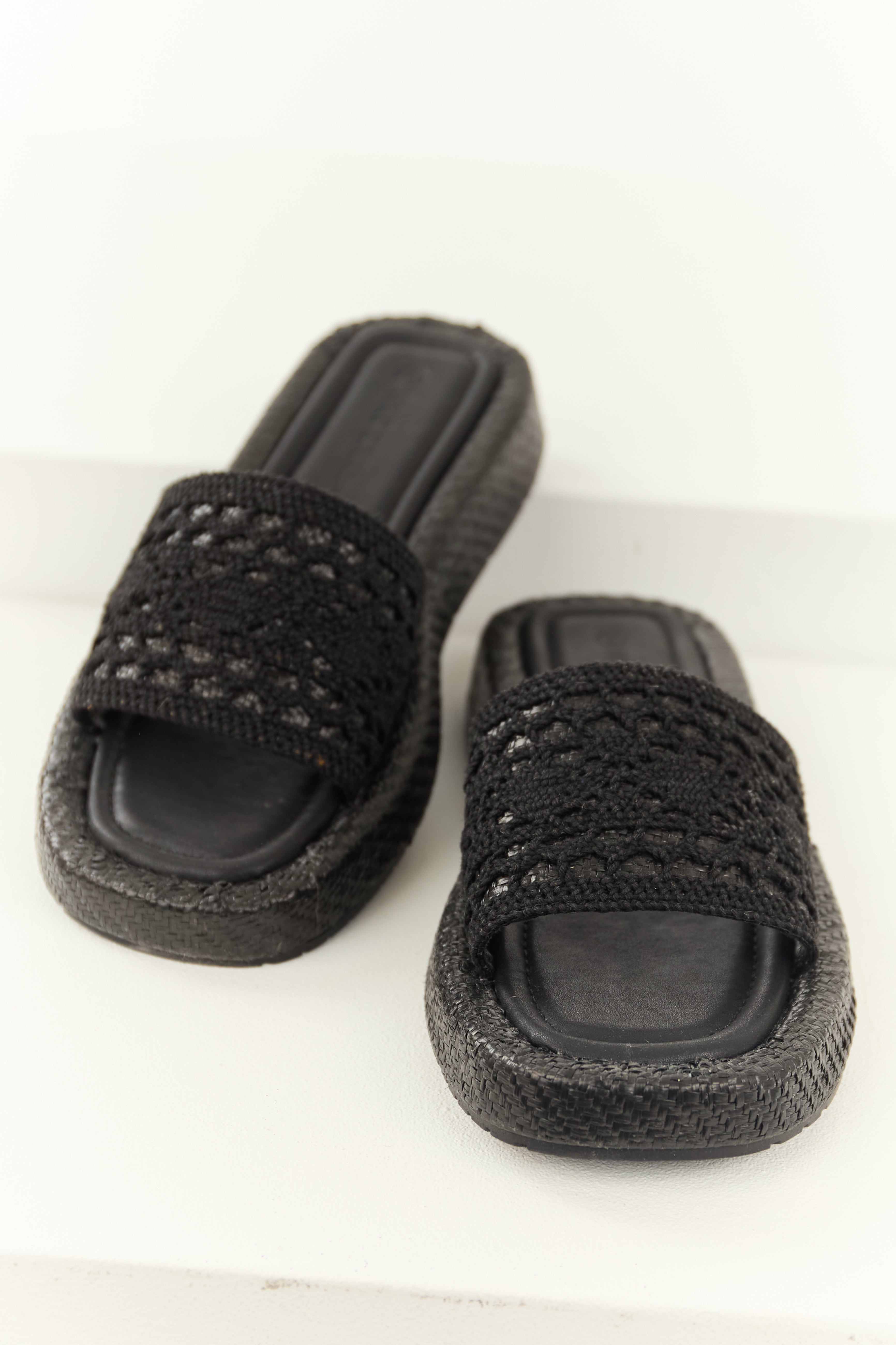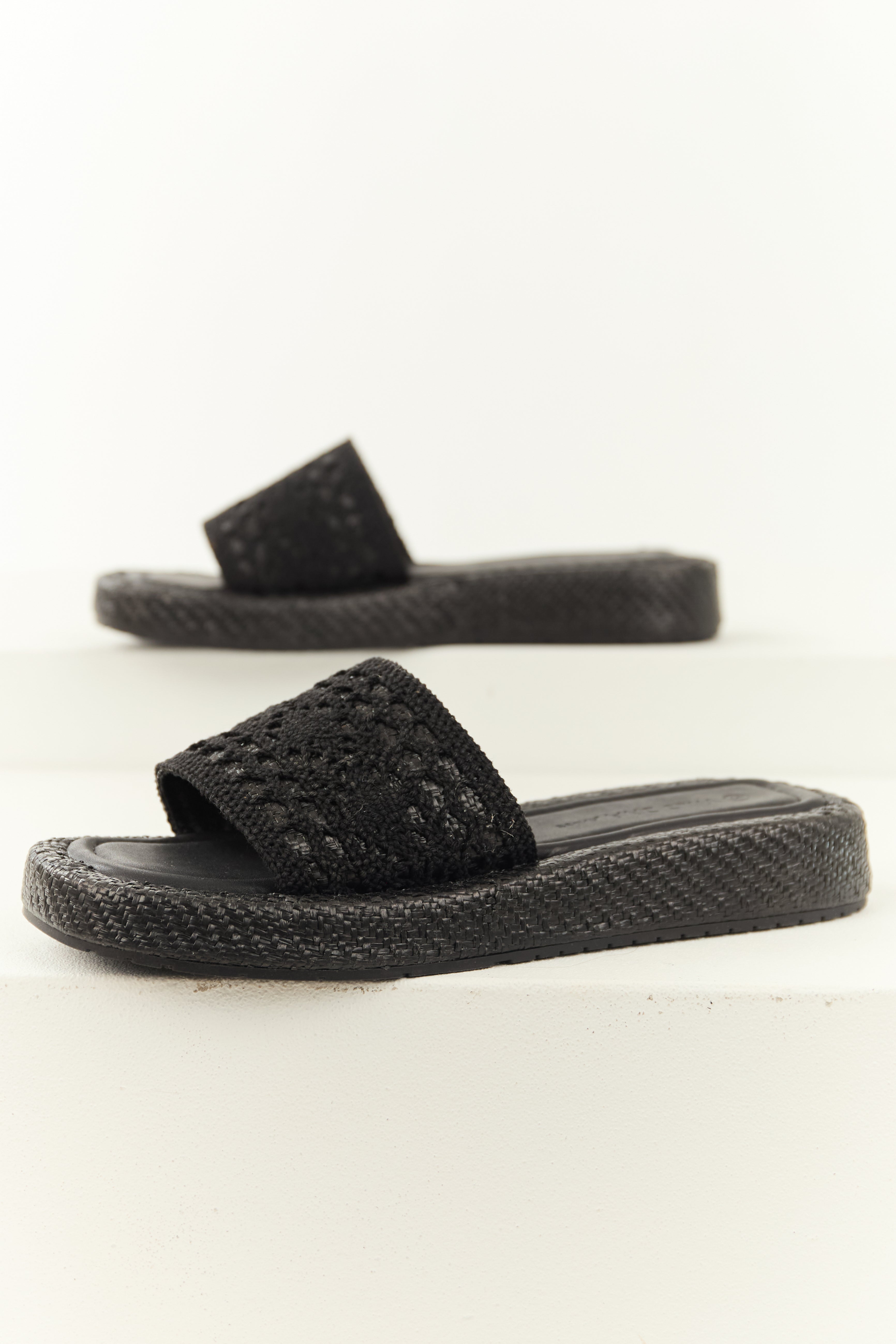 Black Crochet Strap Raffia Platform Slip On Sandals