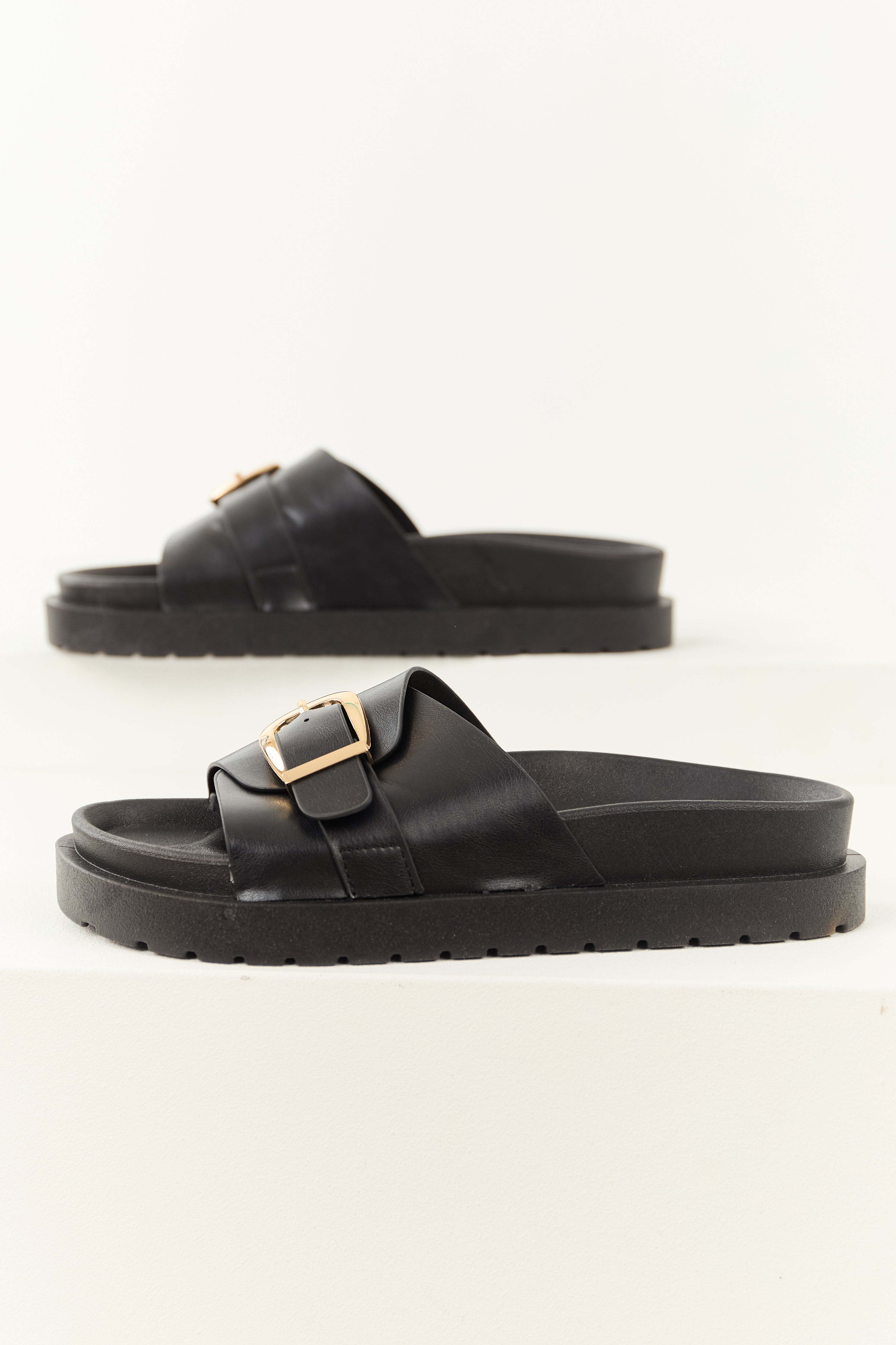 Black Faux Leather Buckle Strap Slip On Sandals