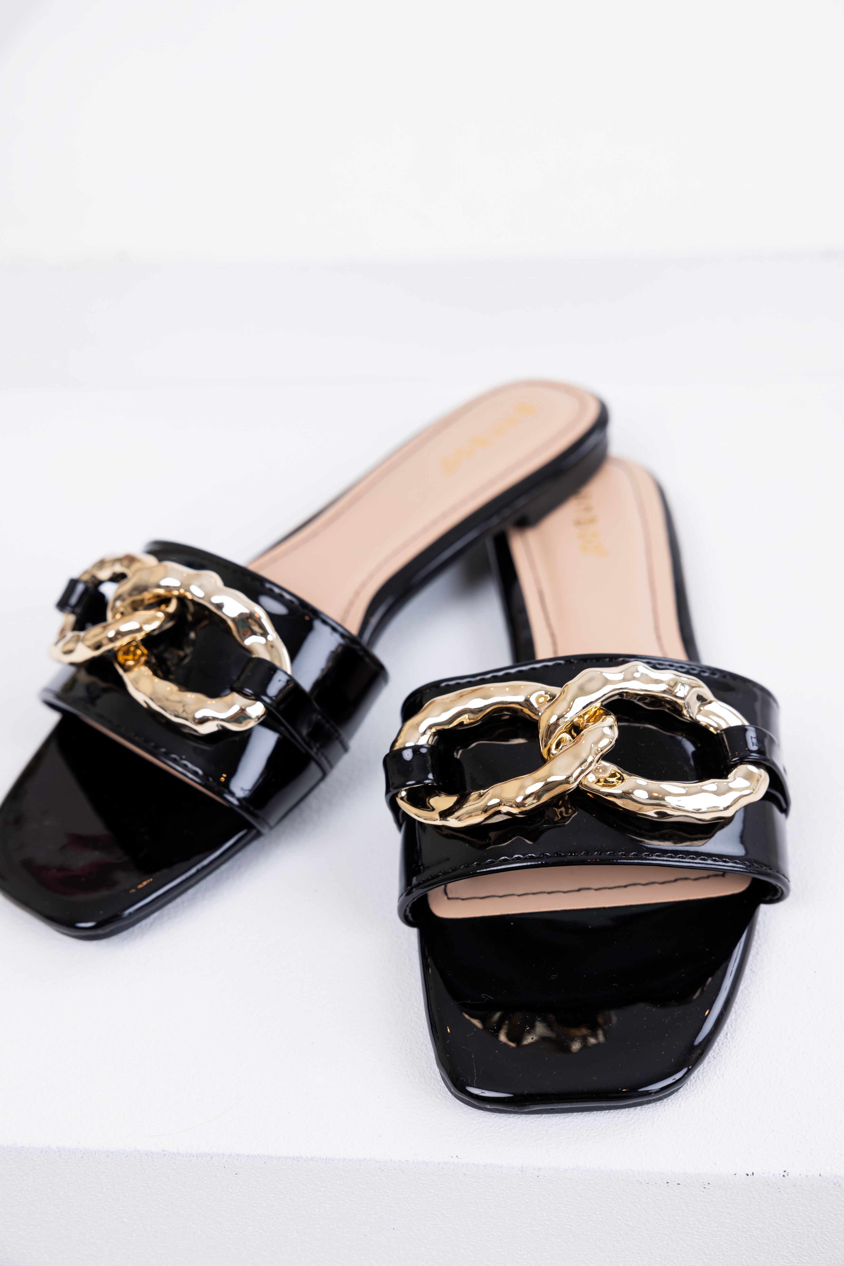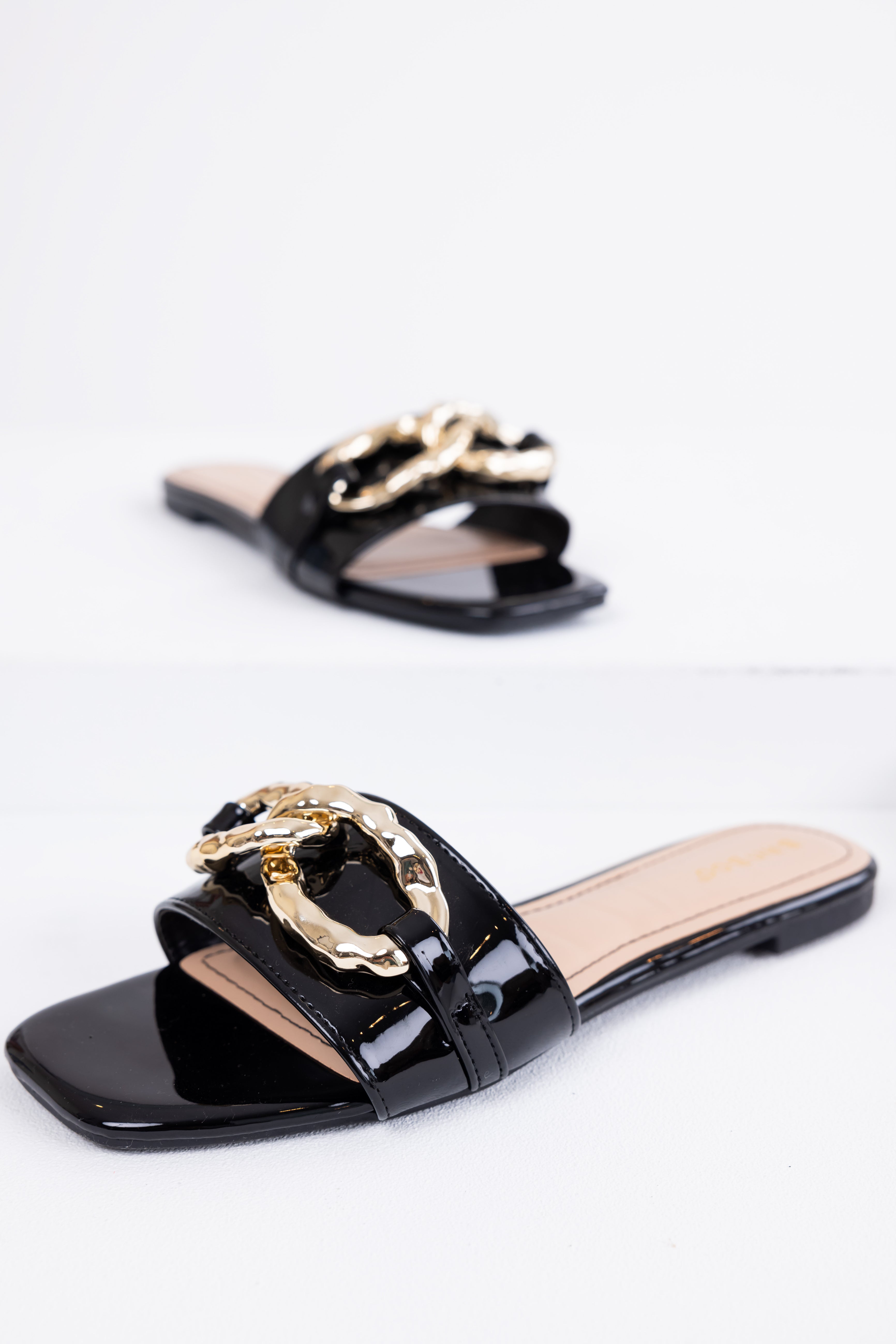 Black Patent Leather Link Chain Flat Sandals