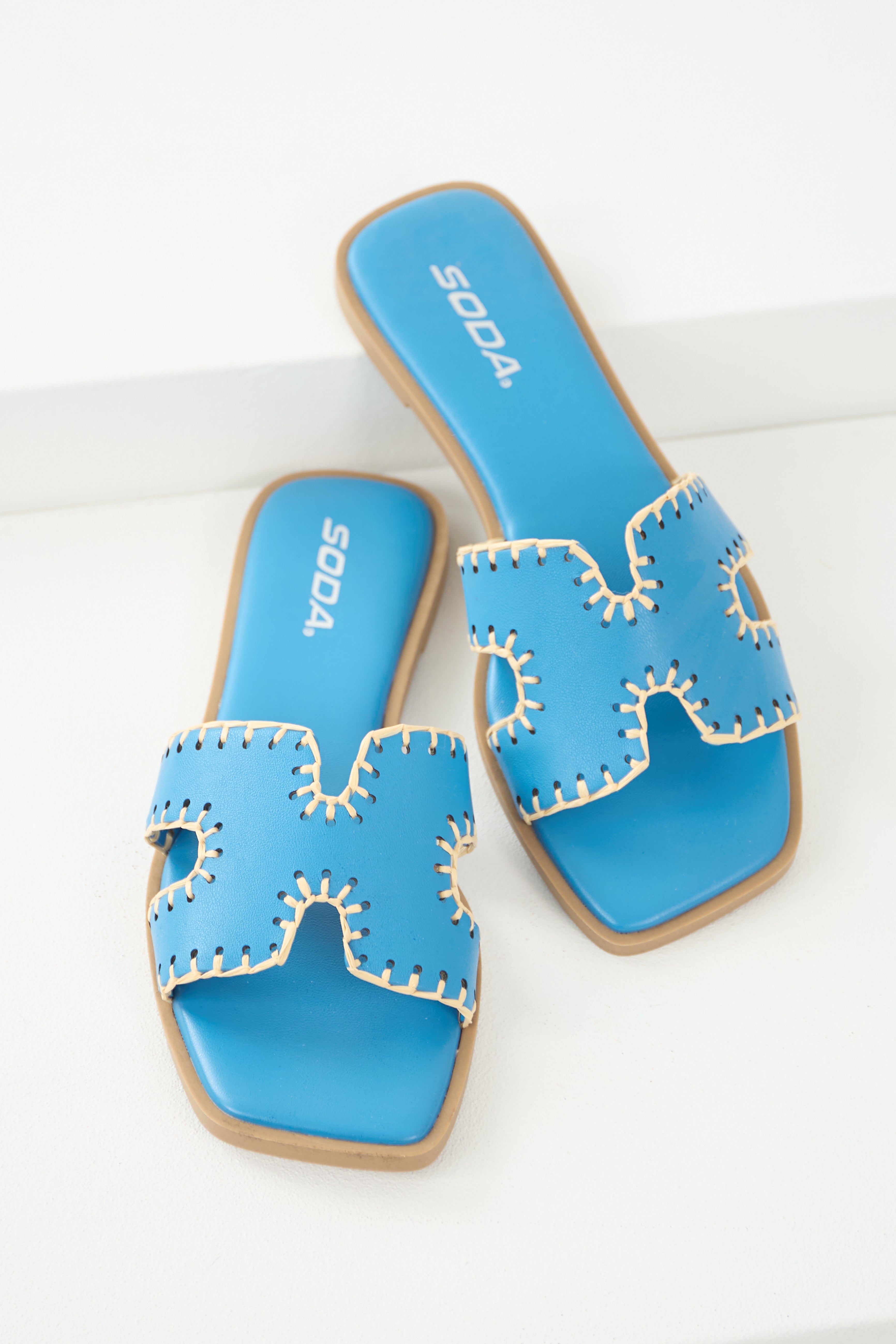 Azure Straw Trim Cut Out Strap Slide Sandals