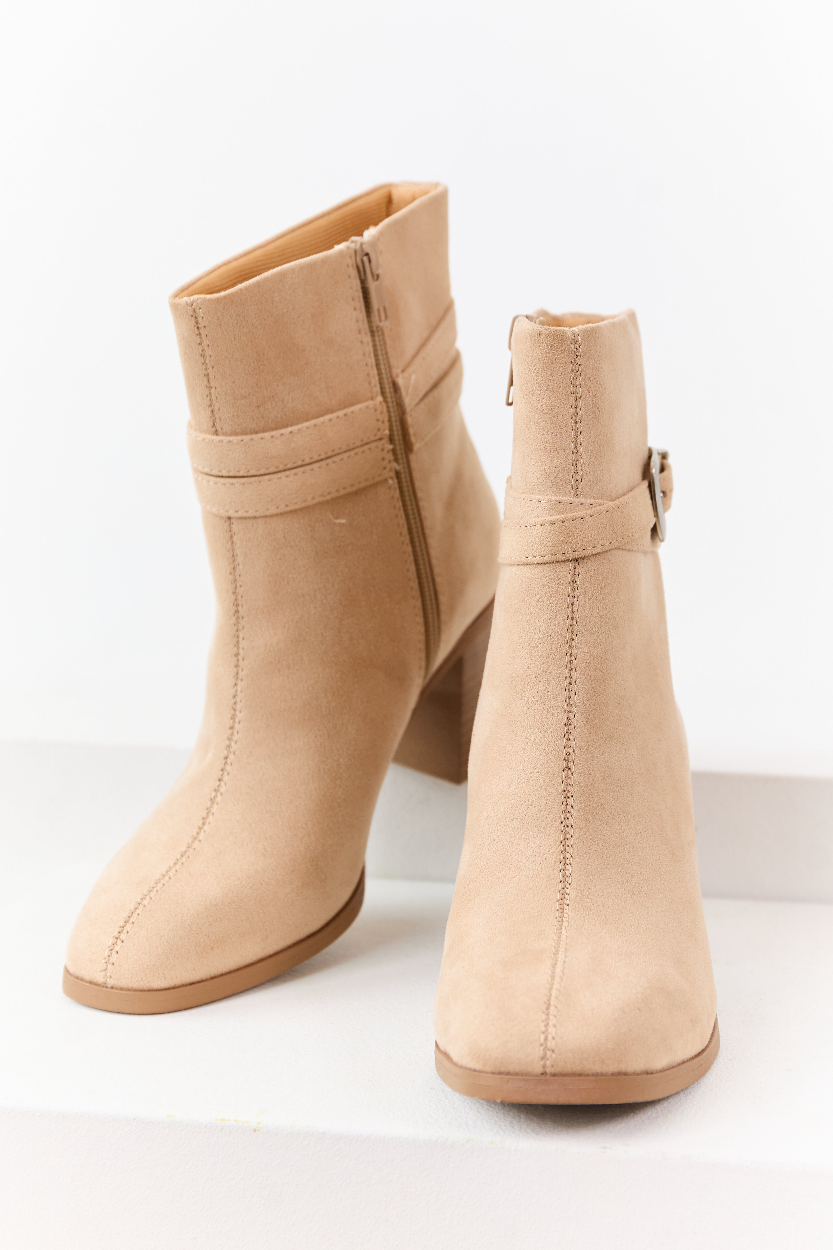 Beige Microsuede Block Heel Buckle Booties
