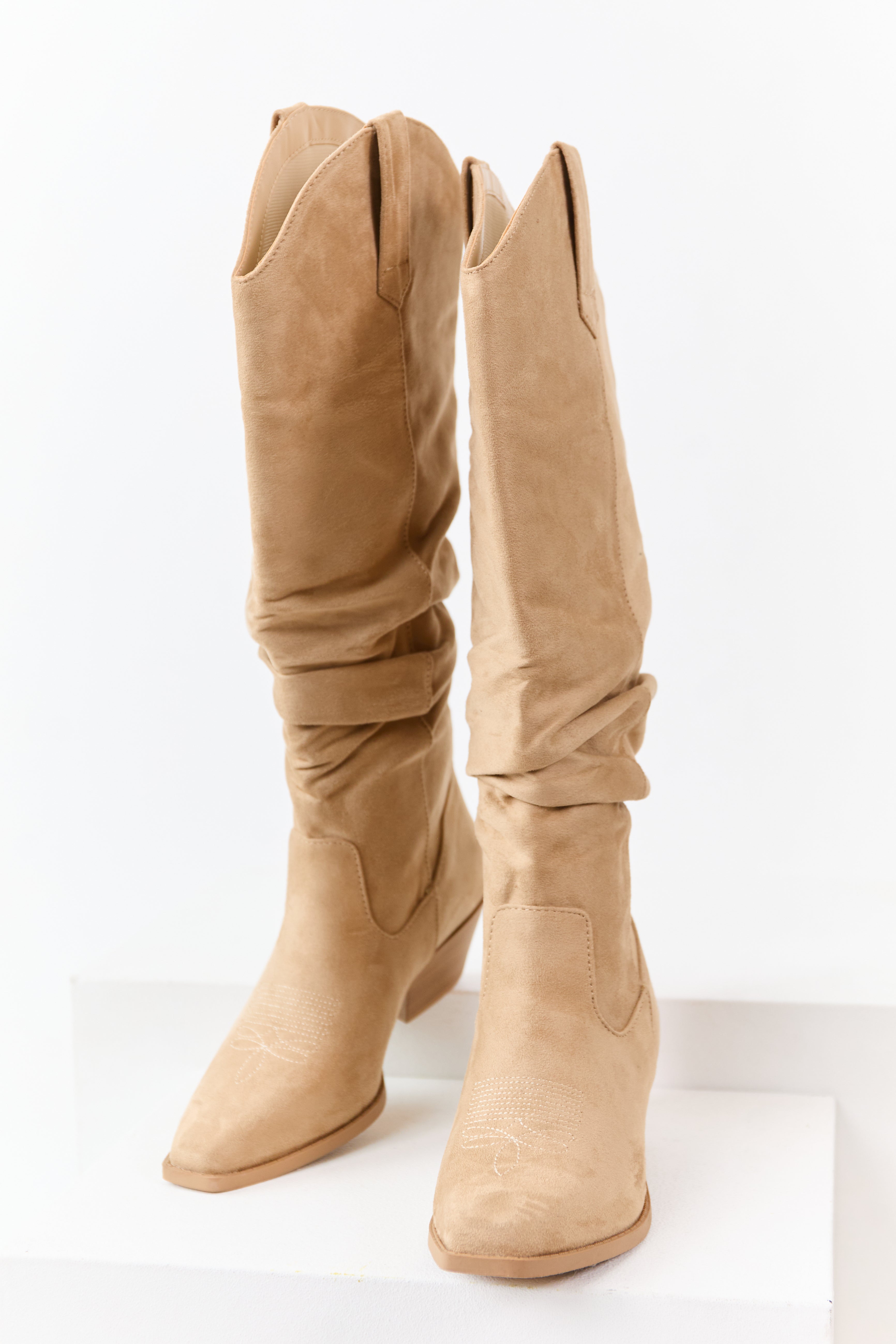Beige Microsuede Western Style Slouch Tall Boots