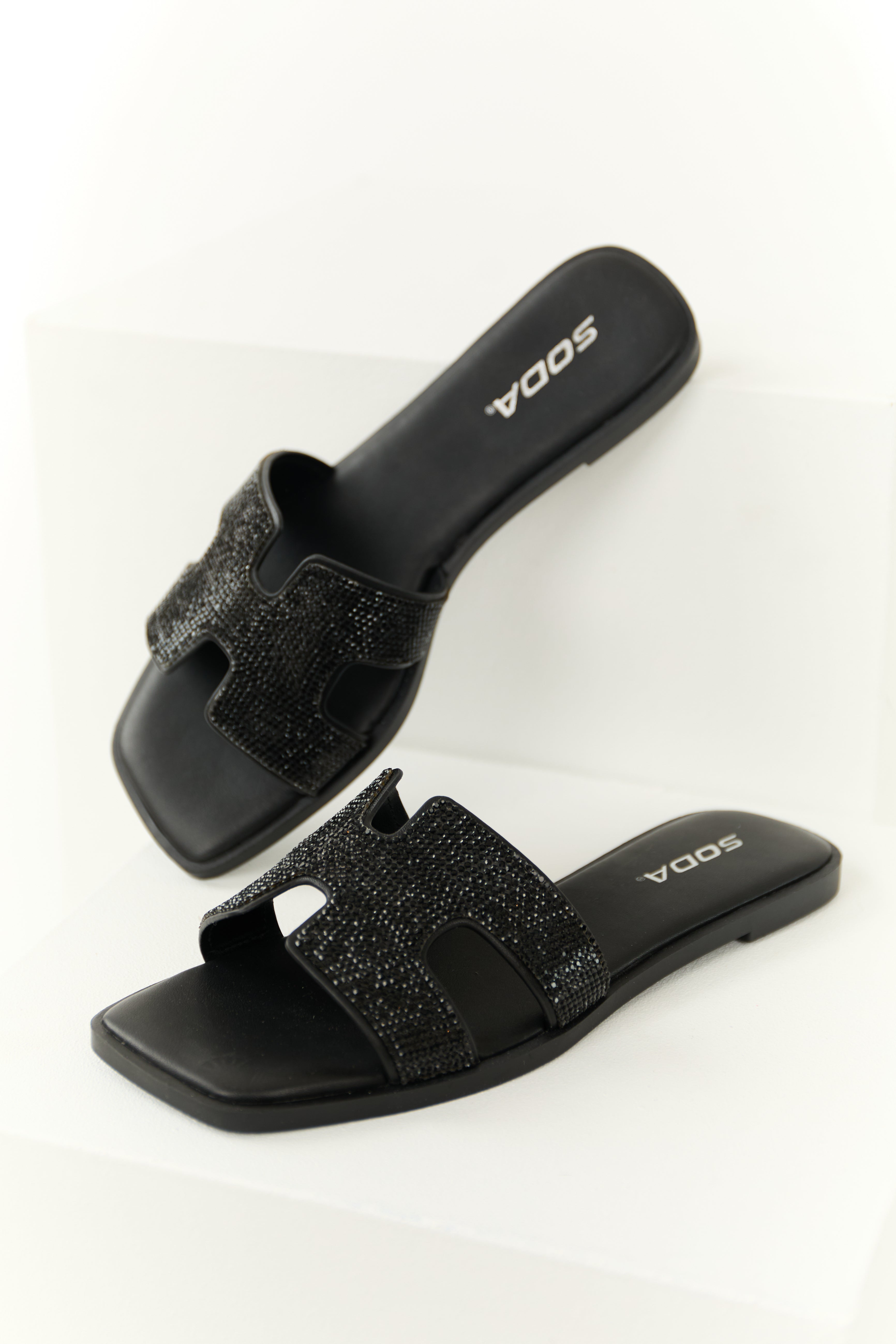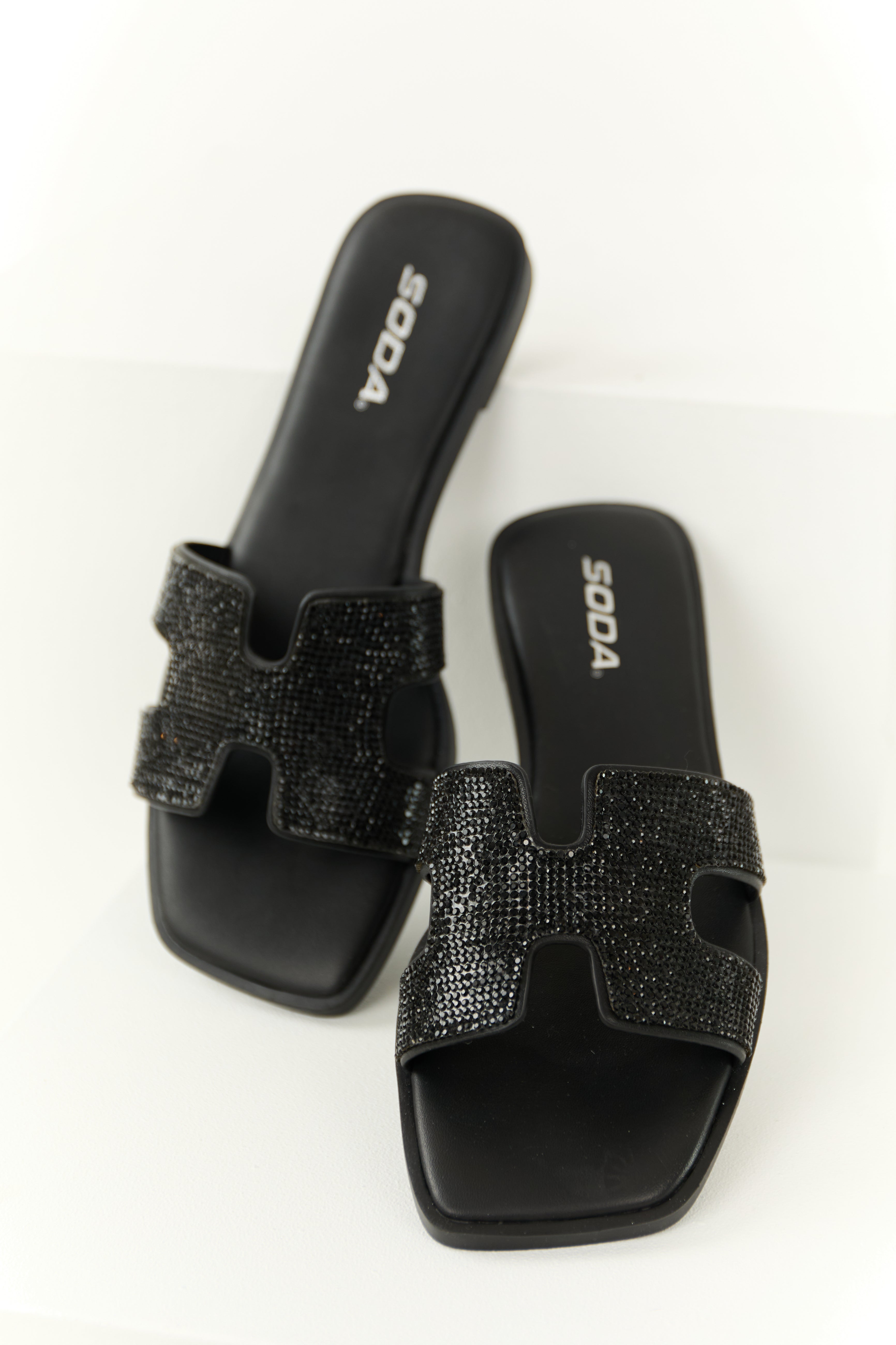 Black Rhinestone Open Toed Slip On Sandals