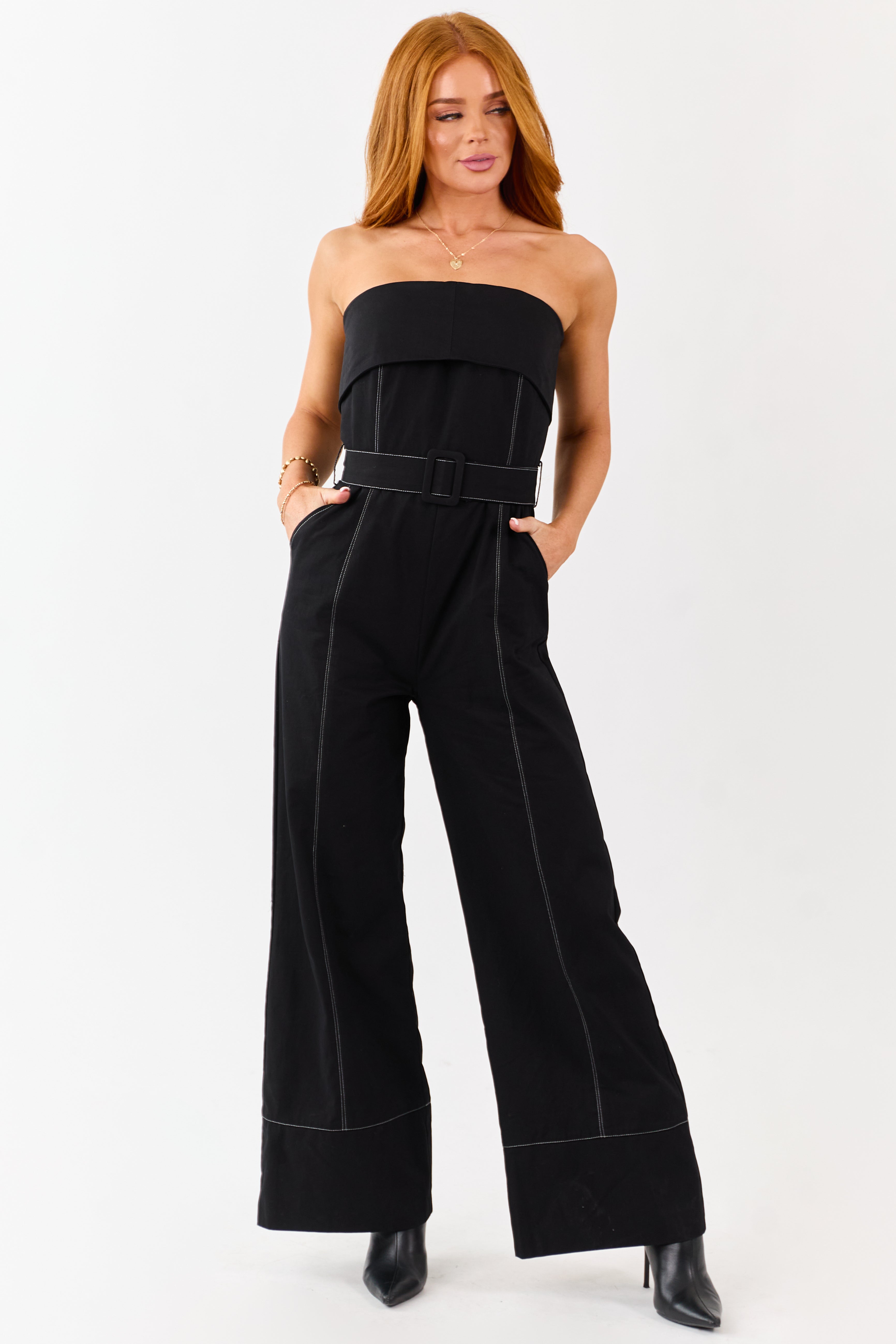 Black Cotton Strapless Contrast Stitching Jumpsuit