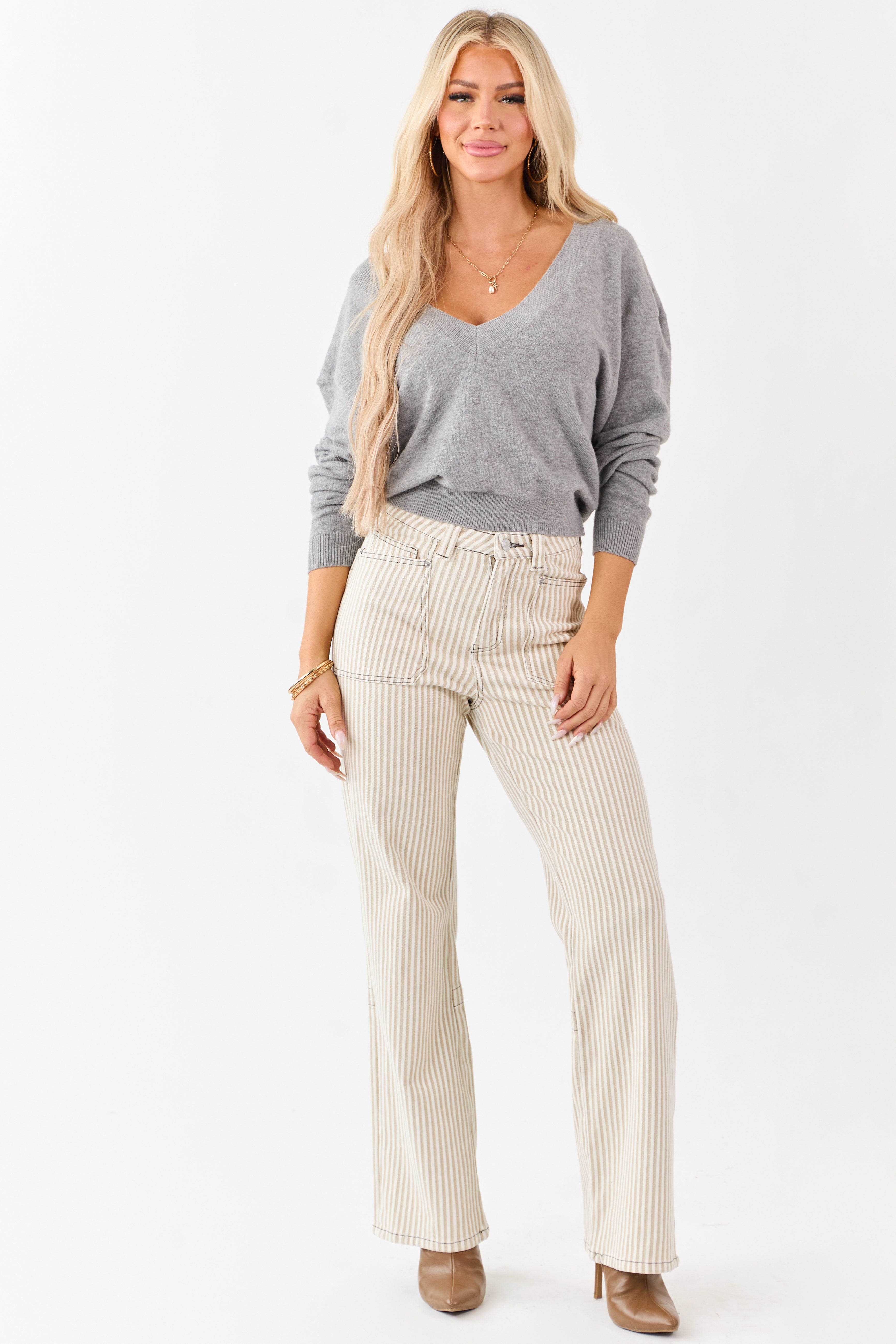 Mica Denim Oatmeal Striped Stretchy Straight Pants