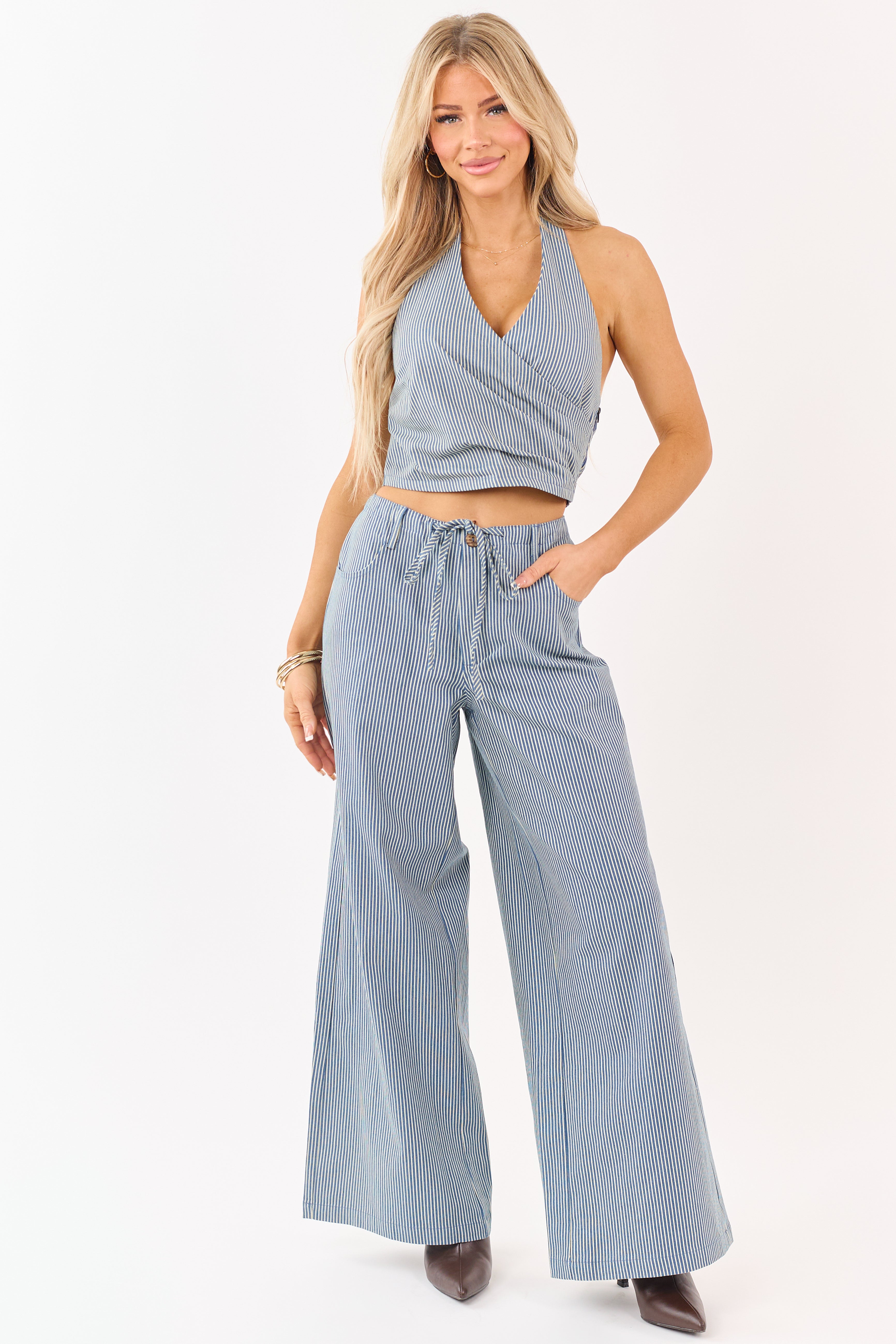 Steel Blue Pin Stripe Stretchy Denim Wide Leg Pants