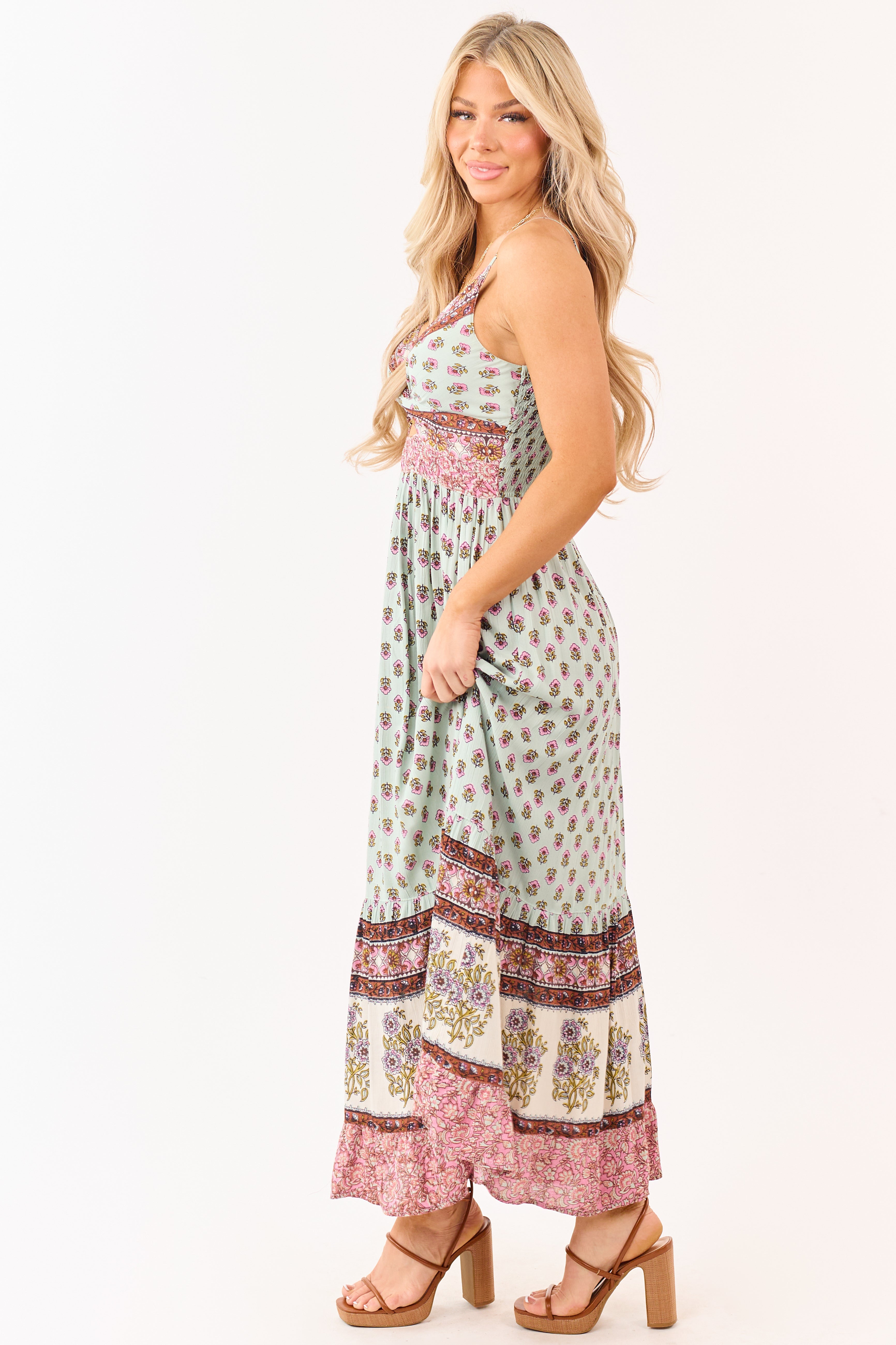 - Sleeveless and floor-length. this maxi dress features a front twist. subtle cut-out. and floral pattern for a playful. bohemian look