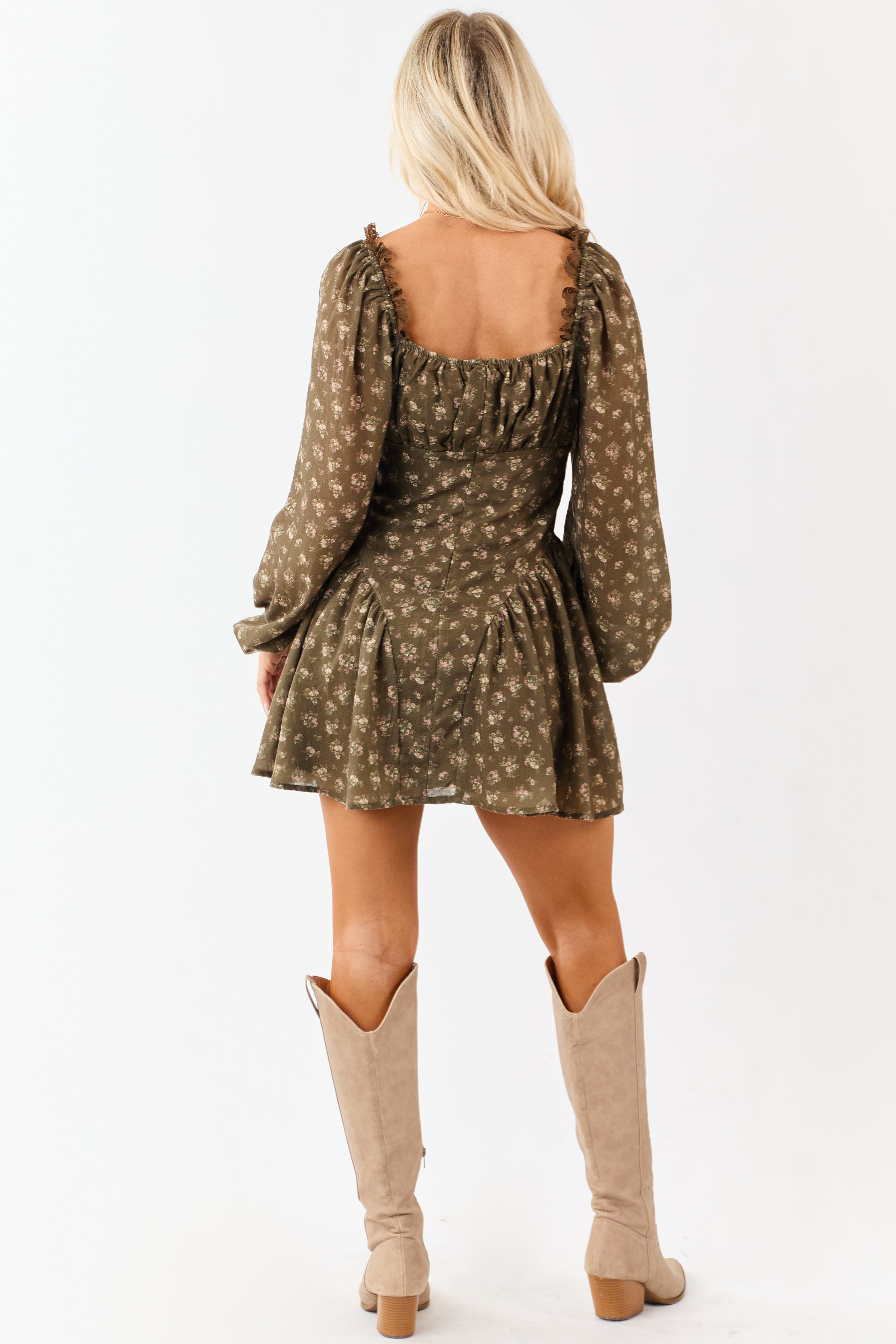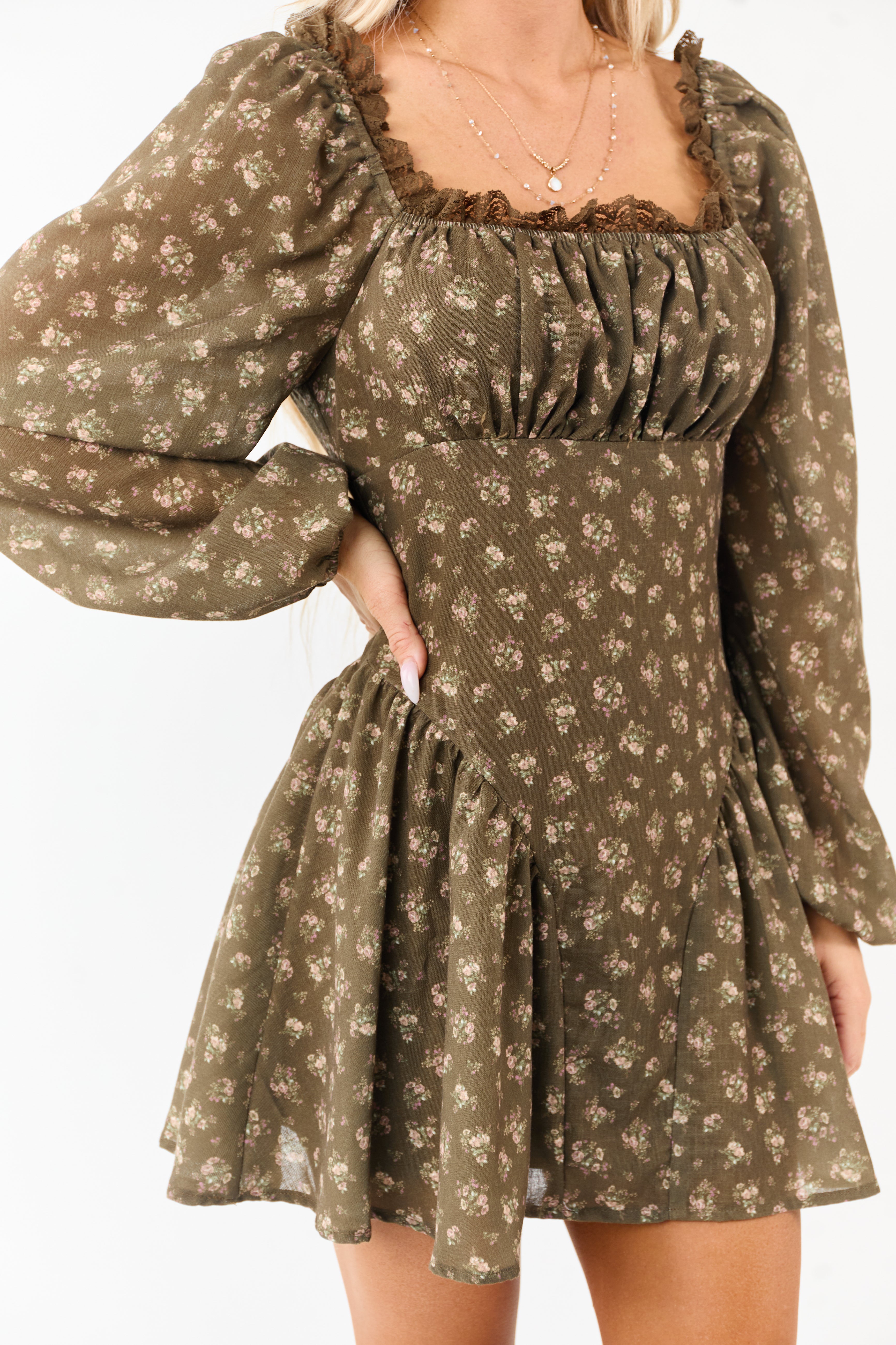 - Feminine charm meets earthy tones in this peasant style mini dress with a flared skirt and lace-trimmed neckline.