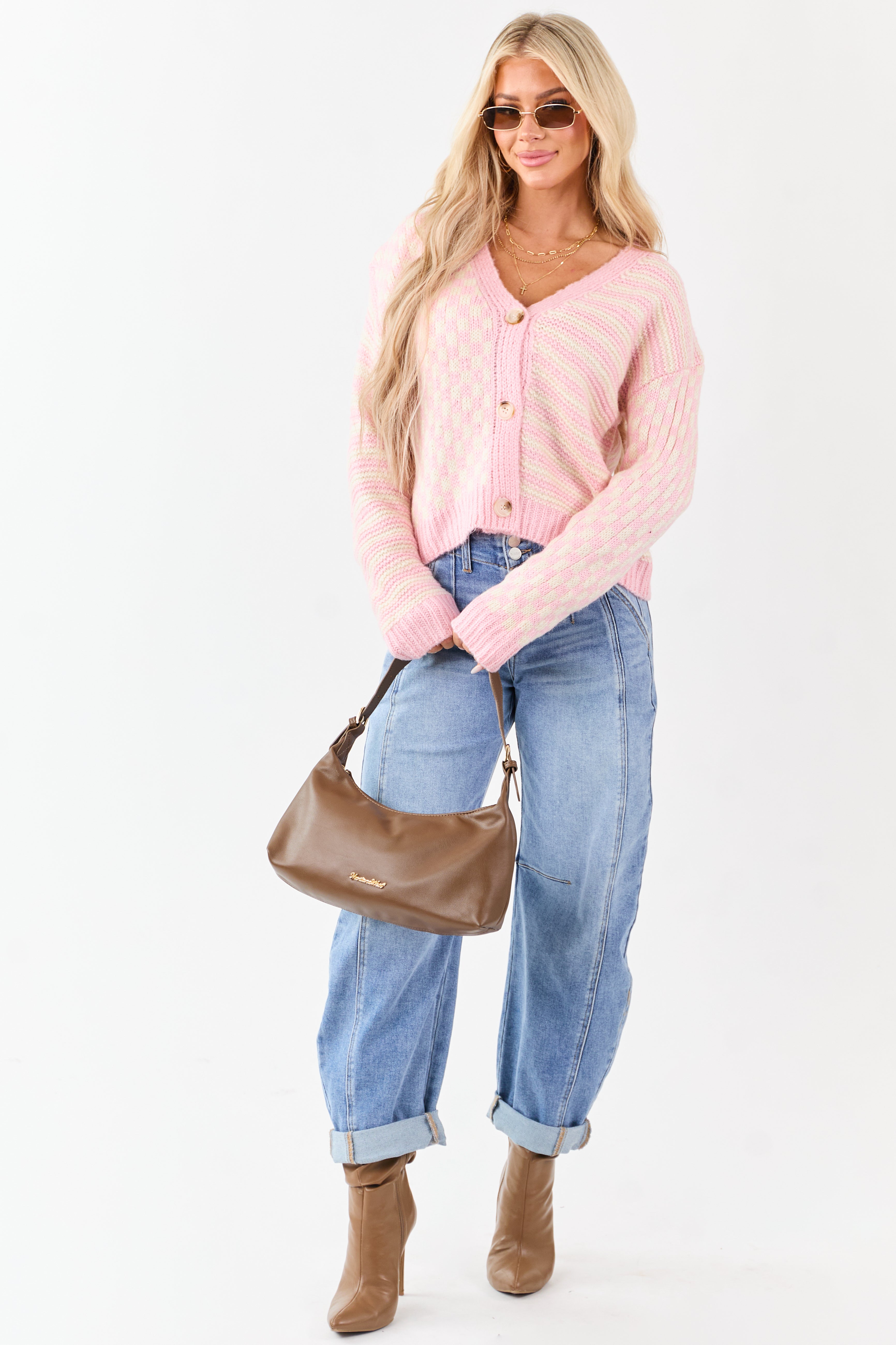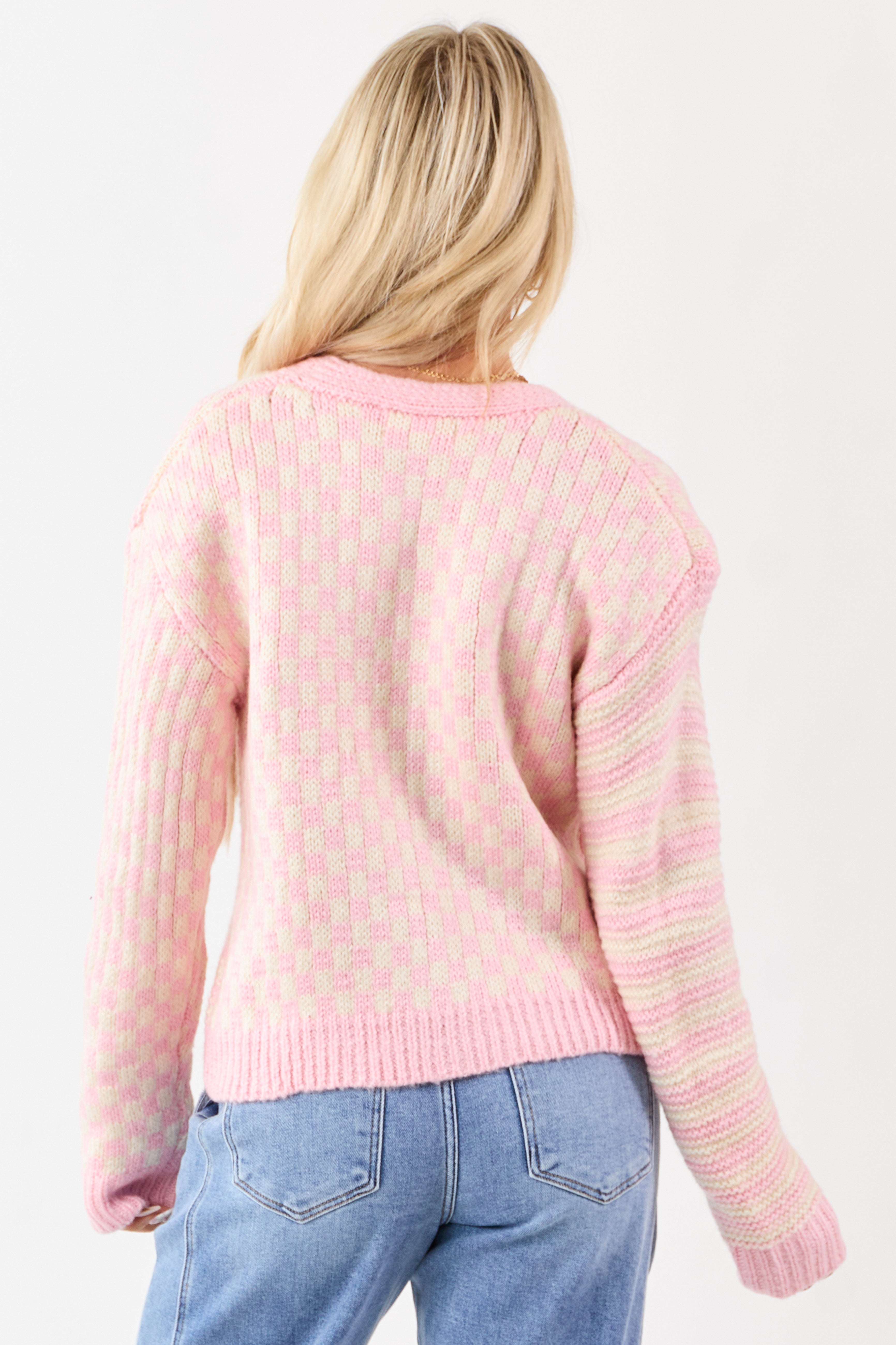 - Cozy yet eye-catching. this cardigan combines striped and checkered patterns for a fresh twist on knitwear.