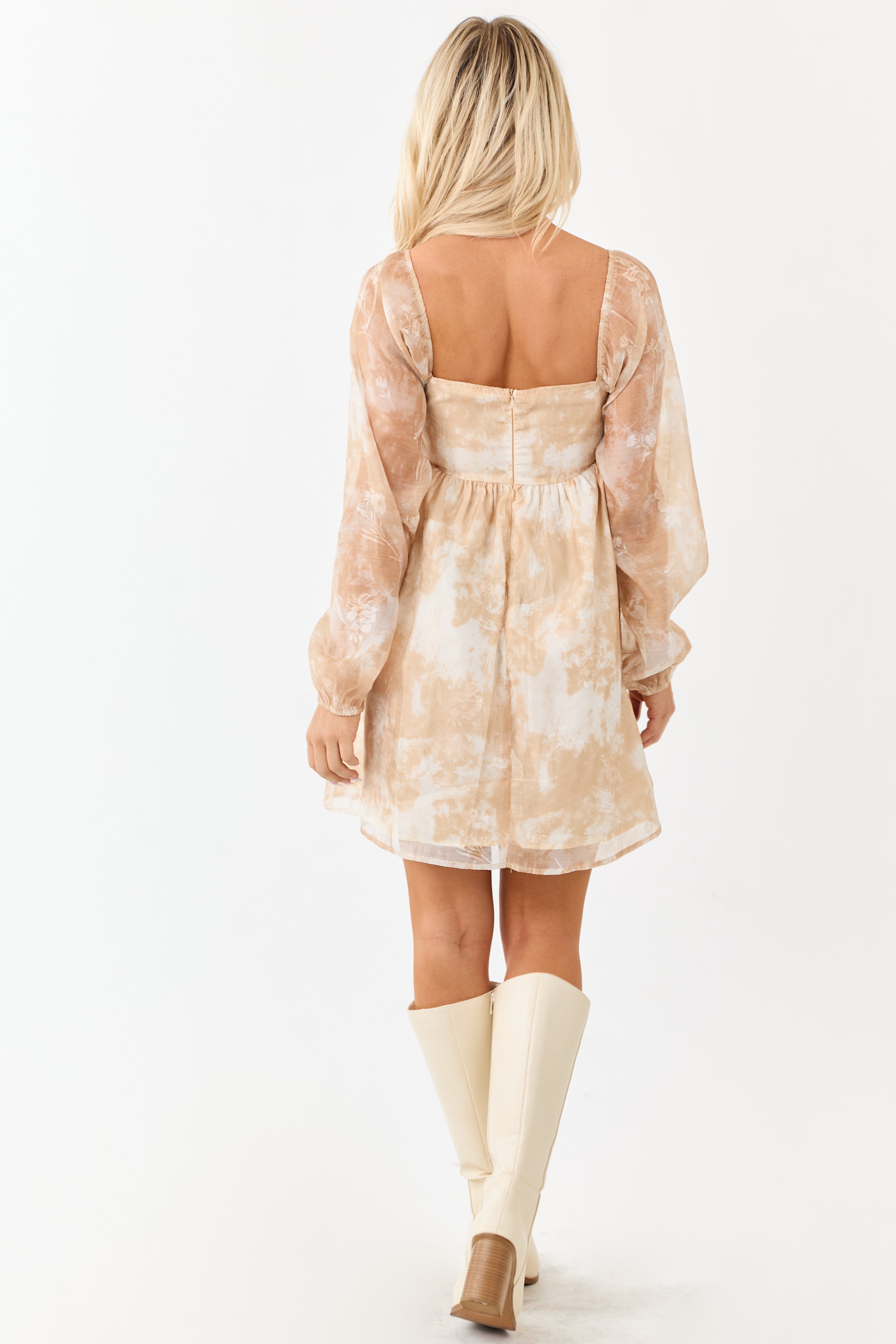 - Lightweight chiffon meets floral jacquard in this pleated babydoll dress with sheer sleeves and a flirty mini length.
