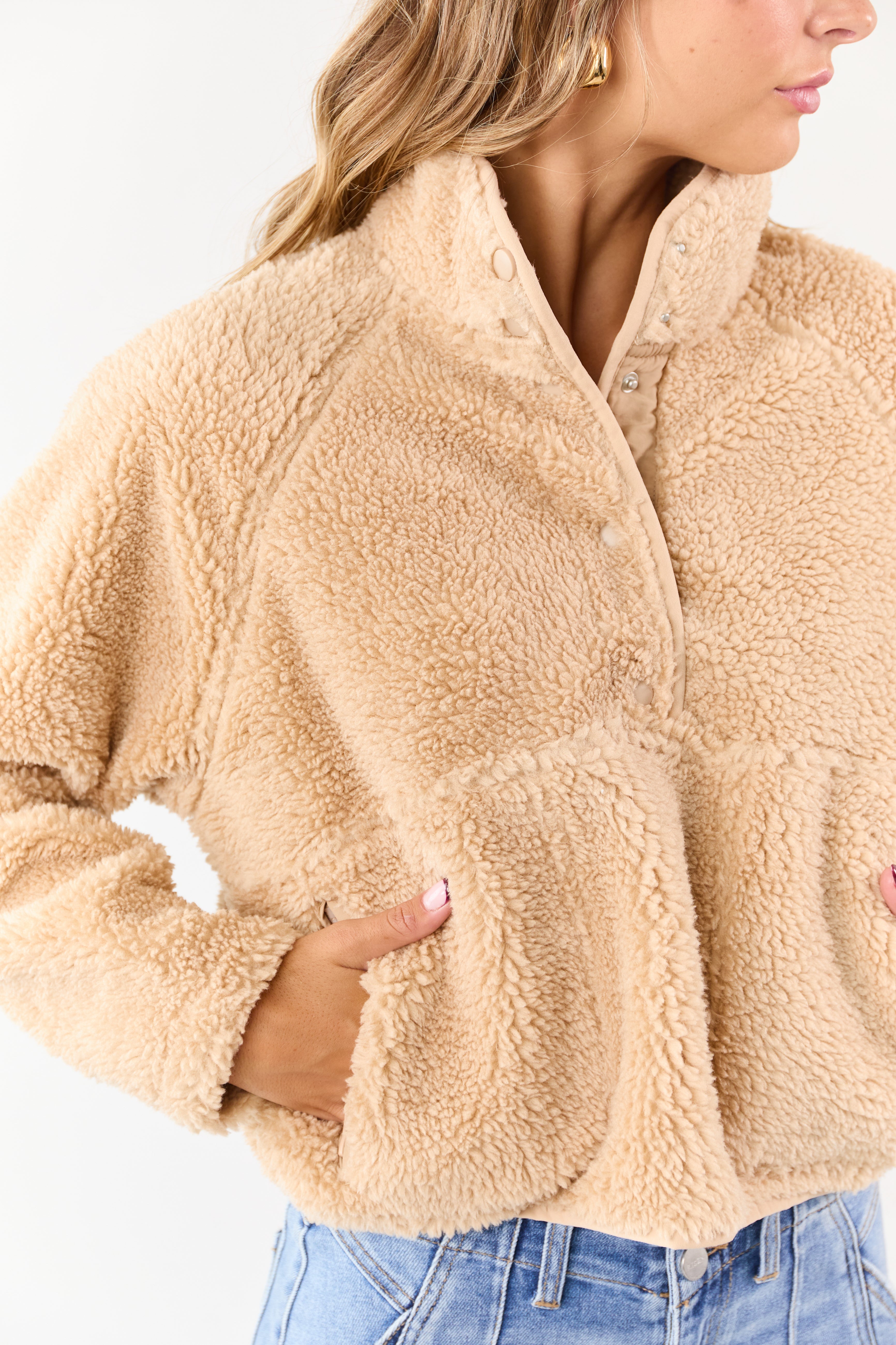 - Soft sherpa texture meets everyday comfort in this pullover jacket with a mock neck and snap-button front.