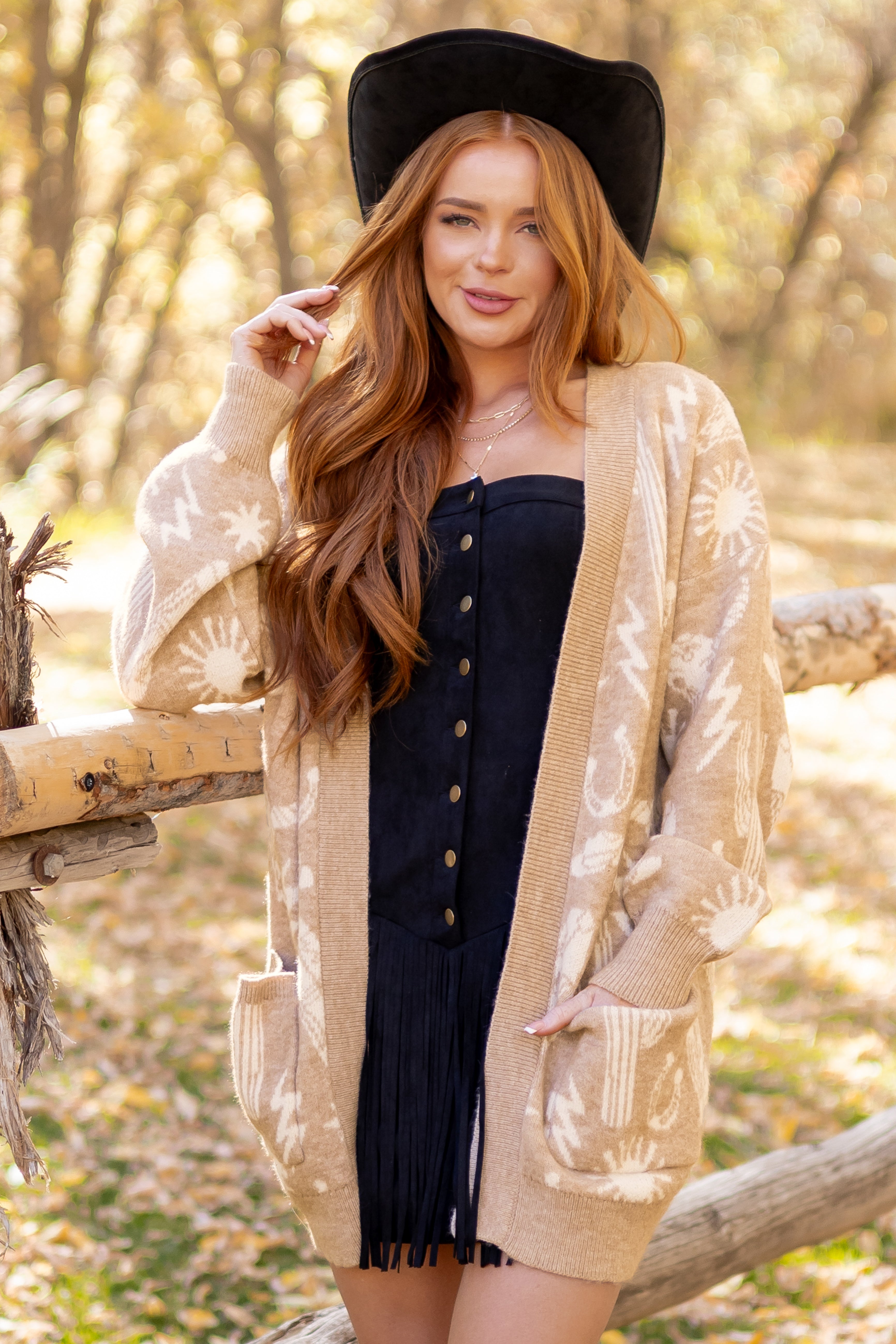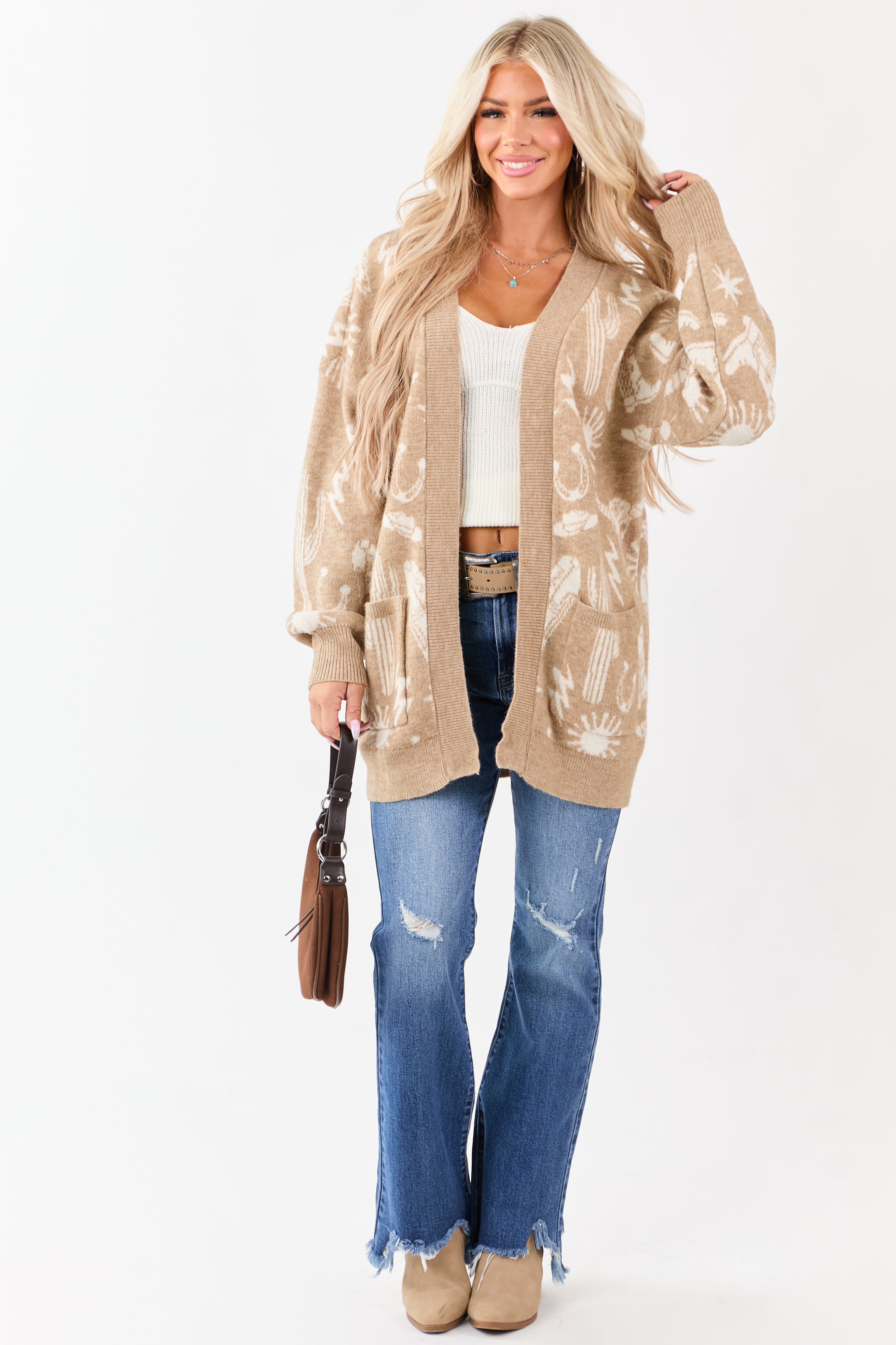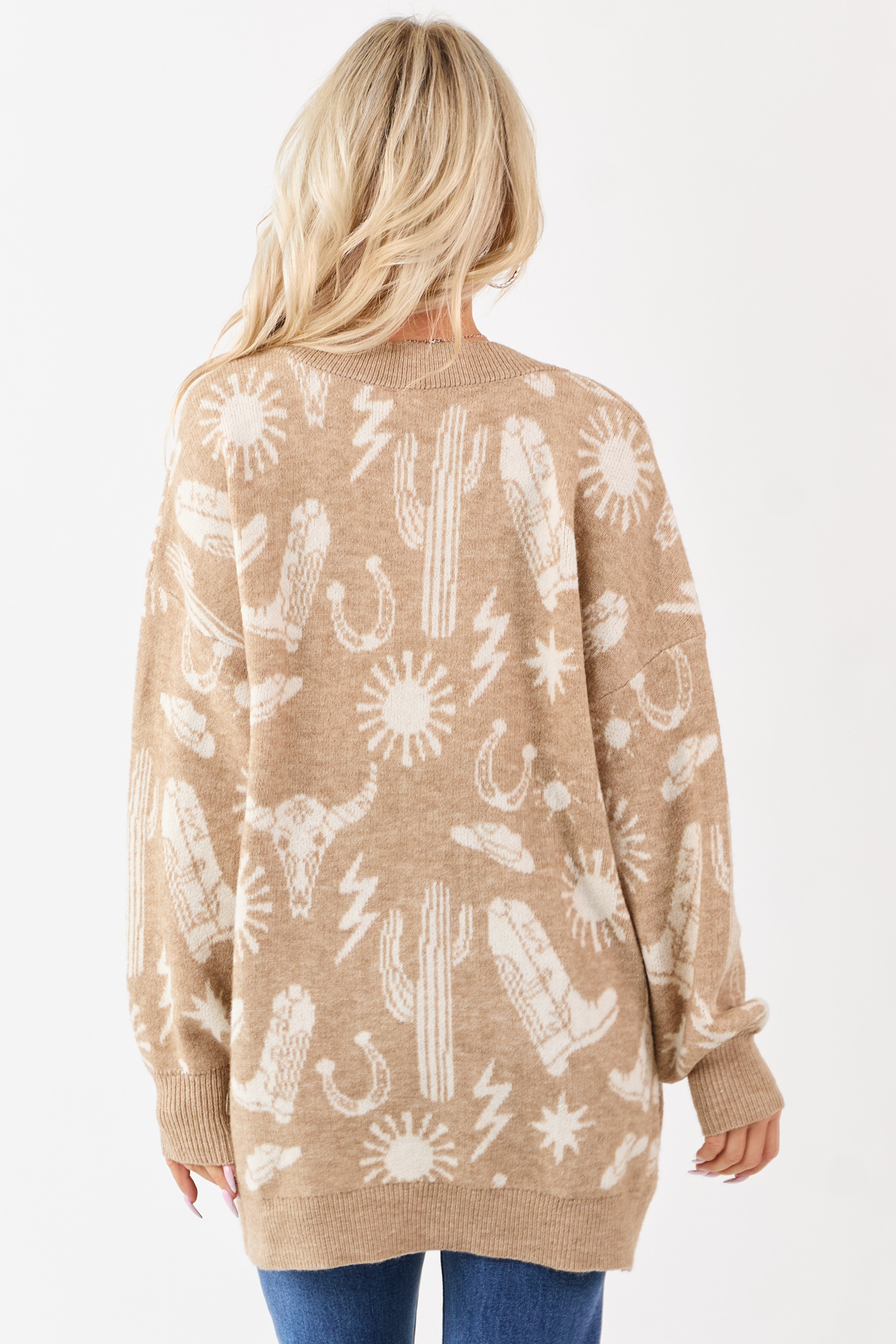 - Western-inspired design meets everyday comfort in this cardigan with a relaxed fit and open front.