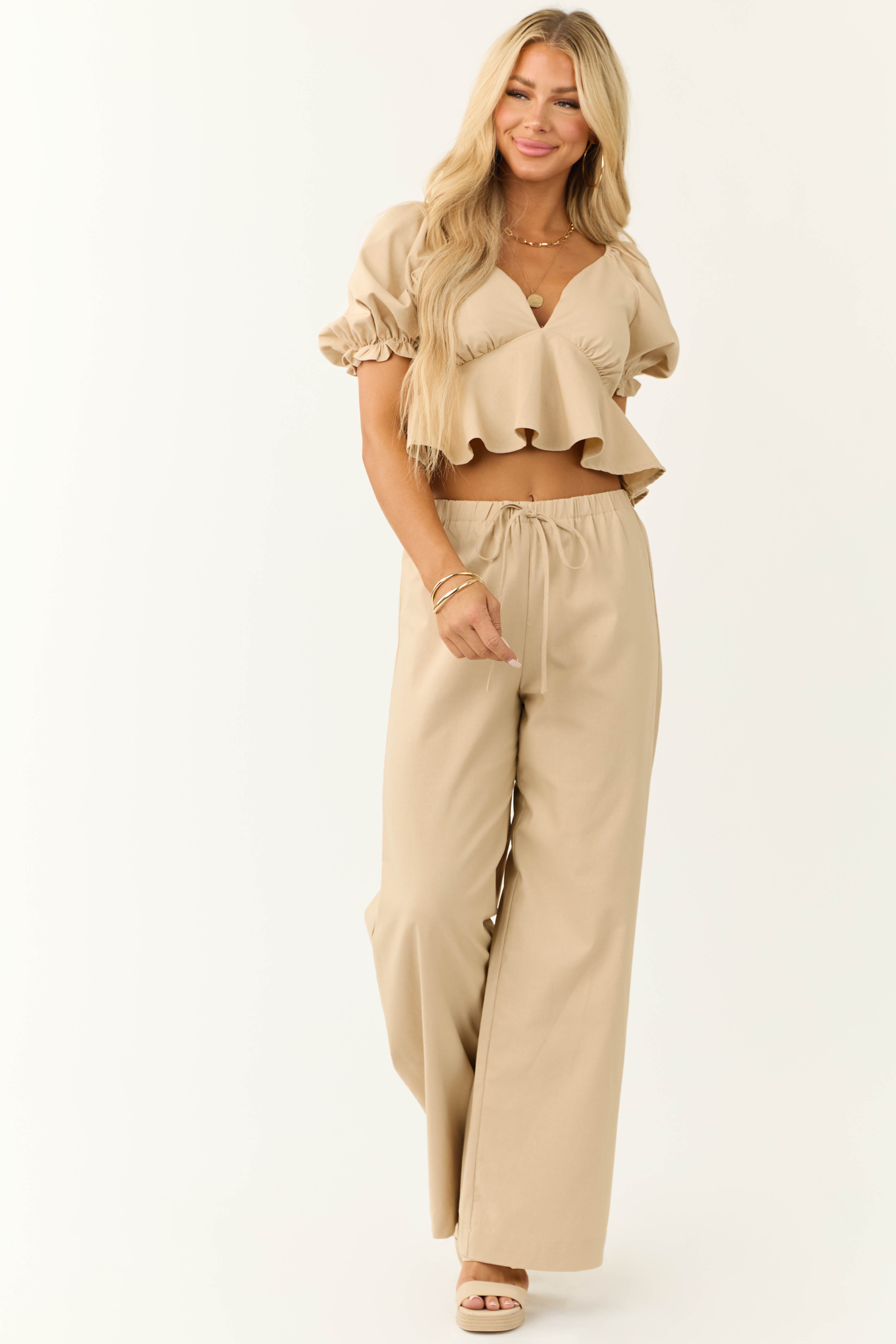 - Pair with Beige Short Puff Sleeve Deep V Neck Top