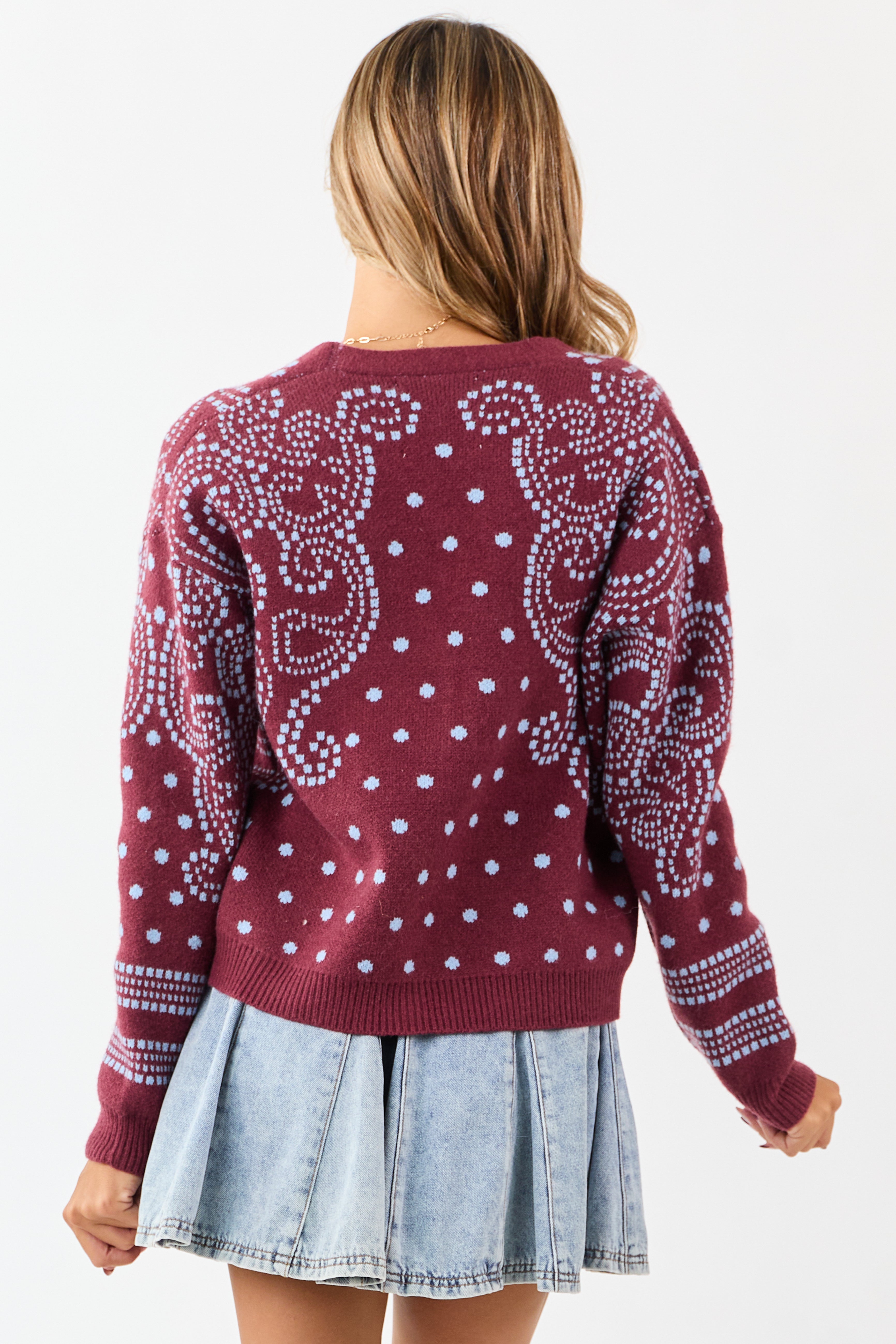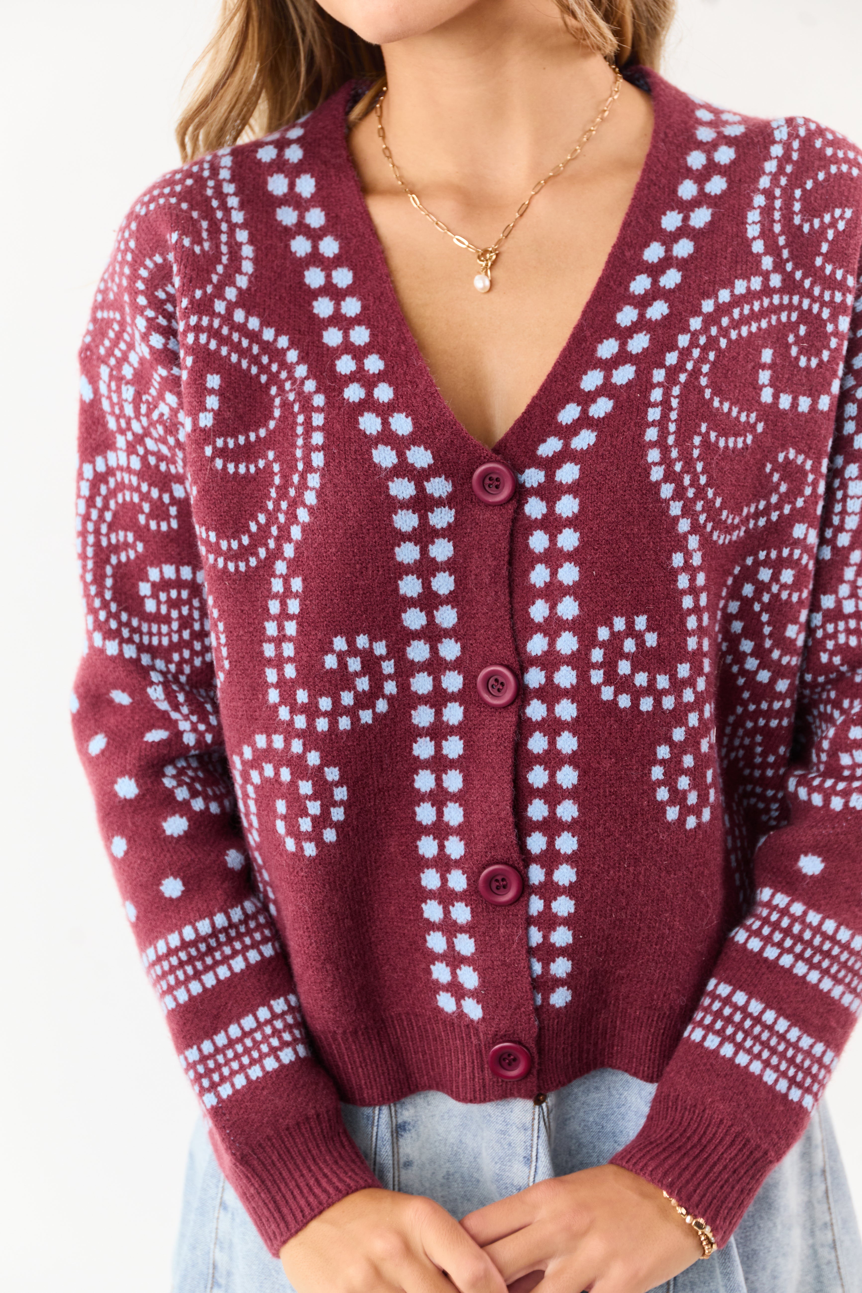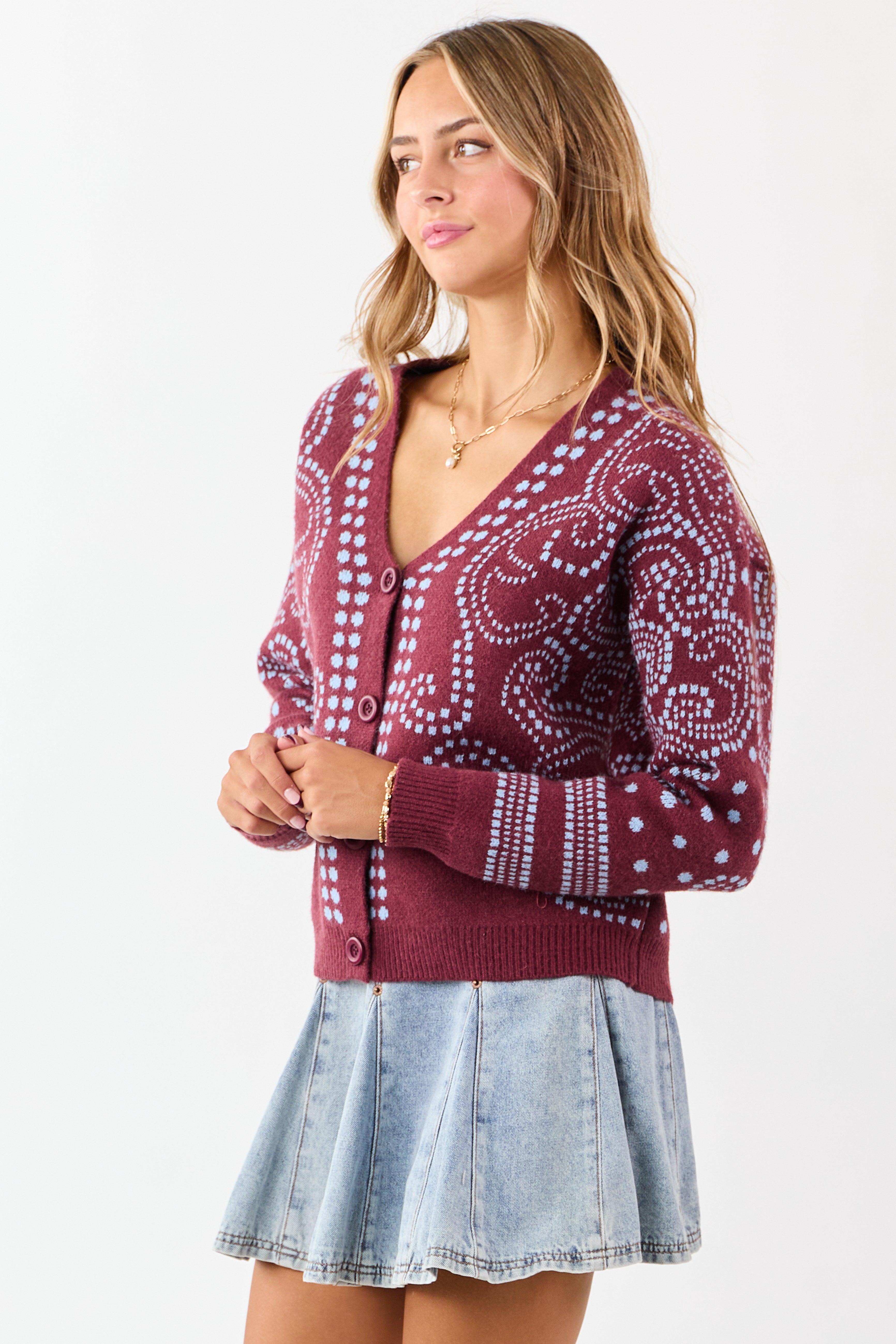 - Elevate your knitwear with this dot art cardigan—classic button down style with a vibrant twist.