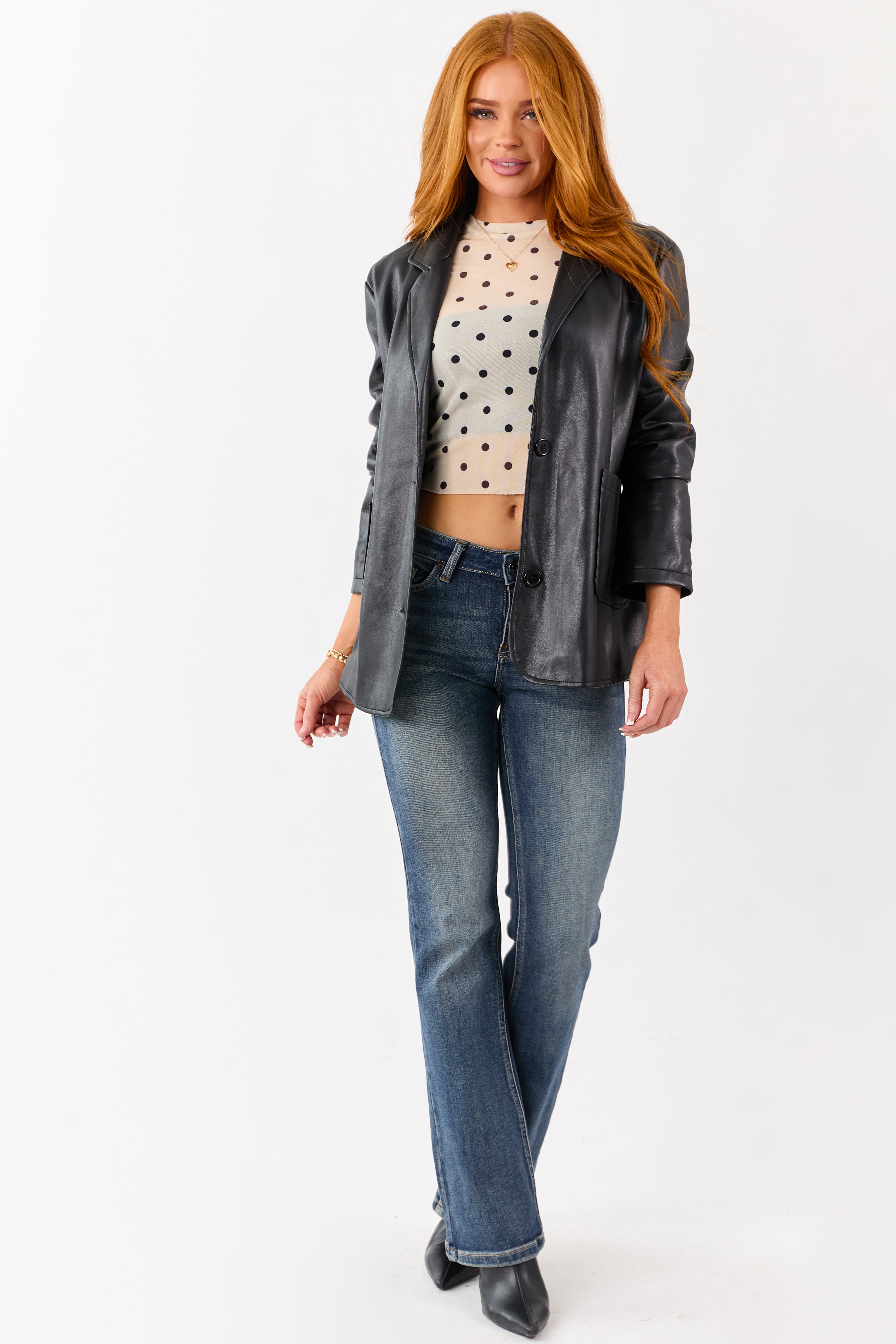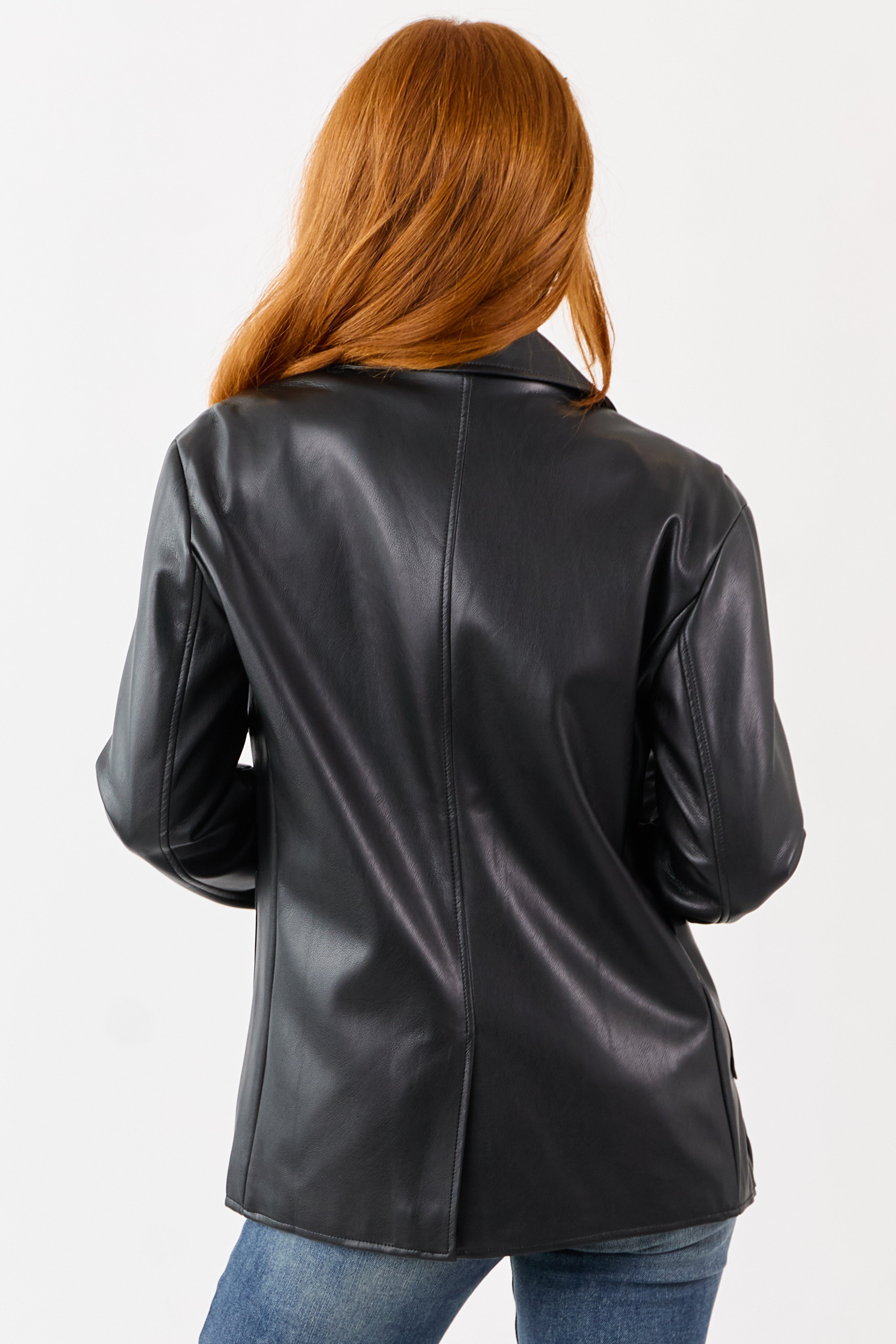 - Sleek and timeless—this lapel-collared faux leather jacket is a wardrobe must-have.