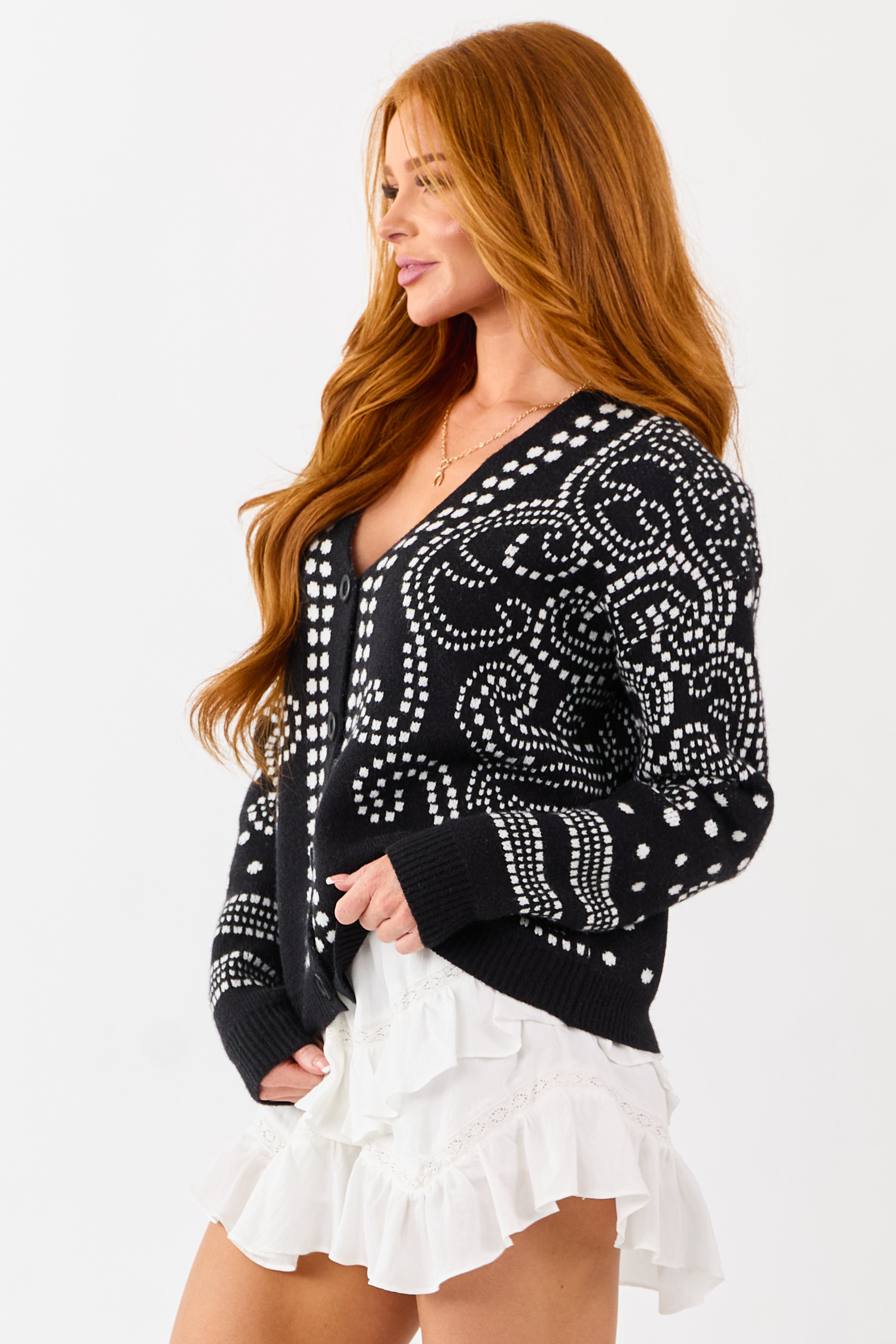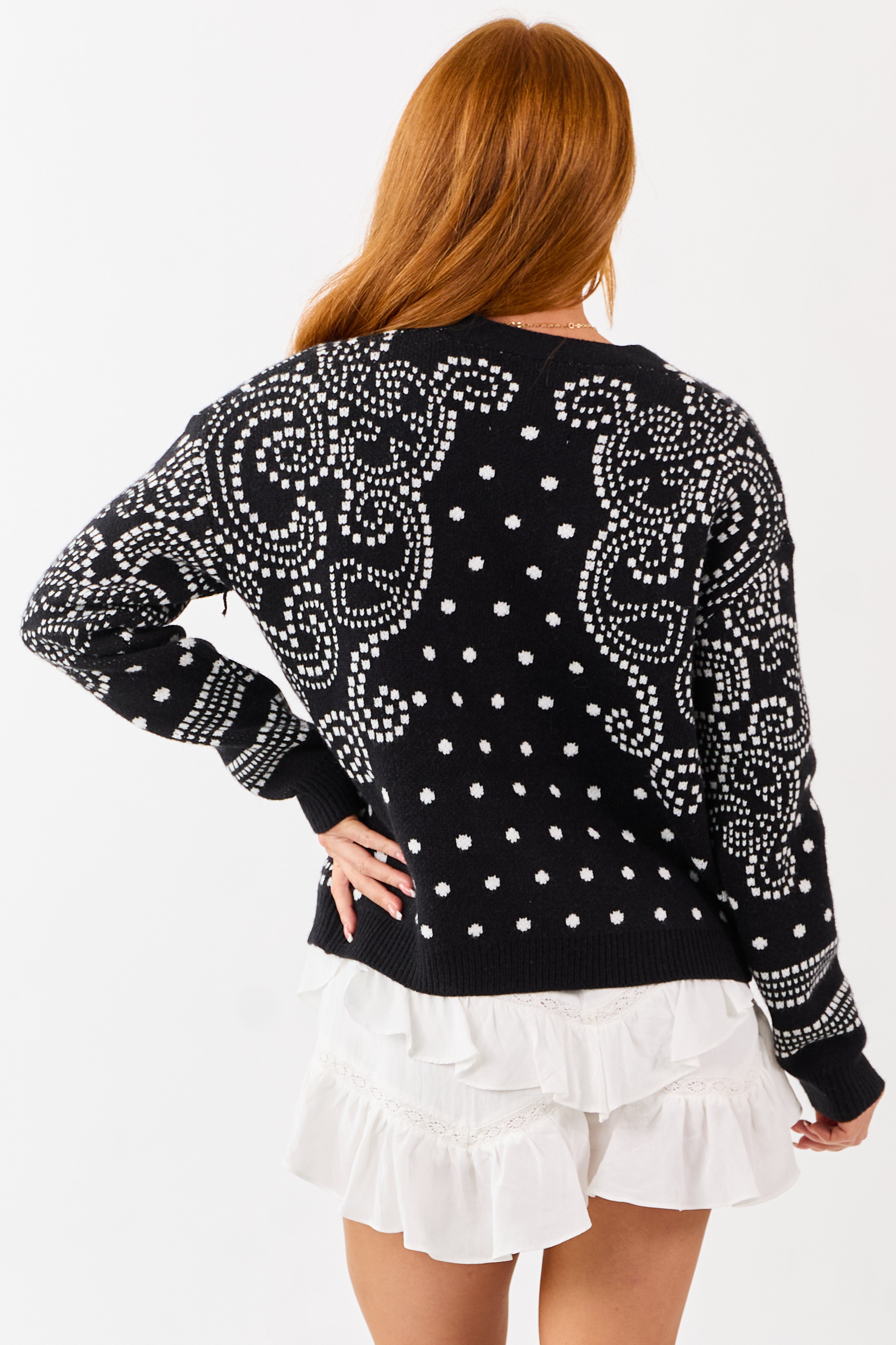 - Elevate your knitwear with this Western paisley bandana printed cardigan—classic button down style with a vibrant twist.