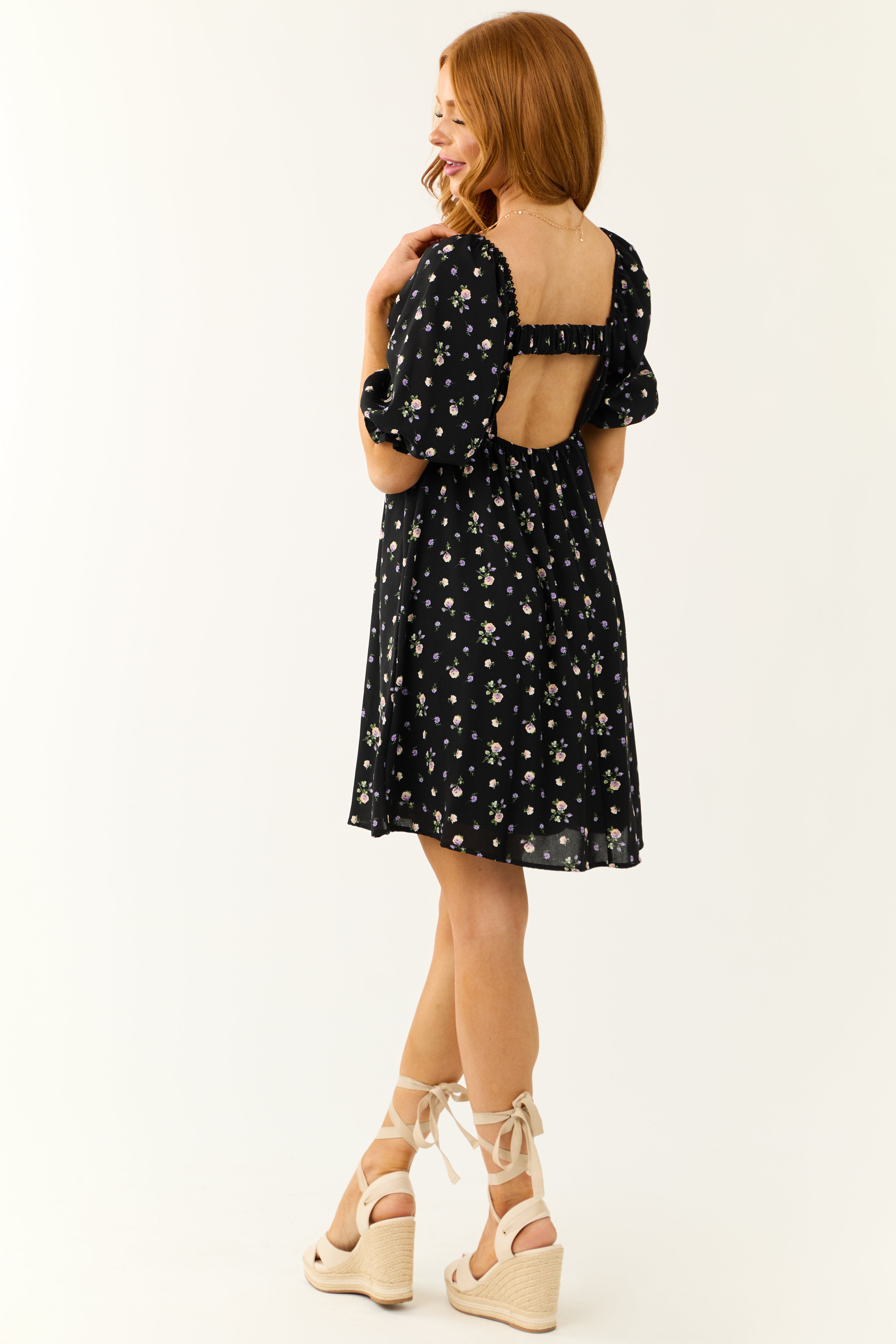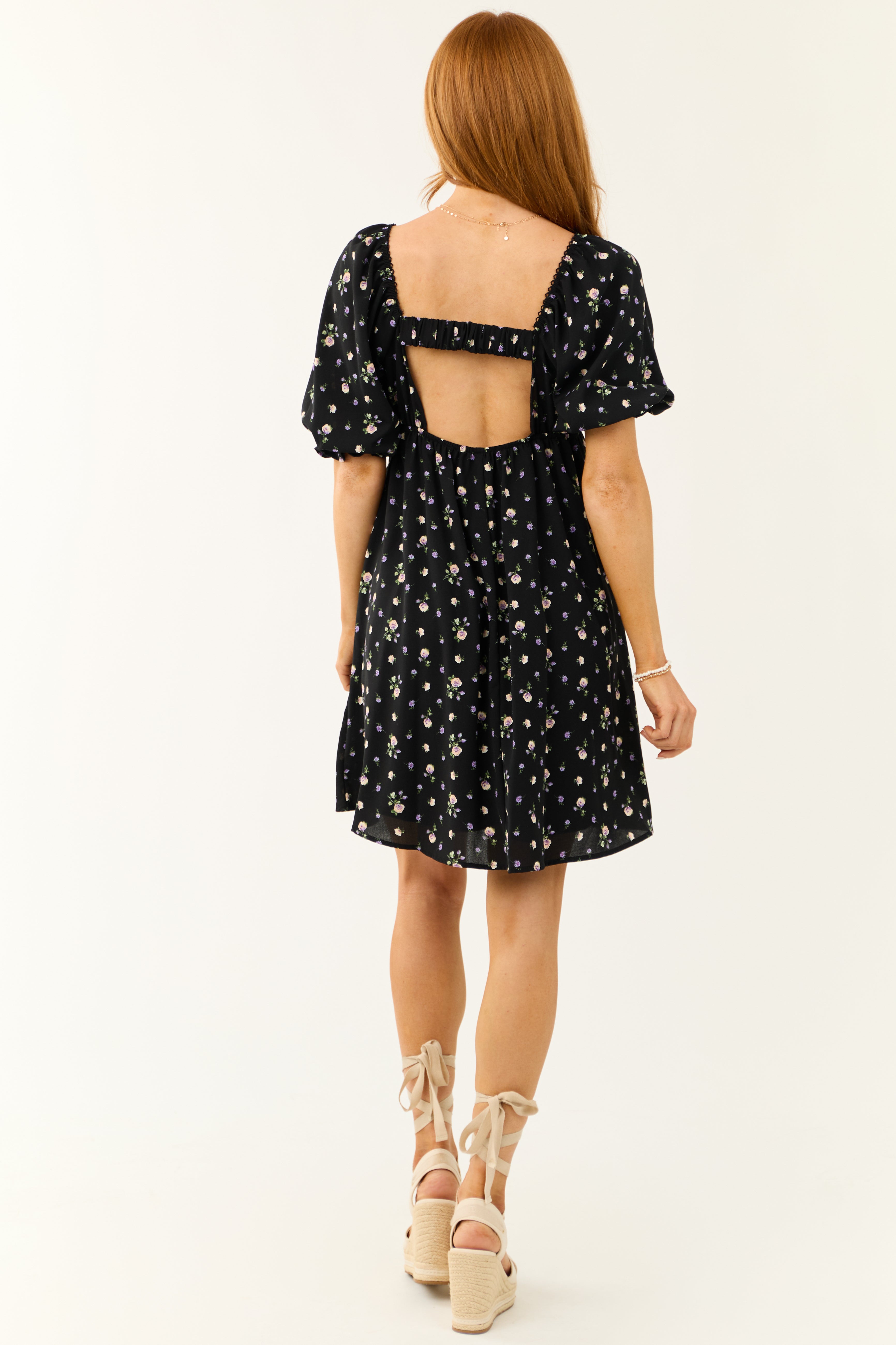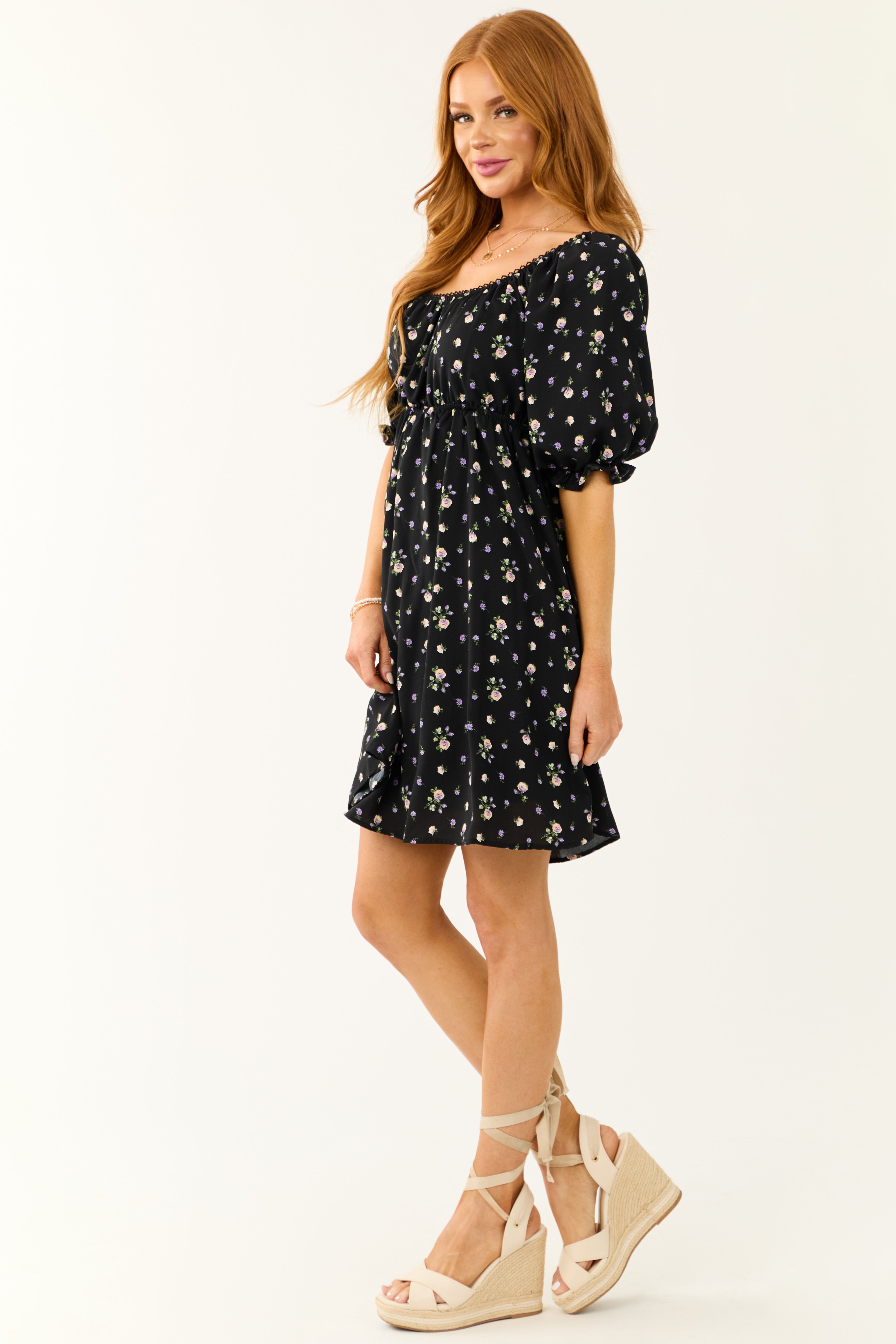 - Floral print in shades of Black. Violet. Peach. Ivory. and Hunter Green