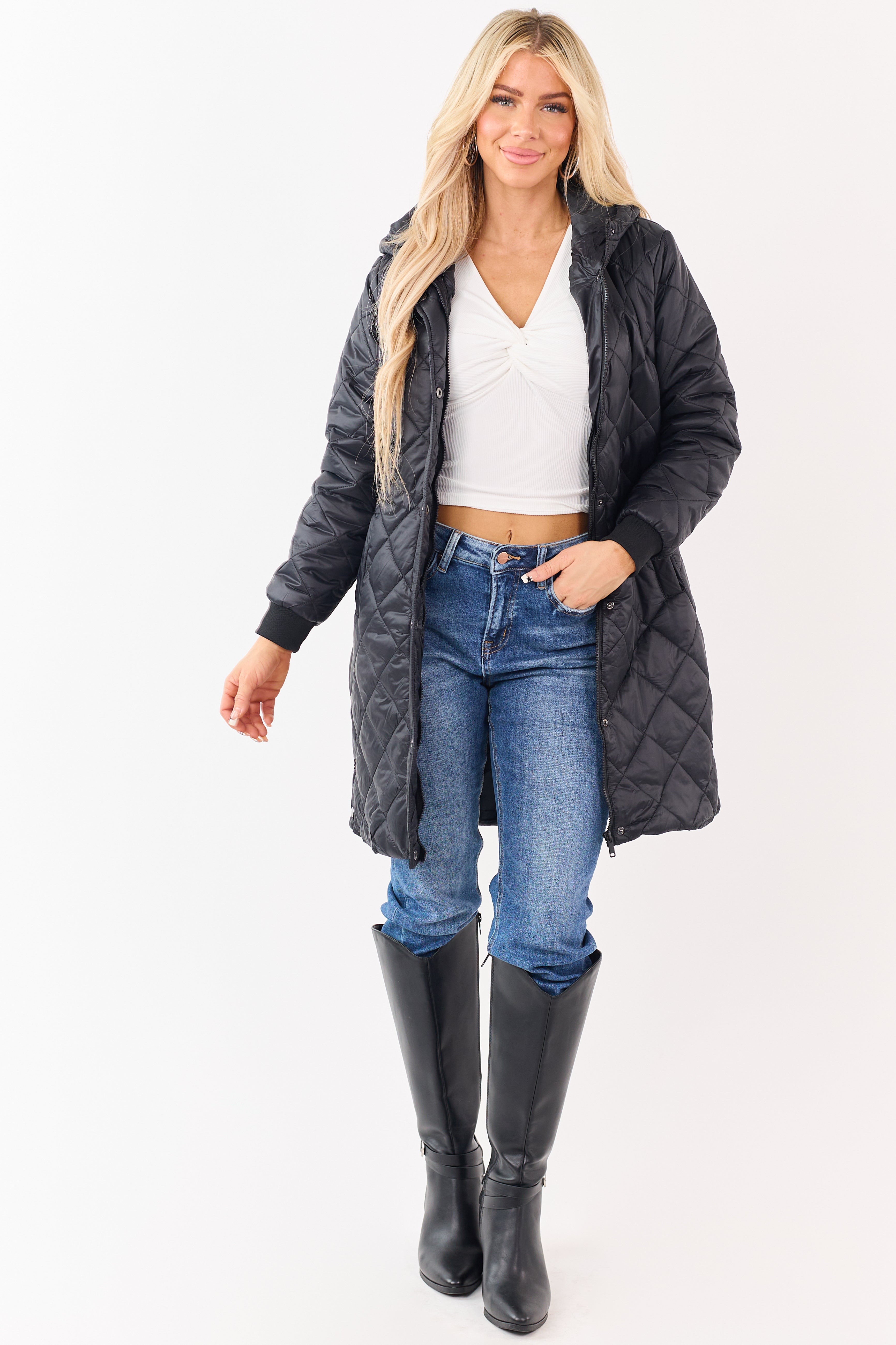 - Stay warm in style with this quilted puffer long coat. designed with a cozy hood and sleek zip-up front for ultimate winter comfort