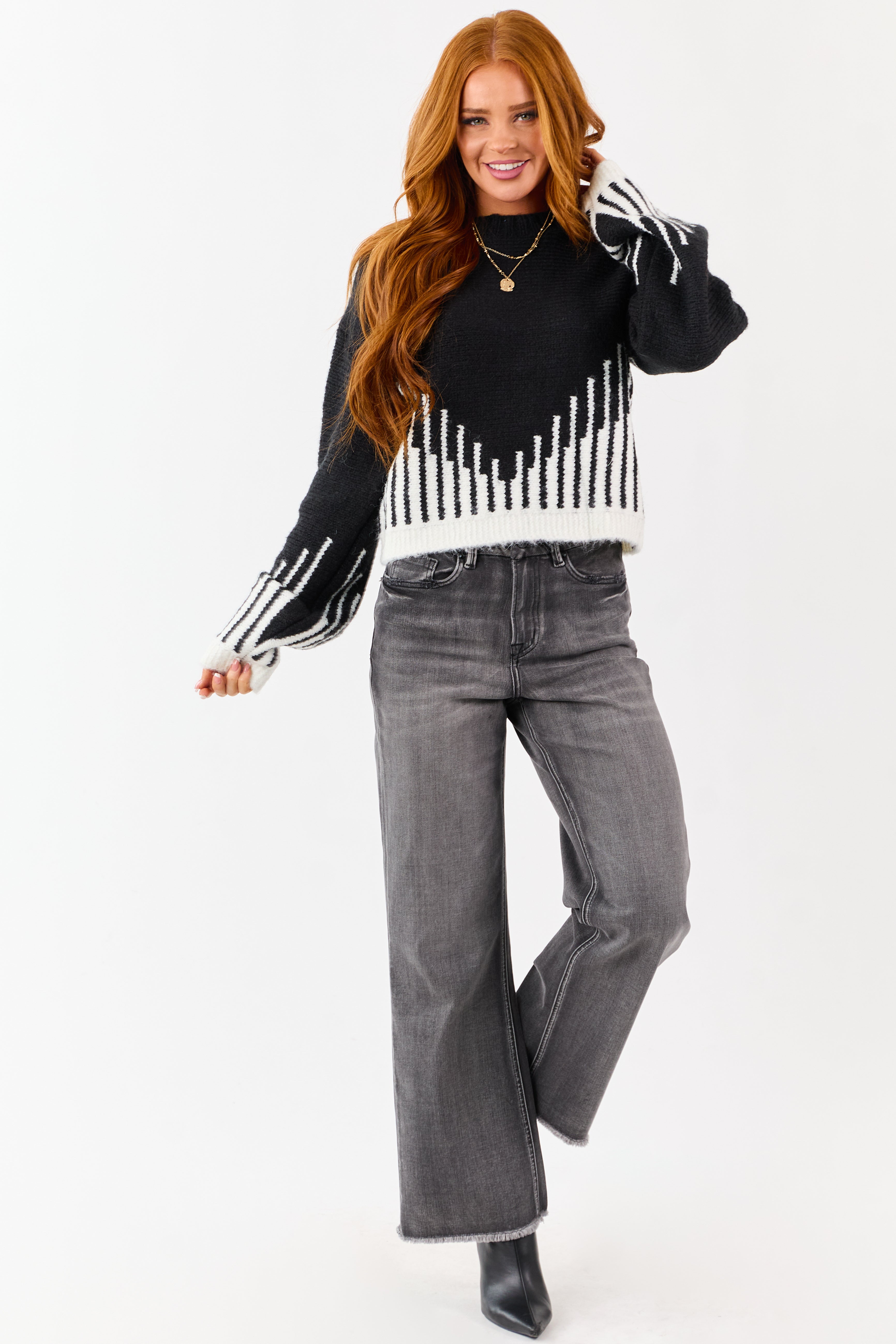- This relaxed knit sweater features a bold contrast abstract print and is made in a warm wool blend.
