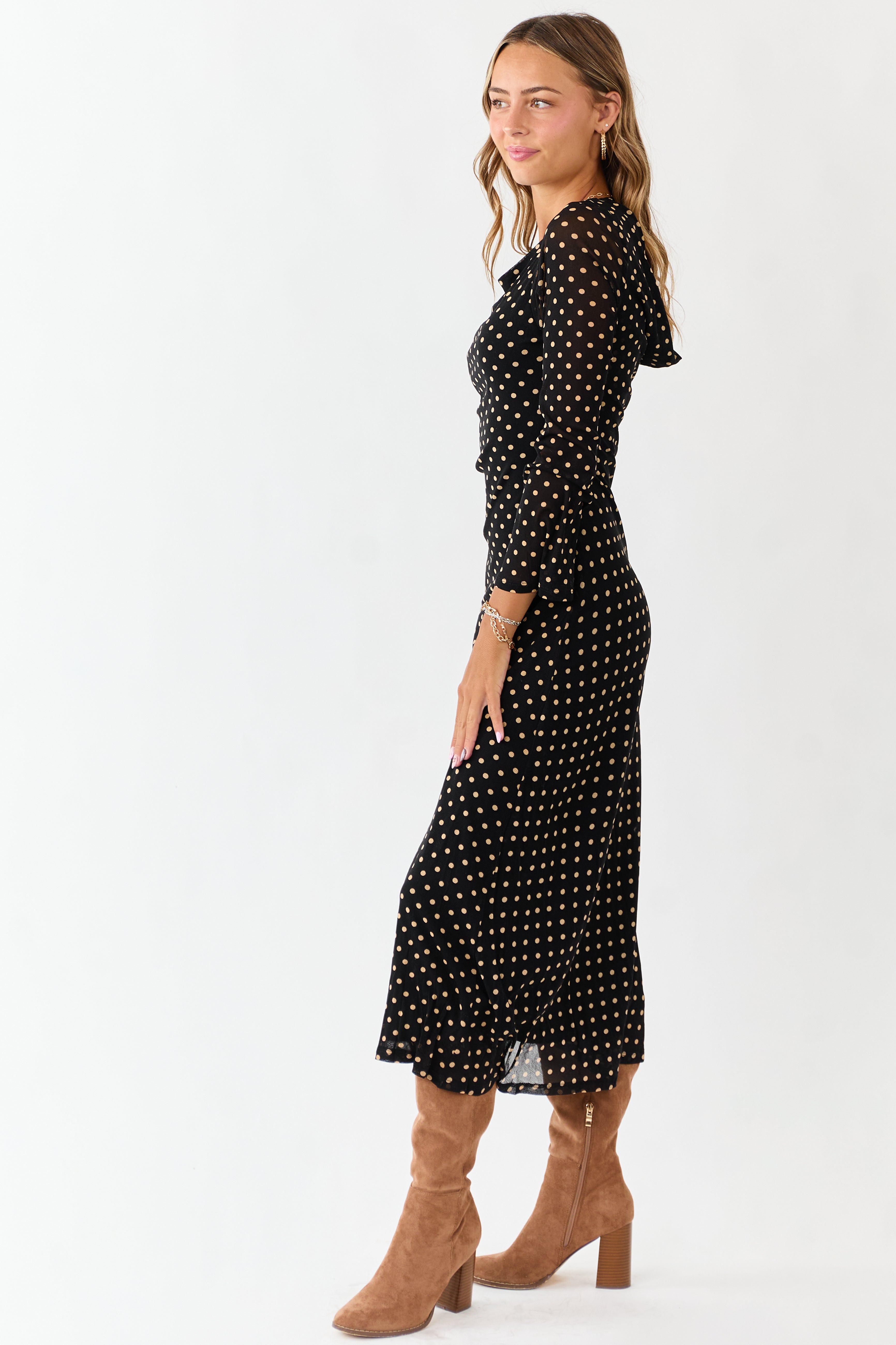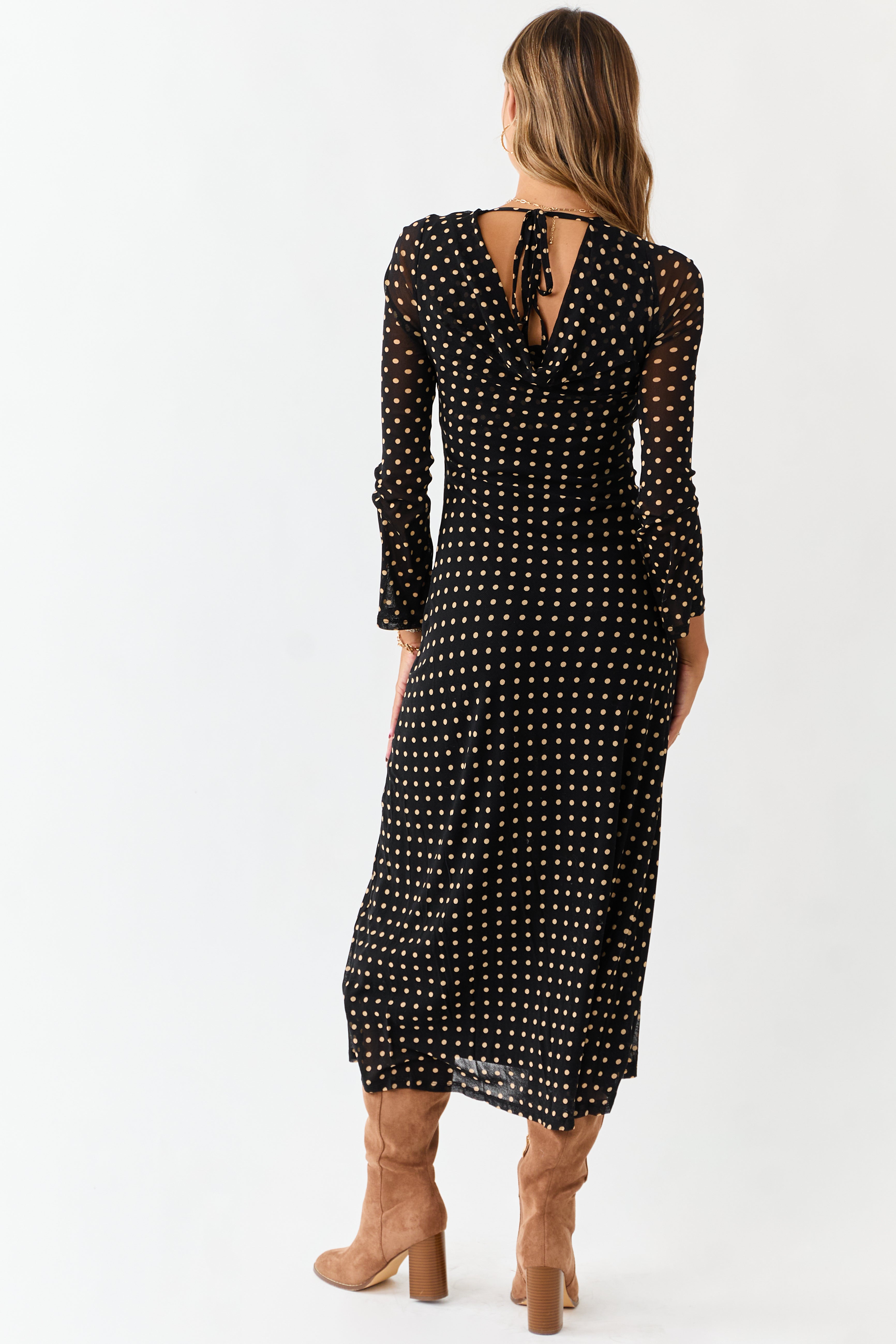 - Sheer mesh sleeves and playful polka dots give this midi dress timeless charm with a modern twist.