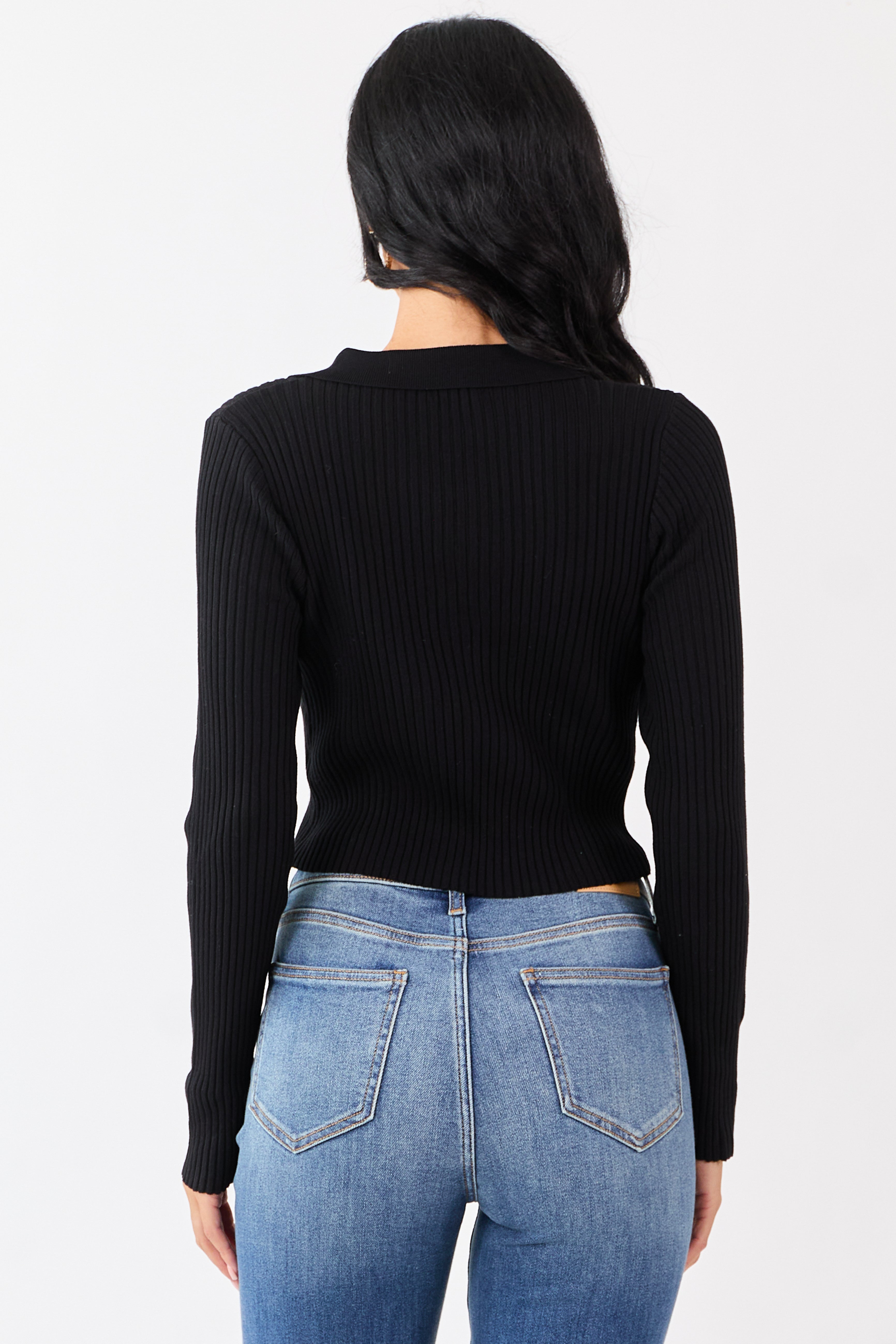 - A modern take on a classic. this rib knit polo sweater hugs your shape with a sleek cropped fit that pairs effortlessly with high-rise denim.