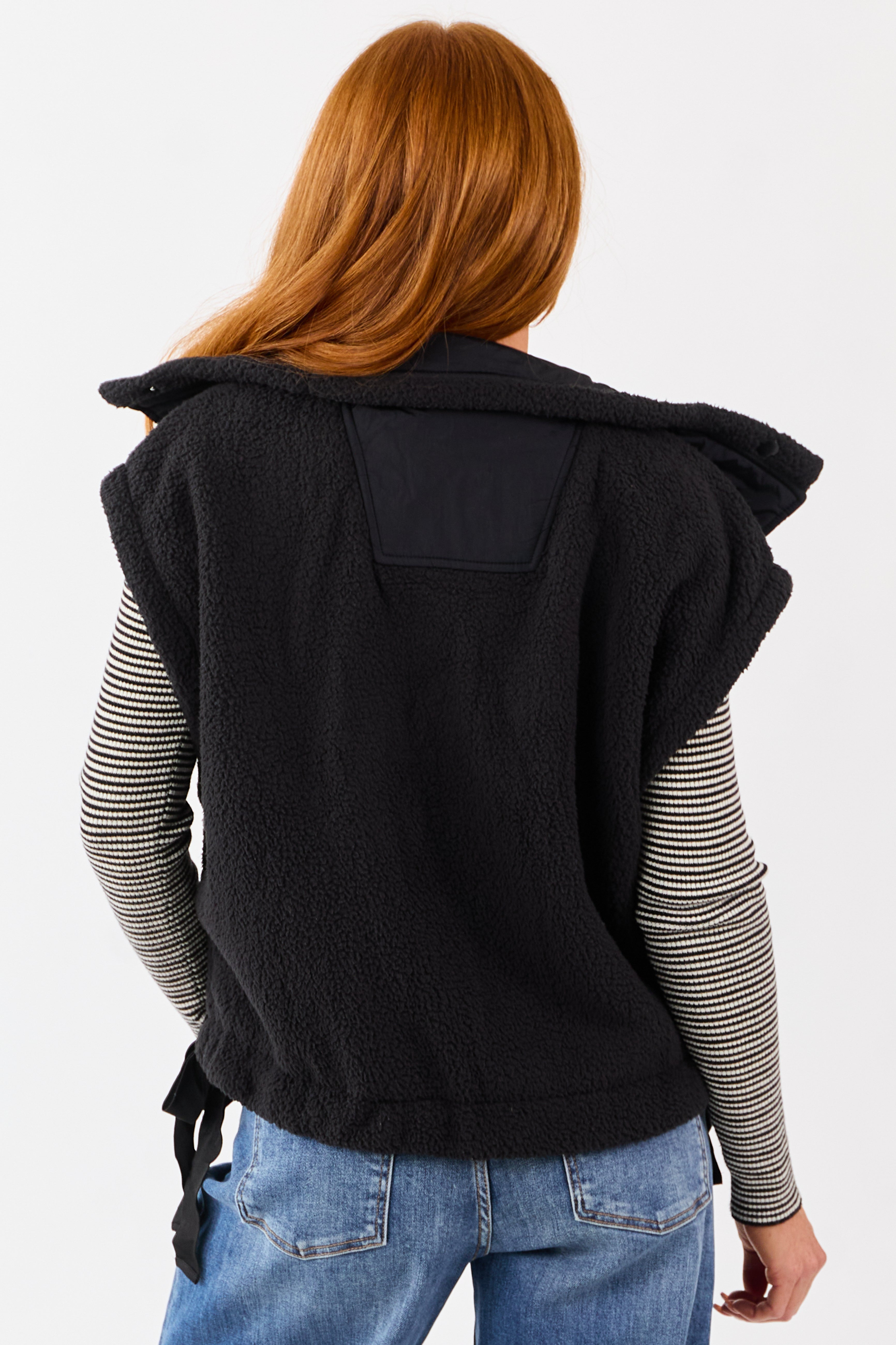 - Soft sherpa fabric and a relaxed oversized fit make this button-down vest a versatile layering piece with a adjustable side-tie hem.