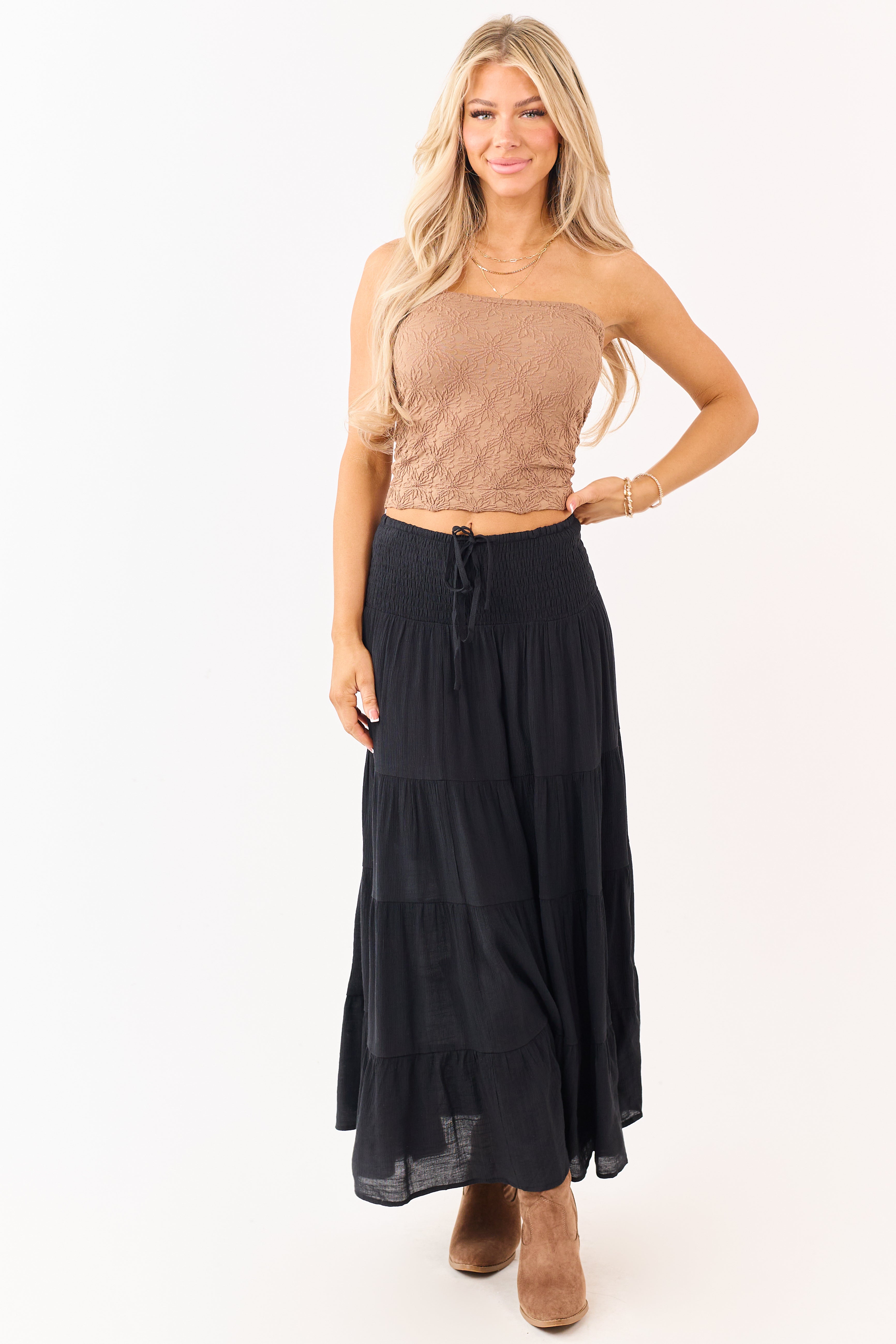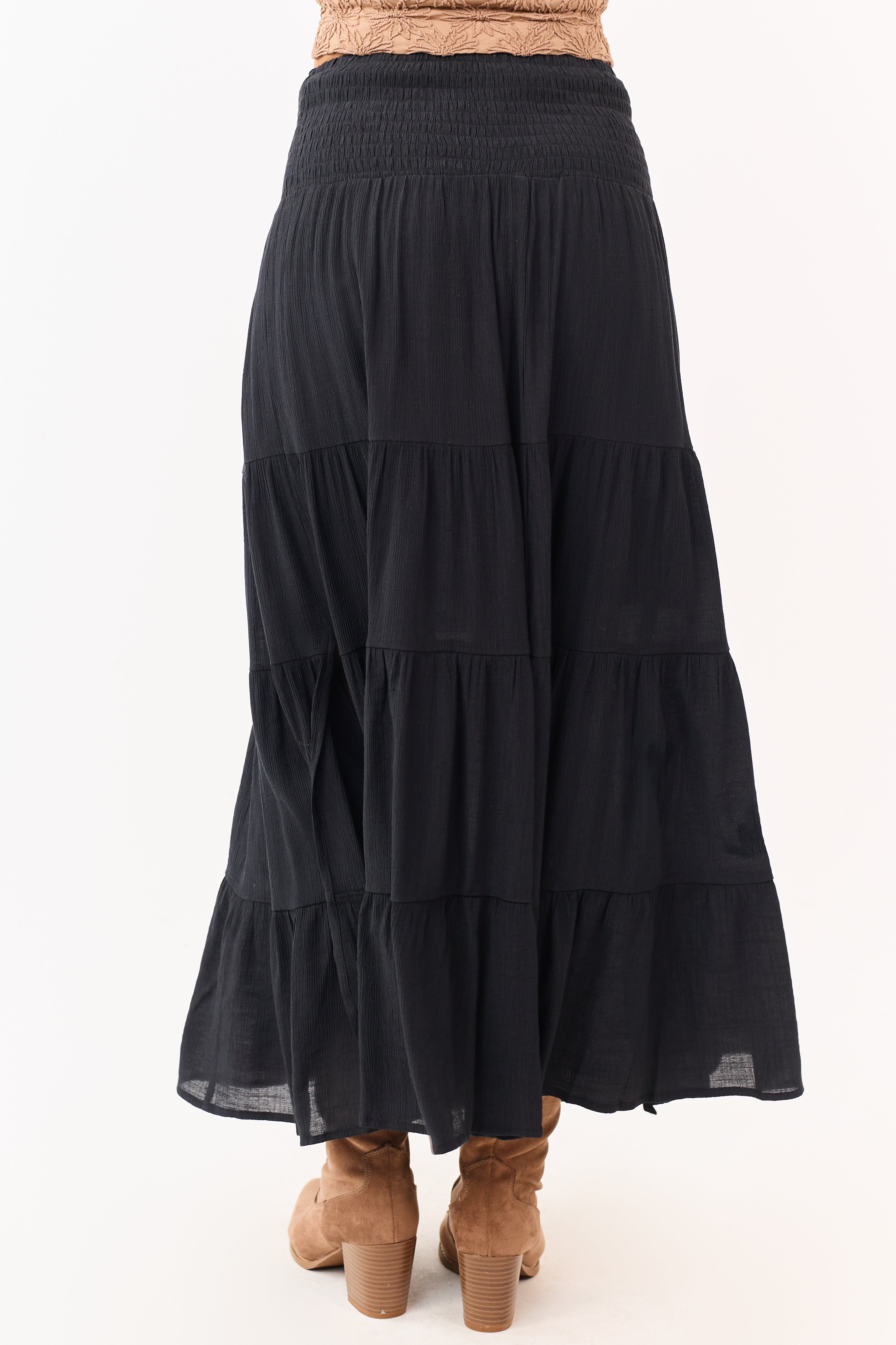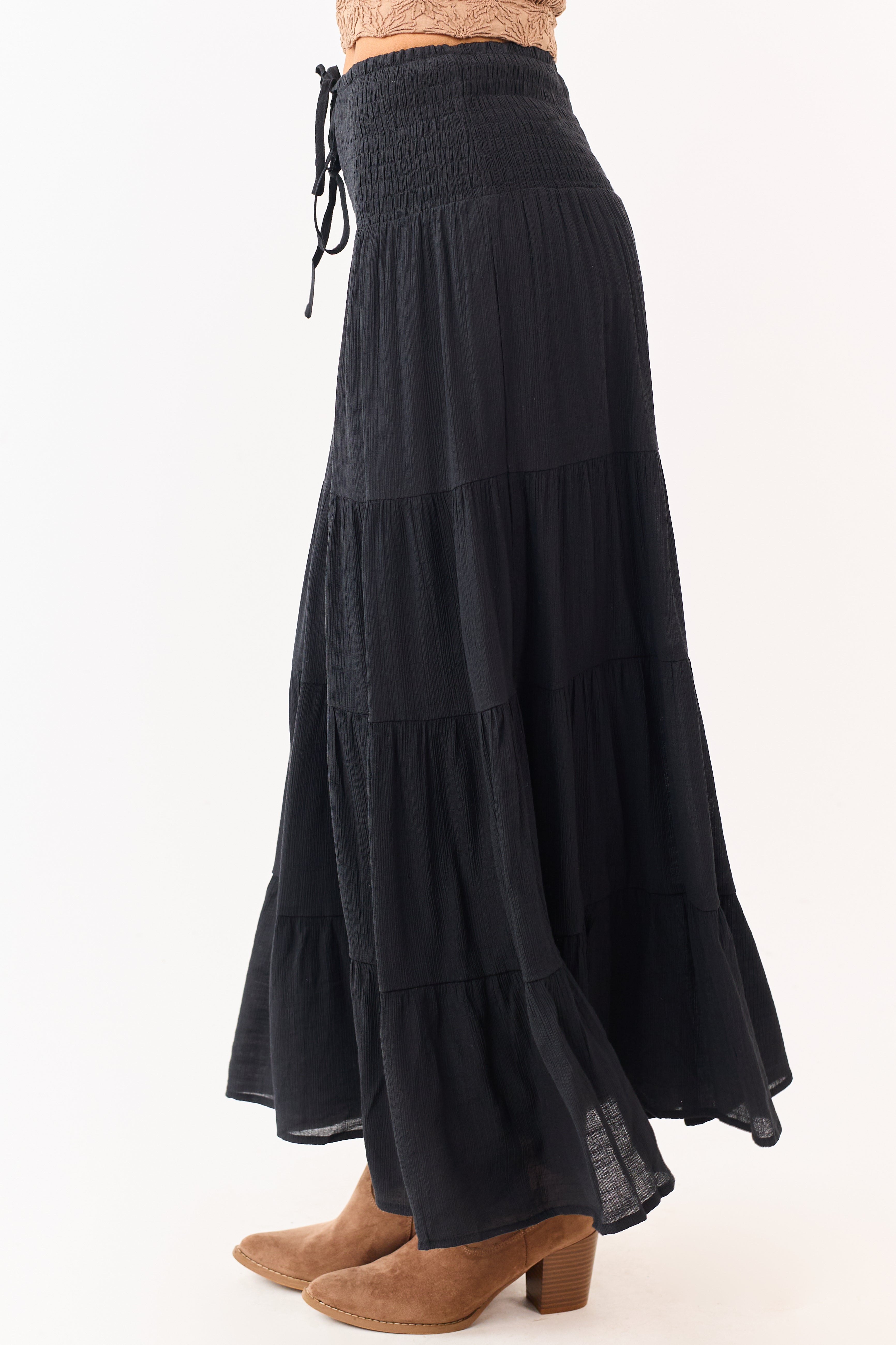 - A smocked waistband defines this maxi skirt. finished with tiered layers for a soft. flowy silhouette