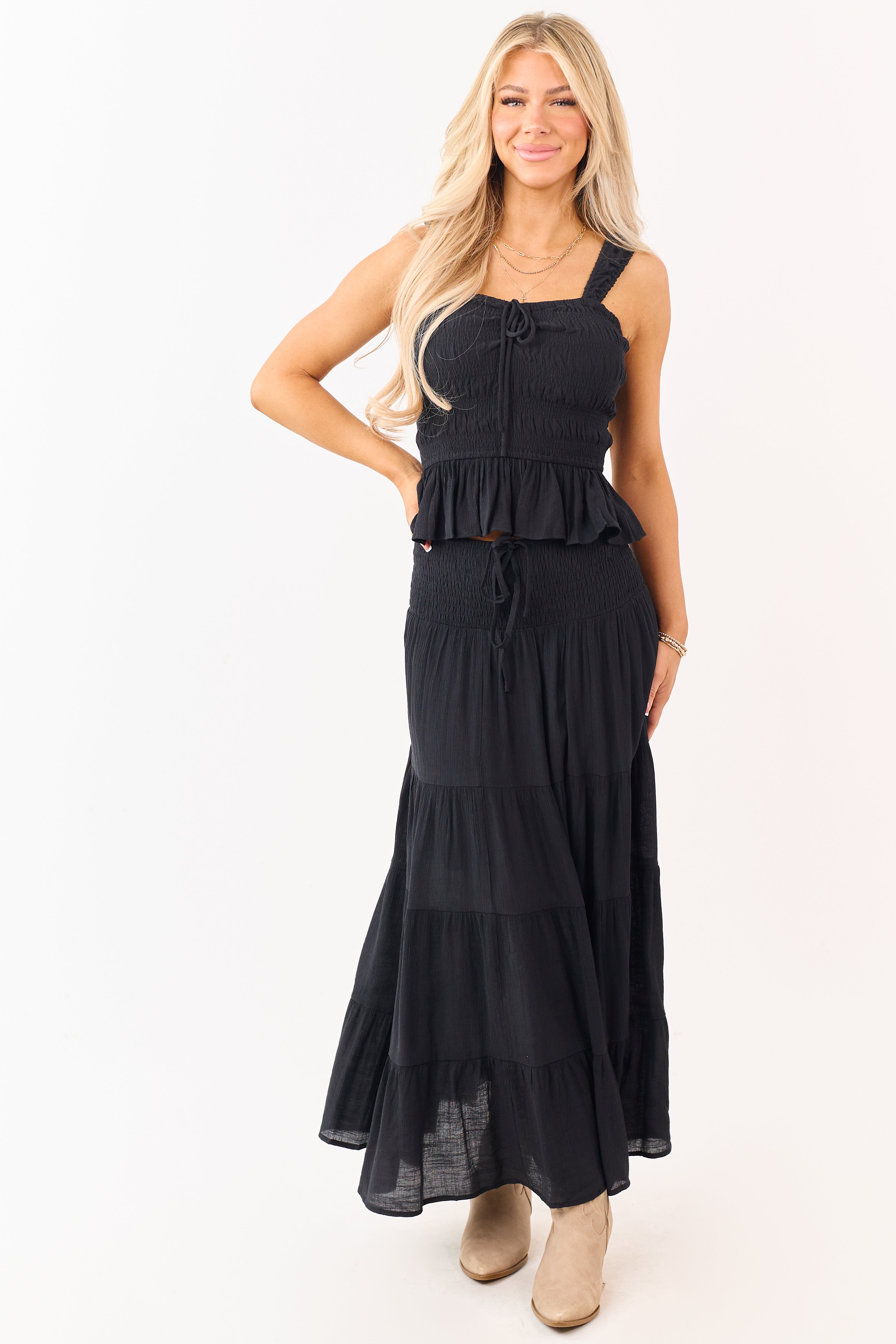 - Pairs with Black Smocked Bodice Ruffle Peplum Hem Tank Top