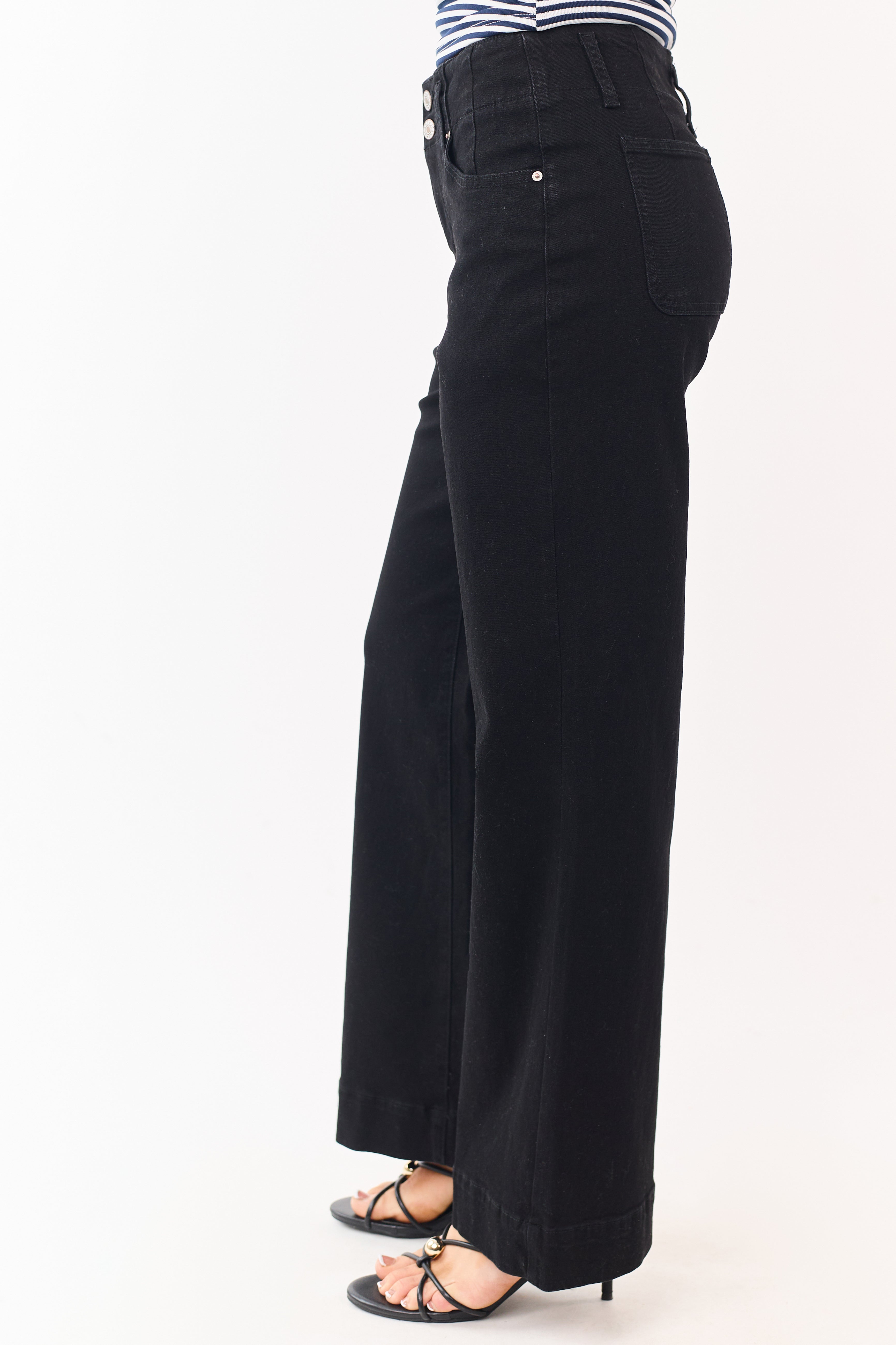 - A wardrobe essential. these black high-rise jeans feature a wide leg cut. stretchy denim. and double-button detail
