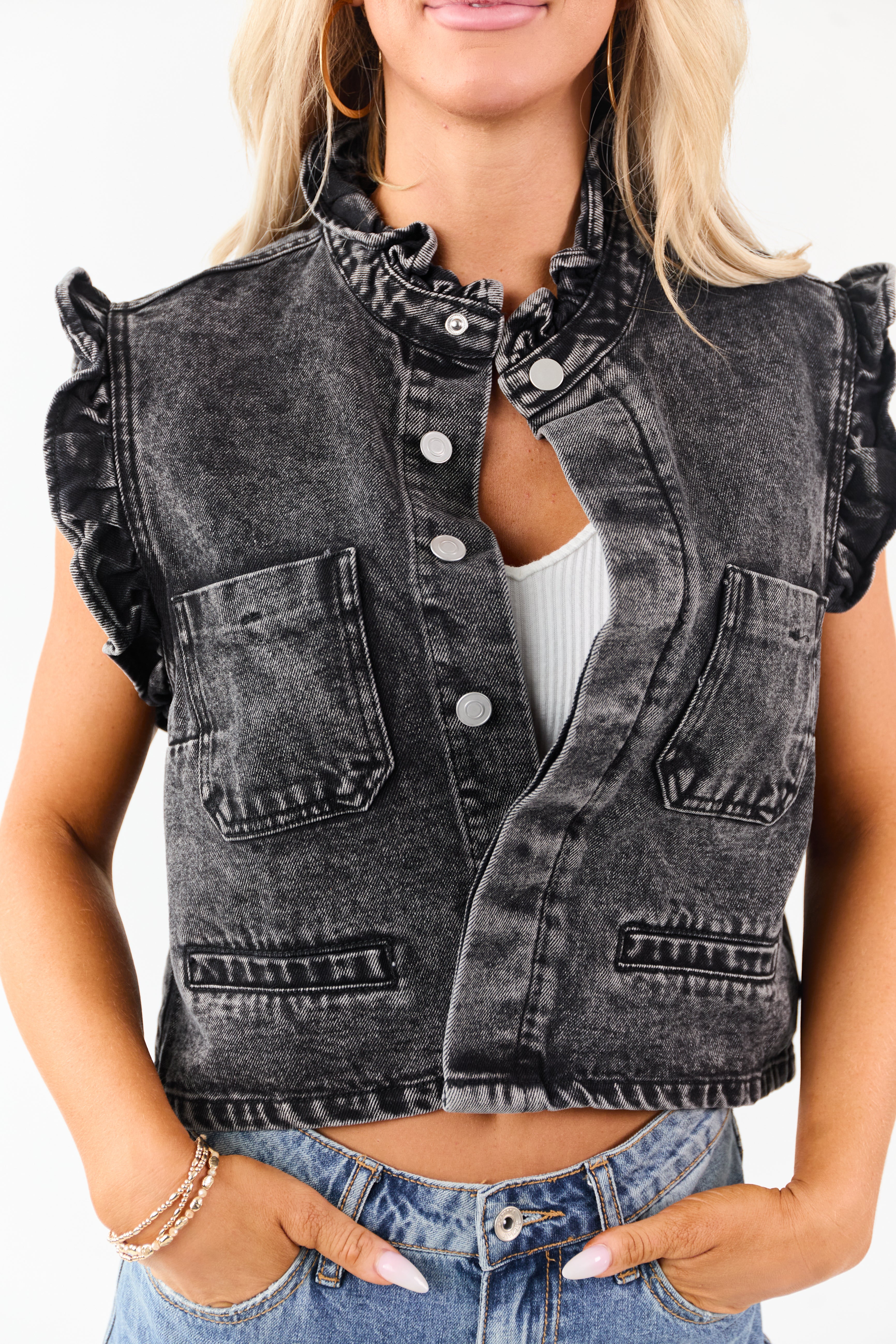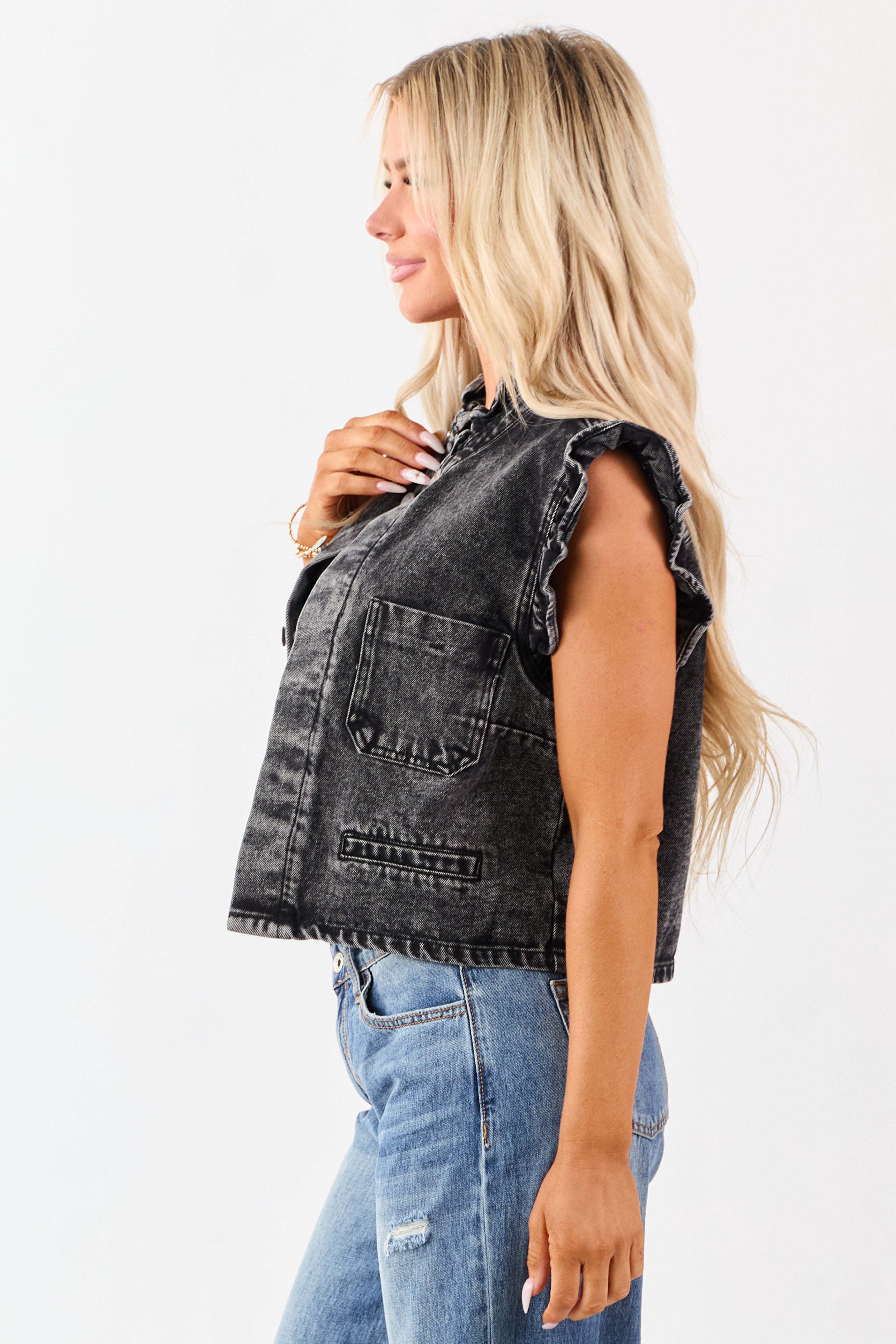 - Add edgy-feminine flair with this mineral washed denim vest. featuring a boxy fit and delicate ruffle trim.