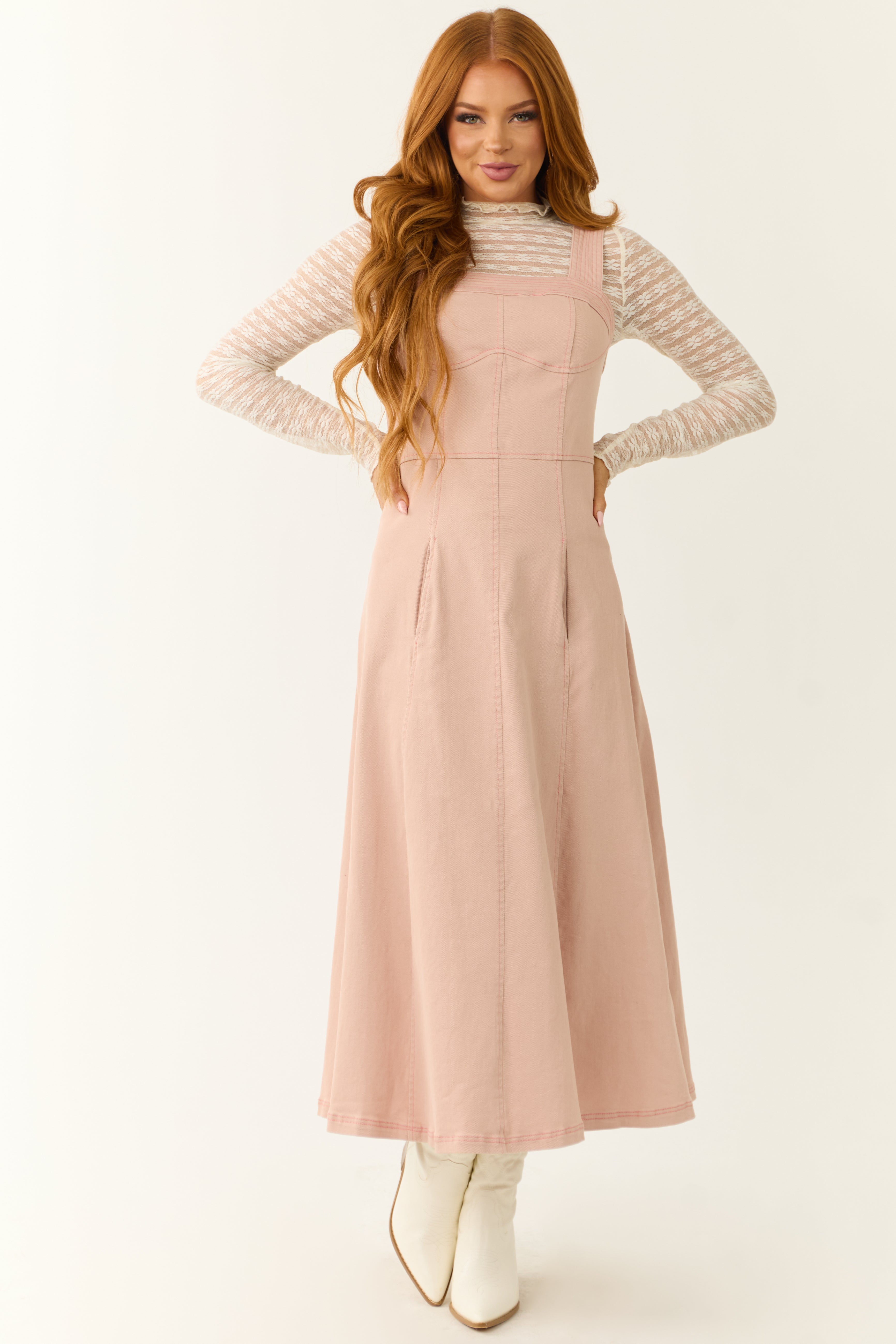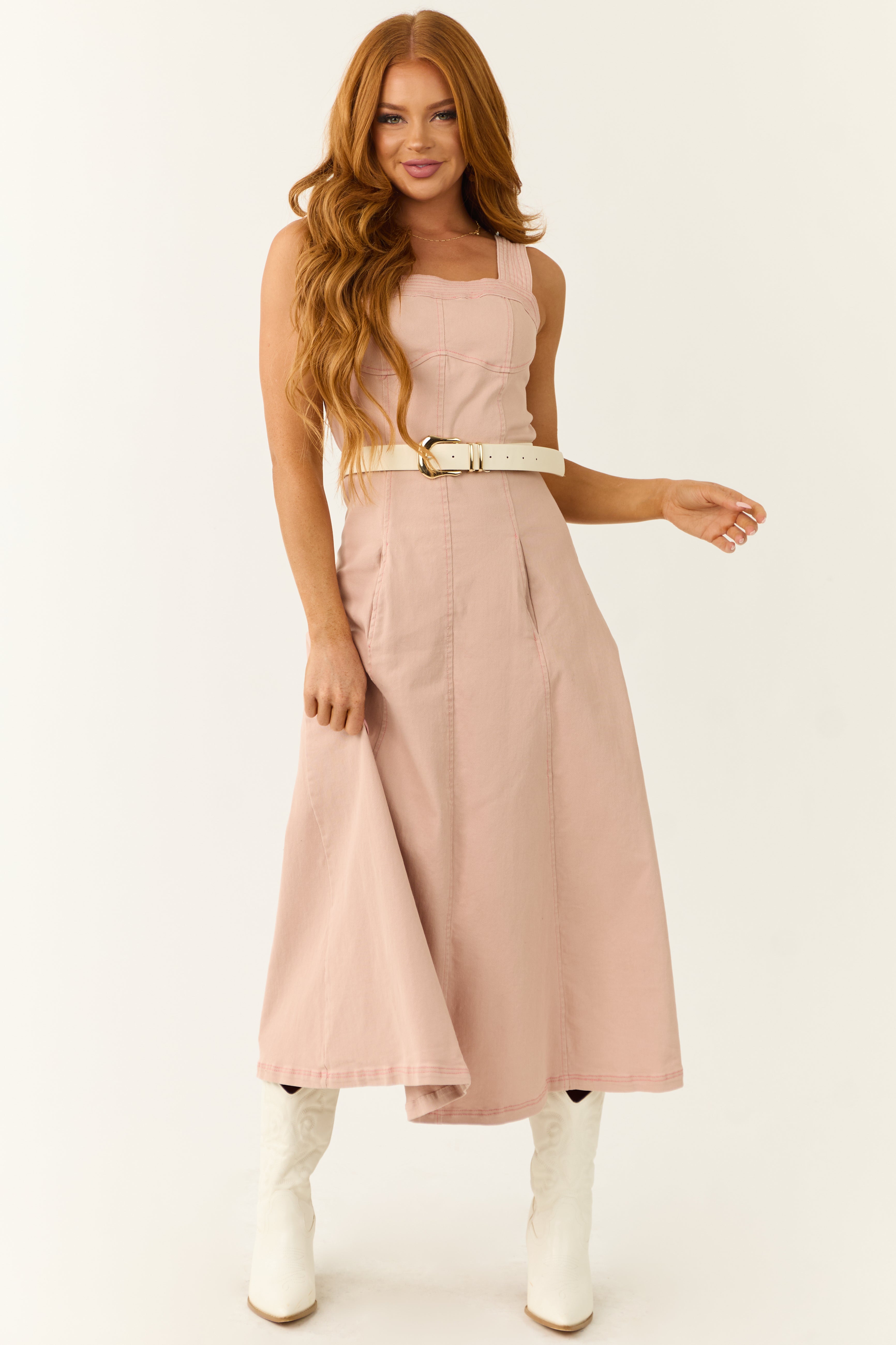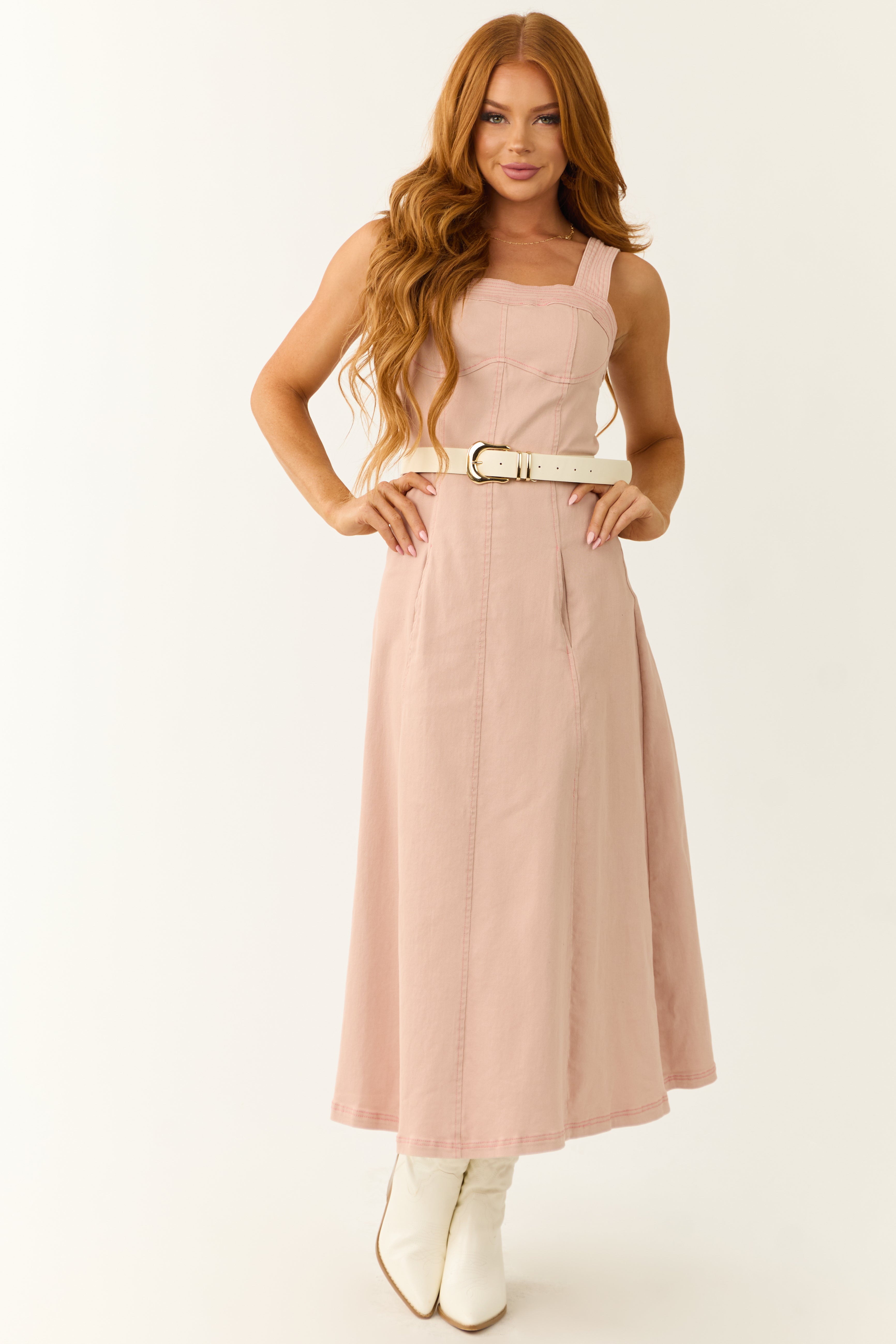 - Belt not included; Paired with Cream Faux Leather Gold Buckle Belt and Cream Mock Neck Sheer Lace Long Sleeve Top