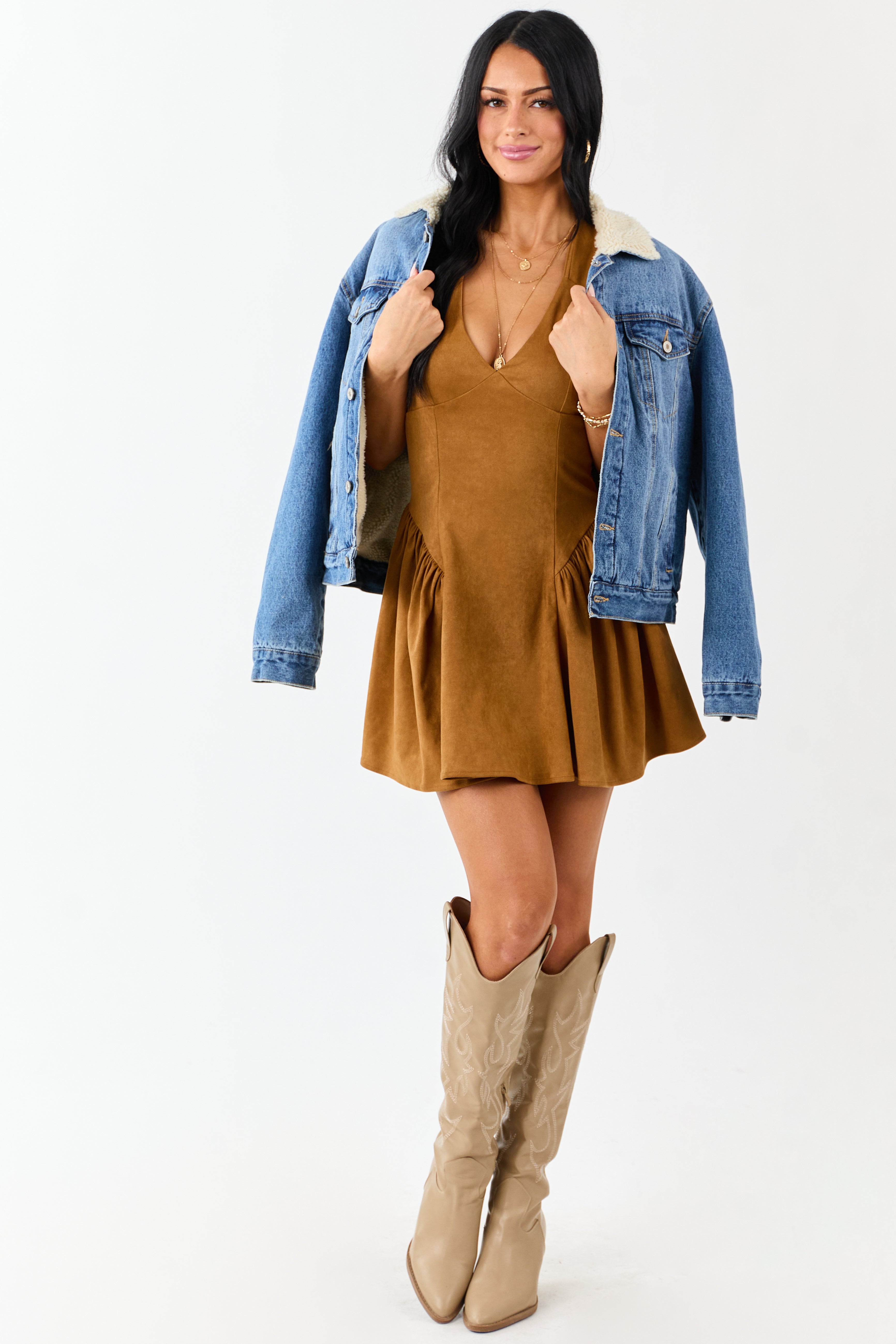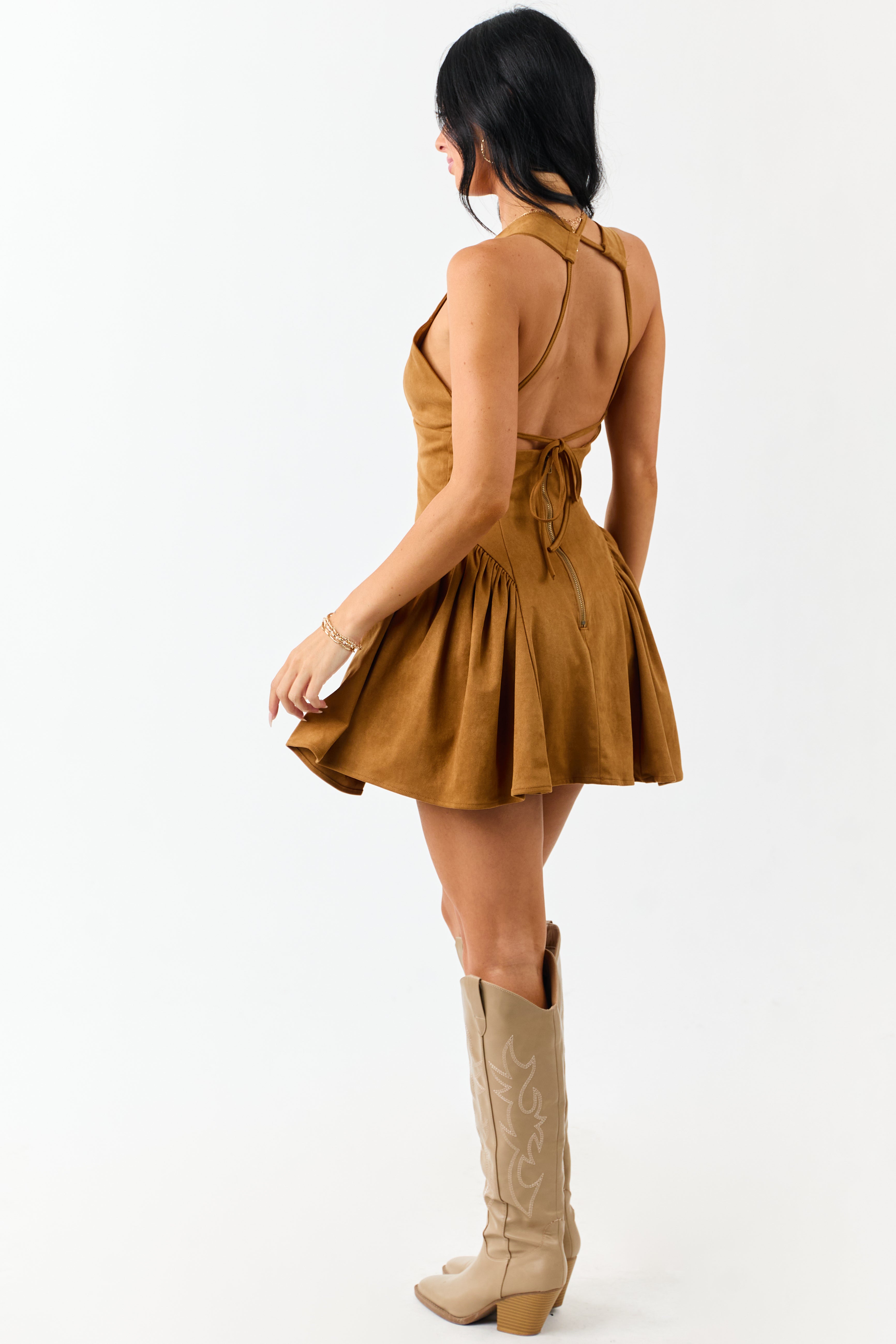 - A chic faux suede mini in a rich neutral tone with a plunging V-neck. open back. and curve-enhancing ruching.