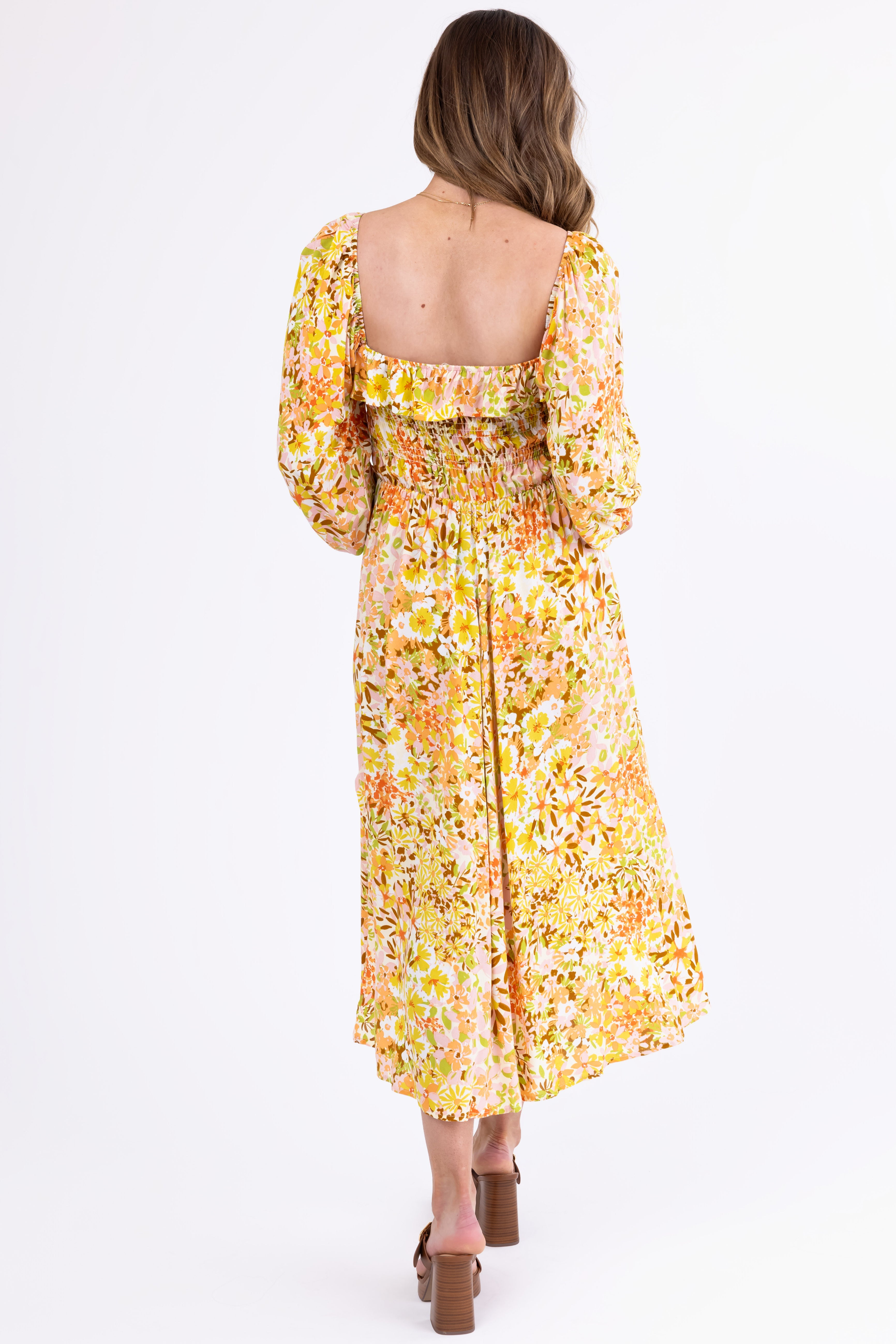 - Ruffled neckline