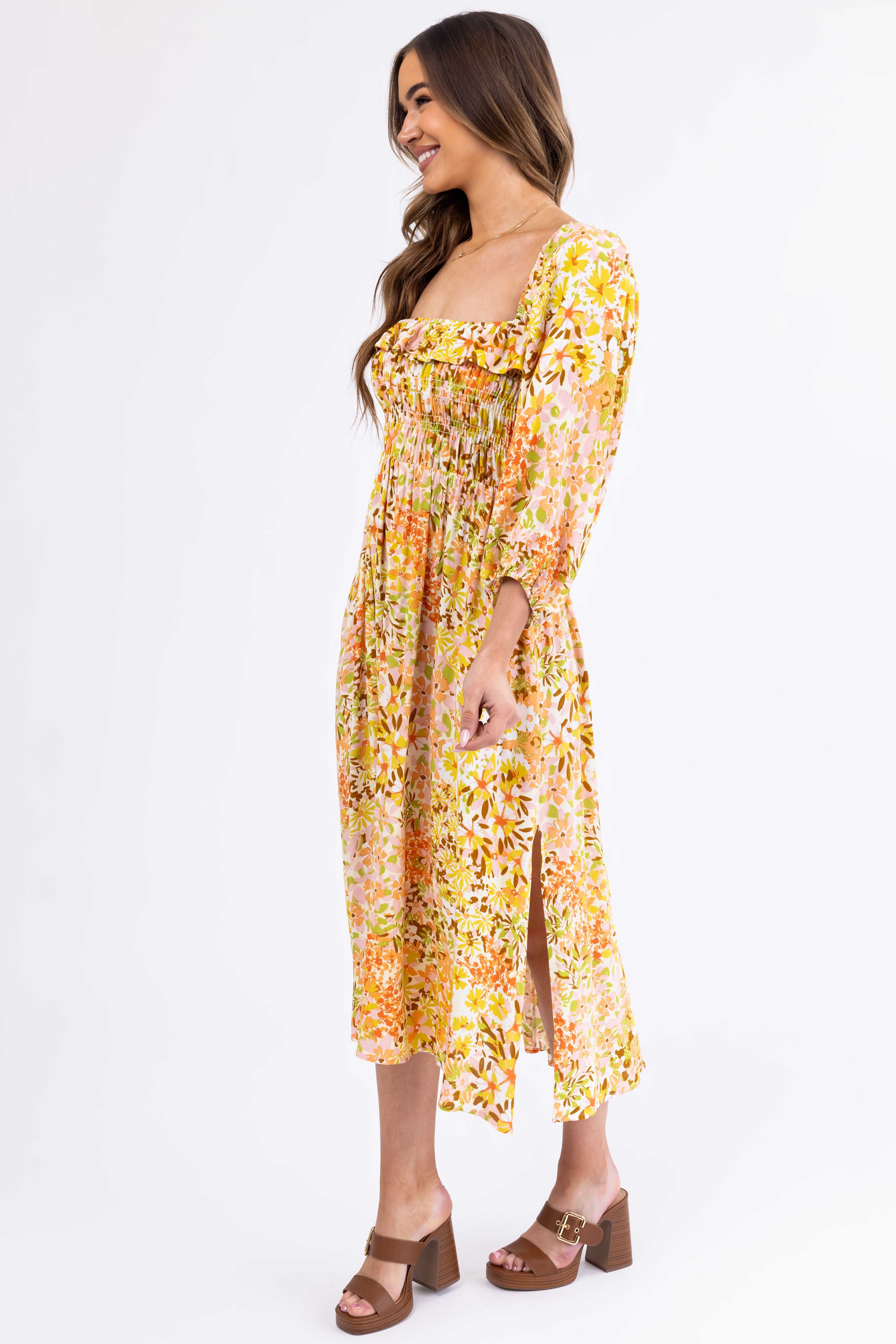 - Floral print in shades of Buttercream. Off White. Melon. Carnation. Kiwi. Poppy Red. Sepia. and Light Lime