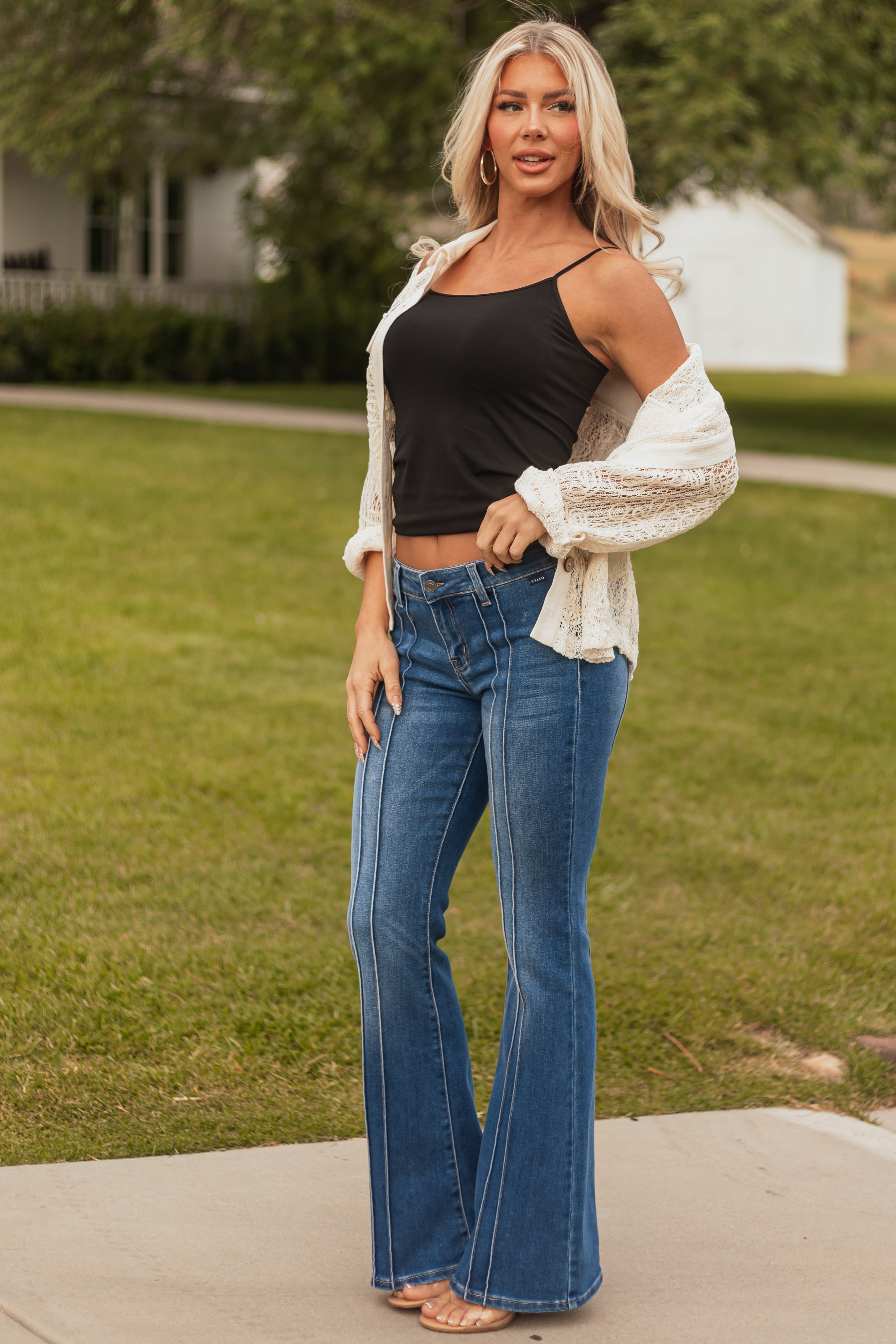 - Elongate your silhouette with these mid-rise flare jeans. Featuring pin tuck center seams and a tall-length fit with comfy stretch.