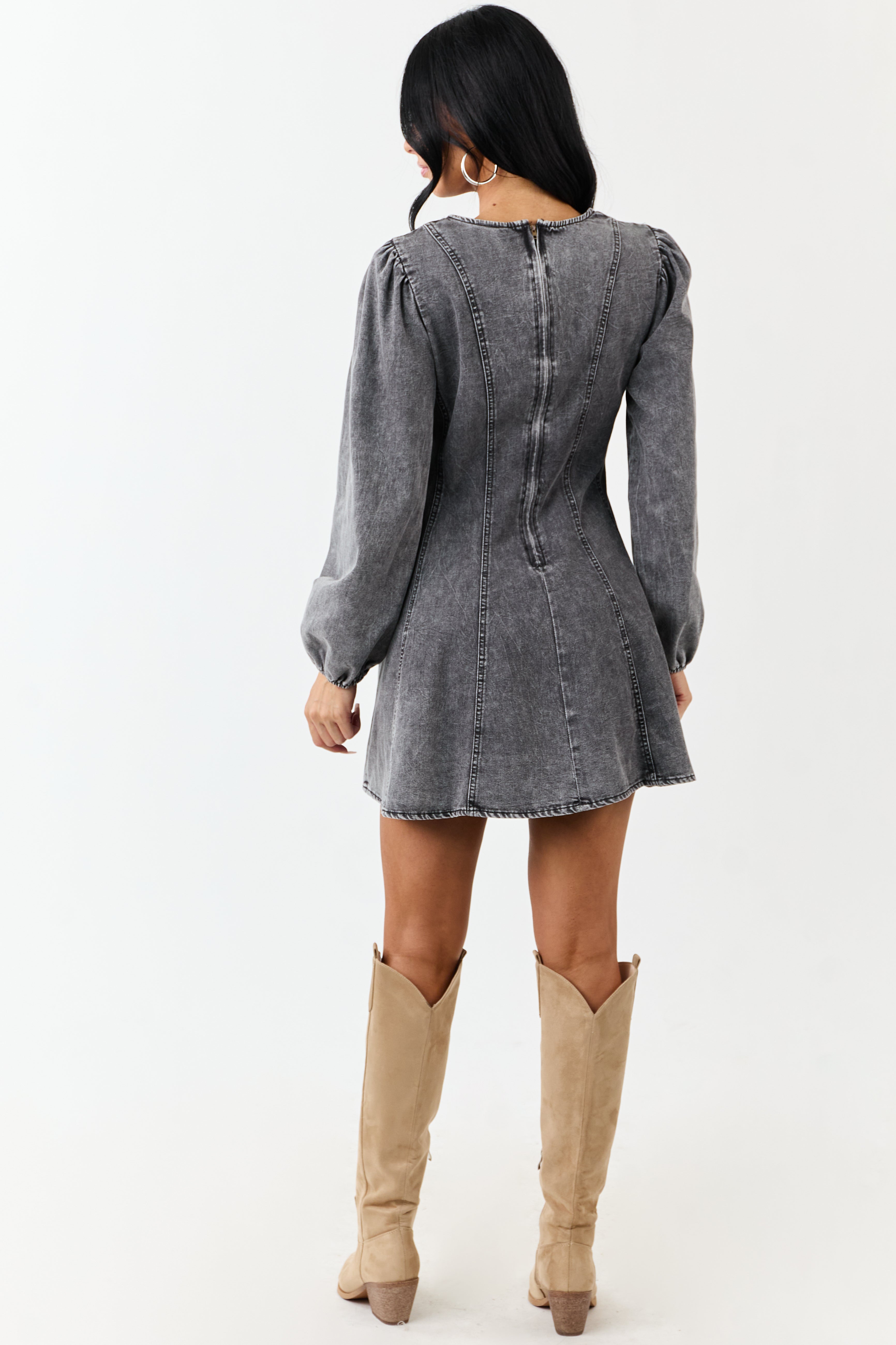 - This denim mini dress features an A-line fit and a lived-in finish.