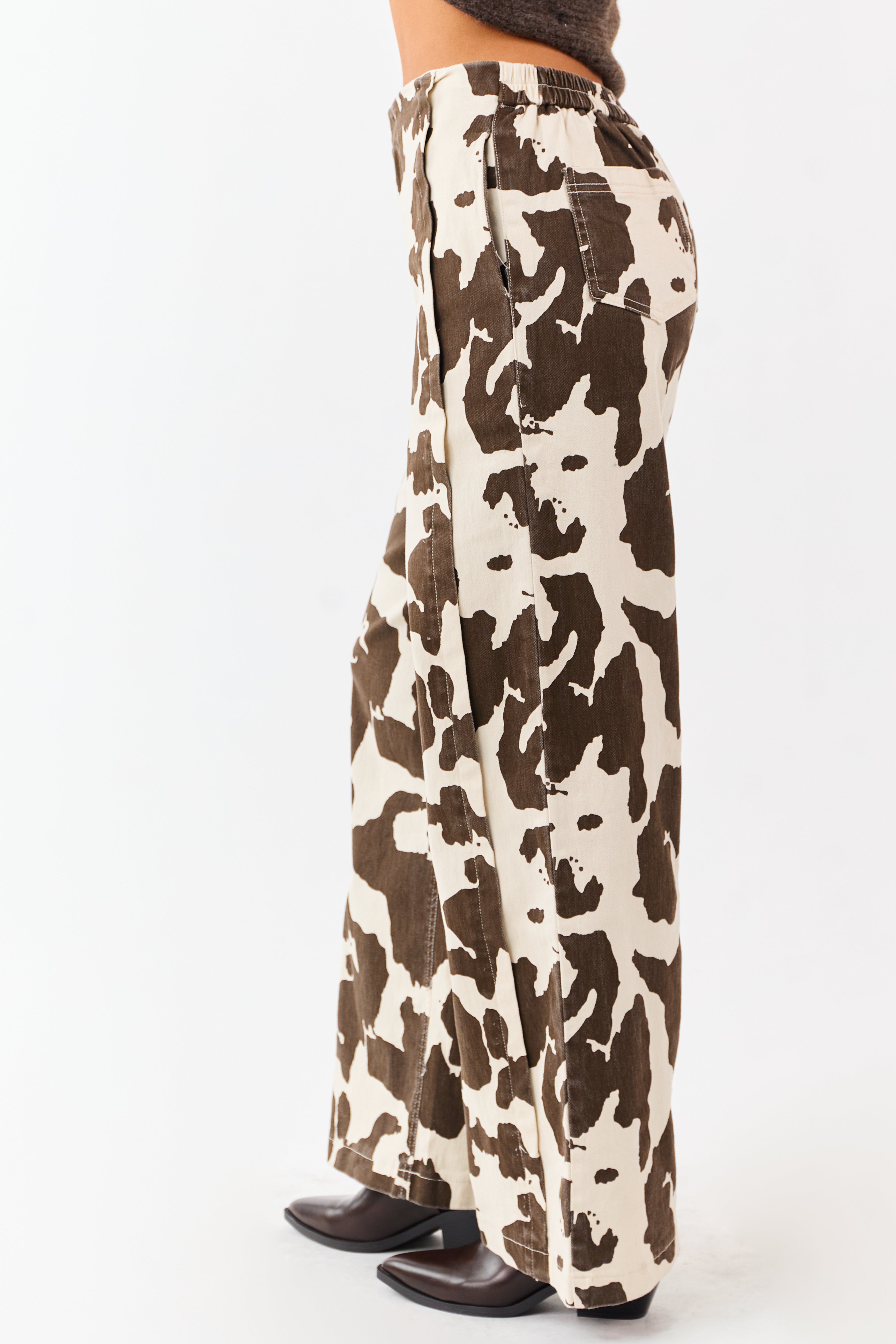 - Western charm meets modern style in these bold cow print denim pants. Featuring pintuck side line details and a comfy wide leg fit.
