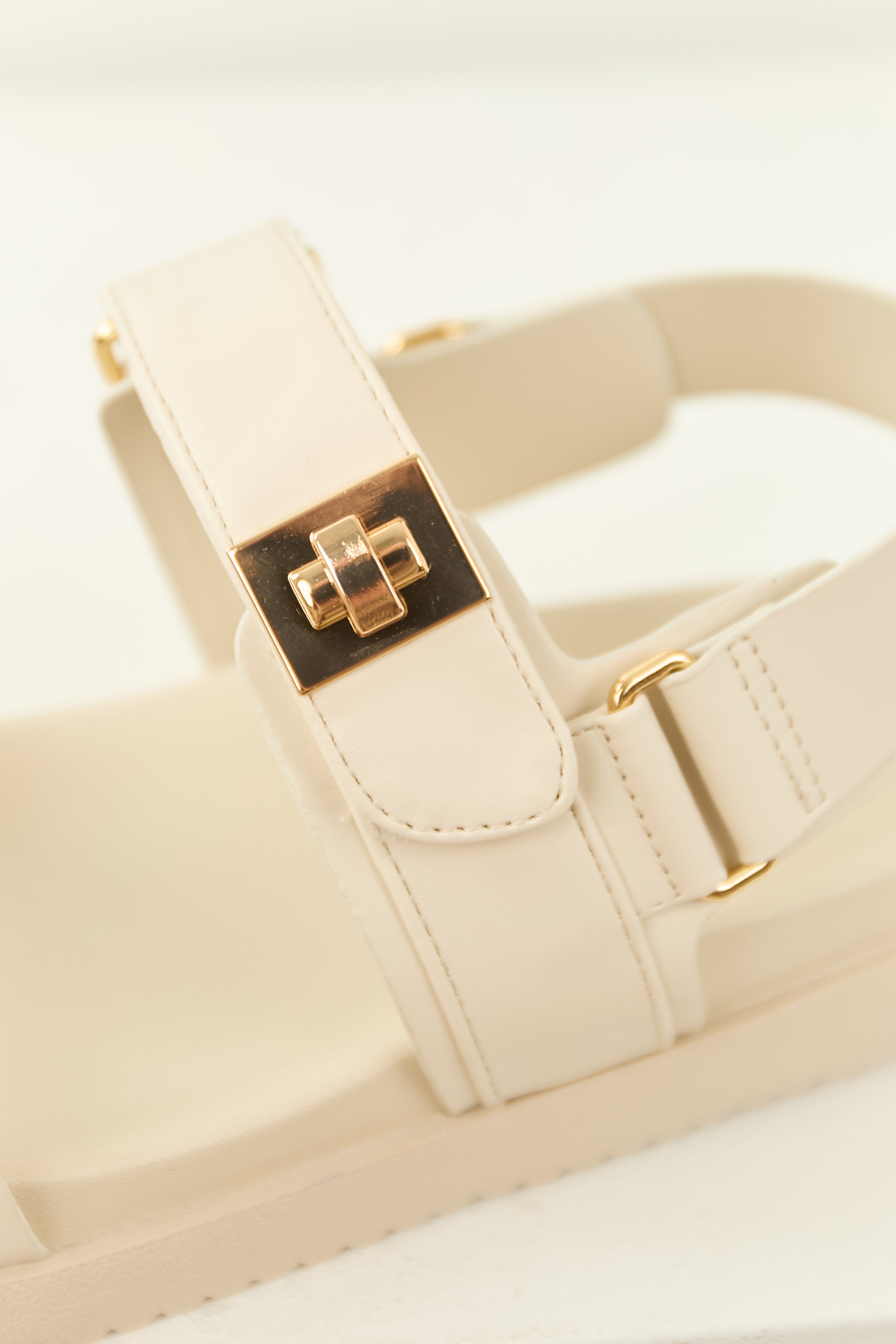 - Decorative gold metallic detail on strap