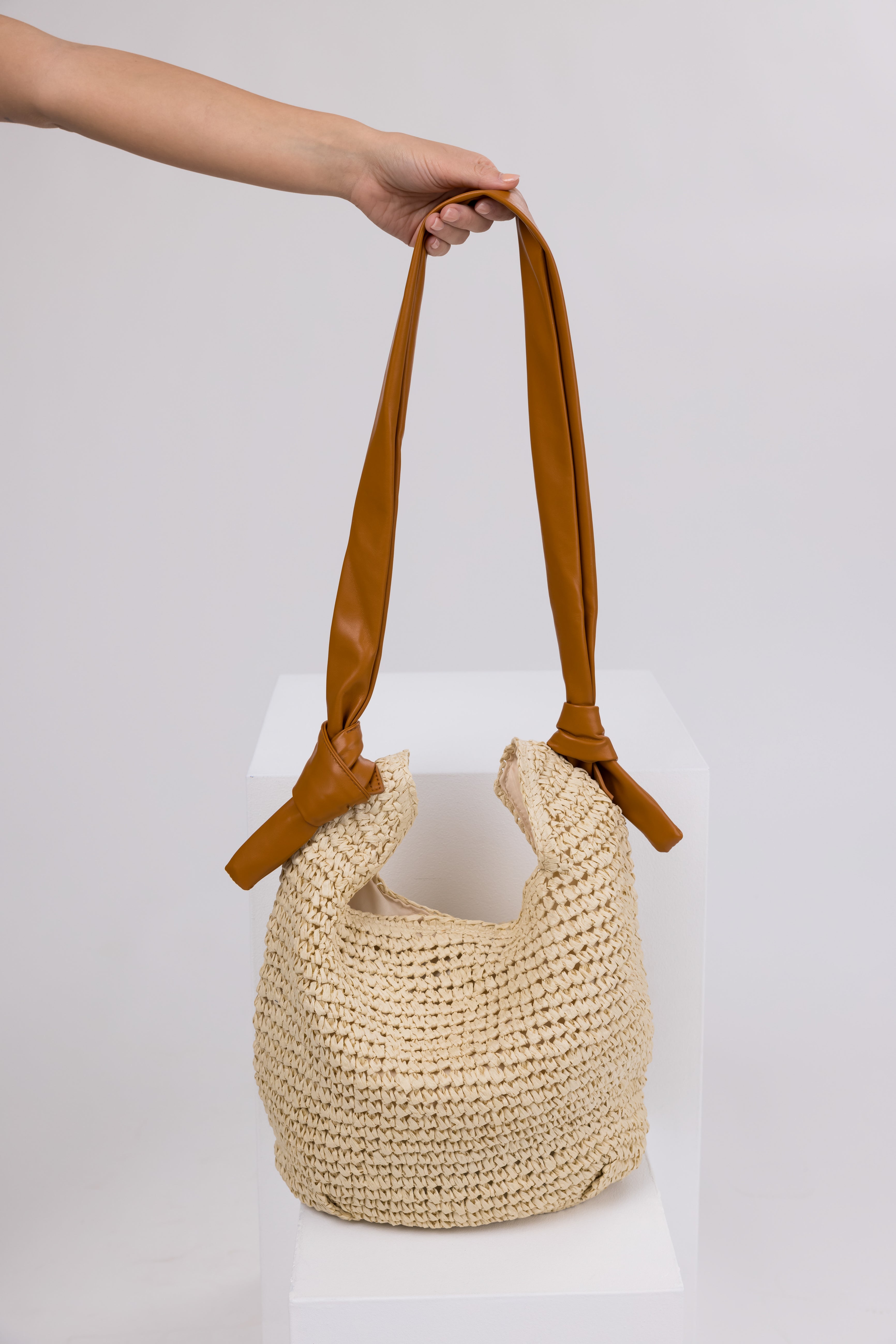 Cream Straw Tote with Copper Pleather Handle