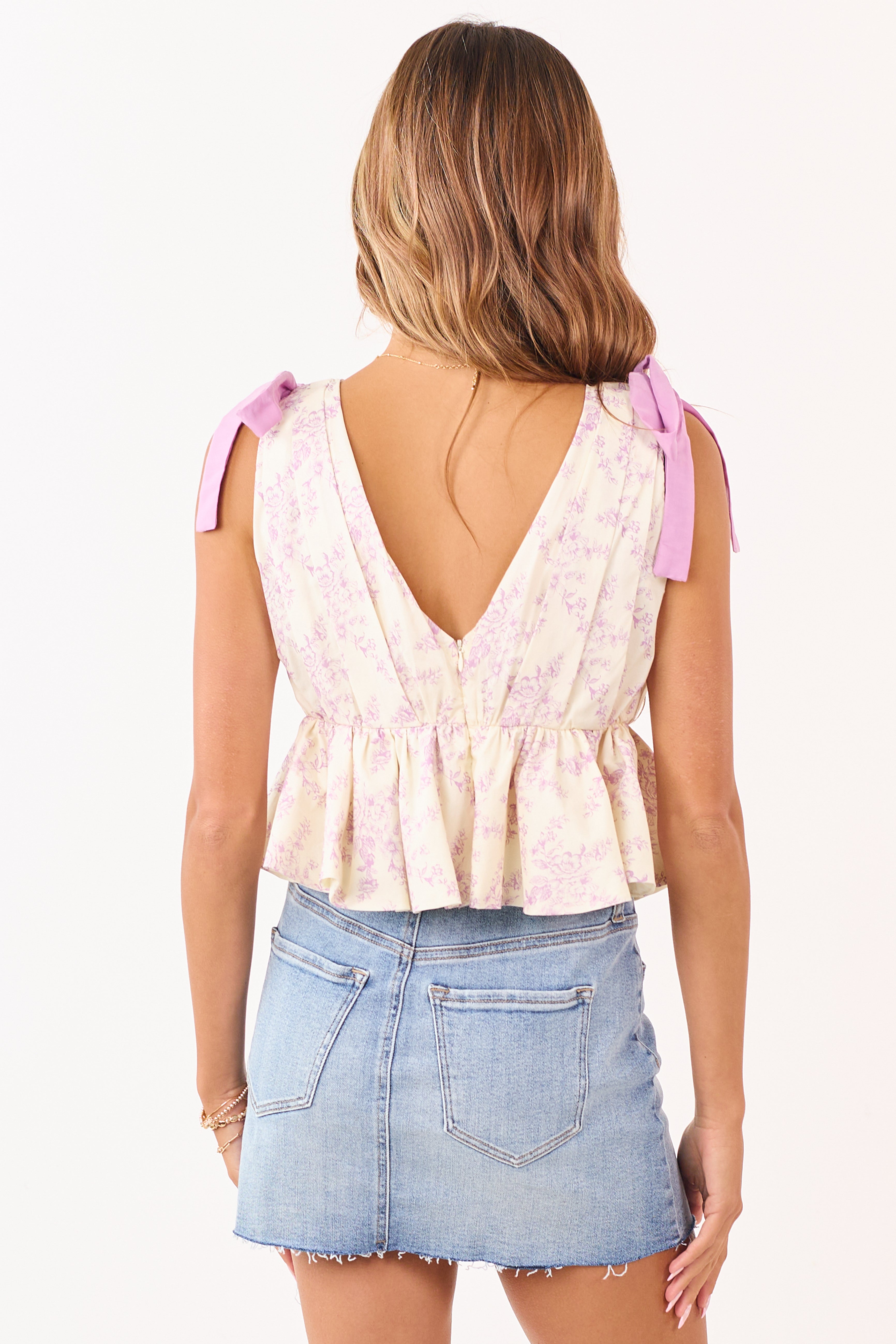 - Neutral cotton featuring a vintage floral print and delicate pleating that flows into a ruffled hem