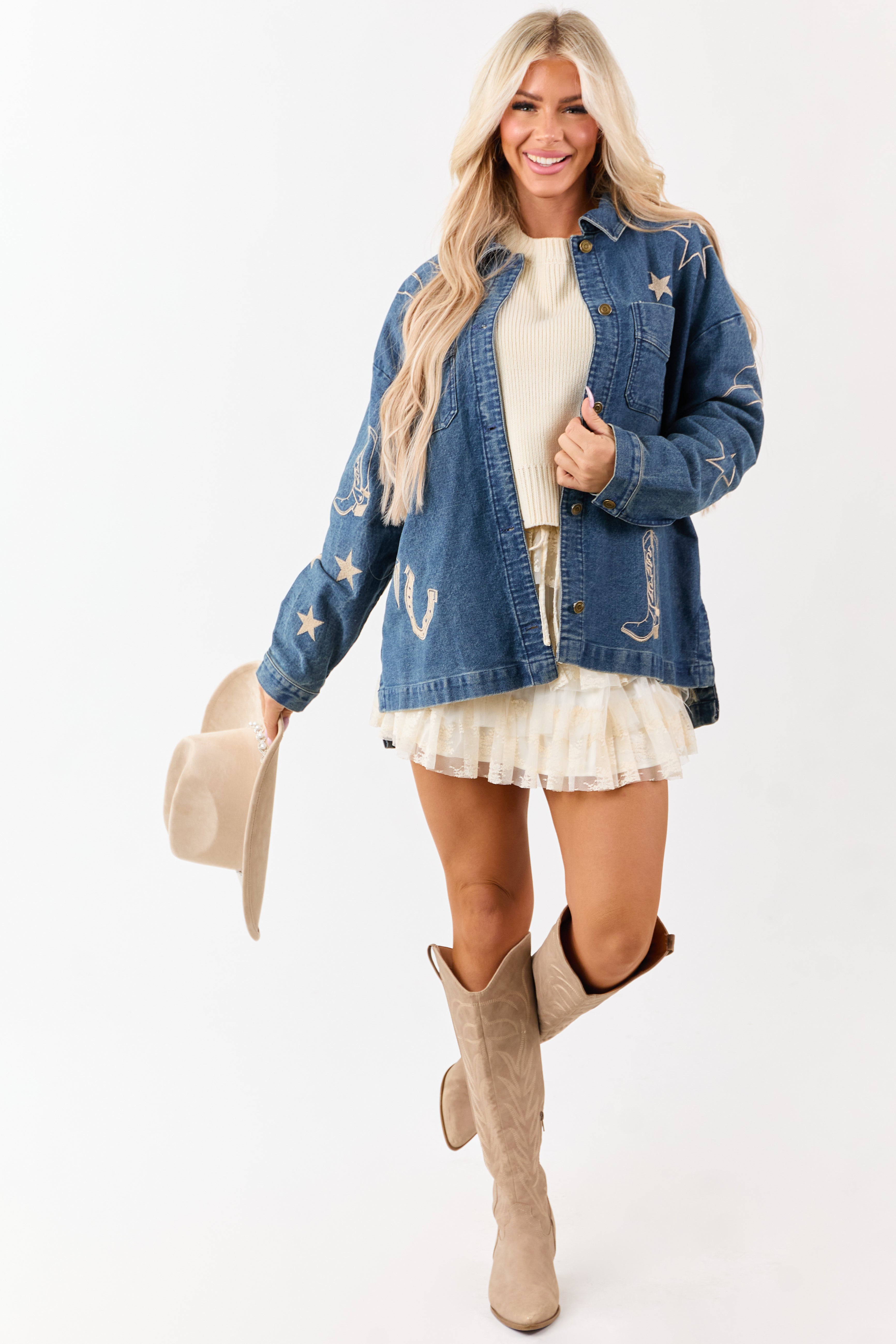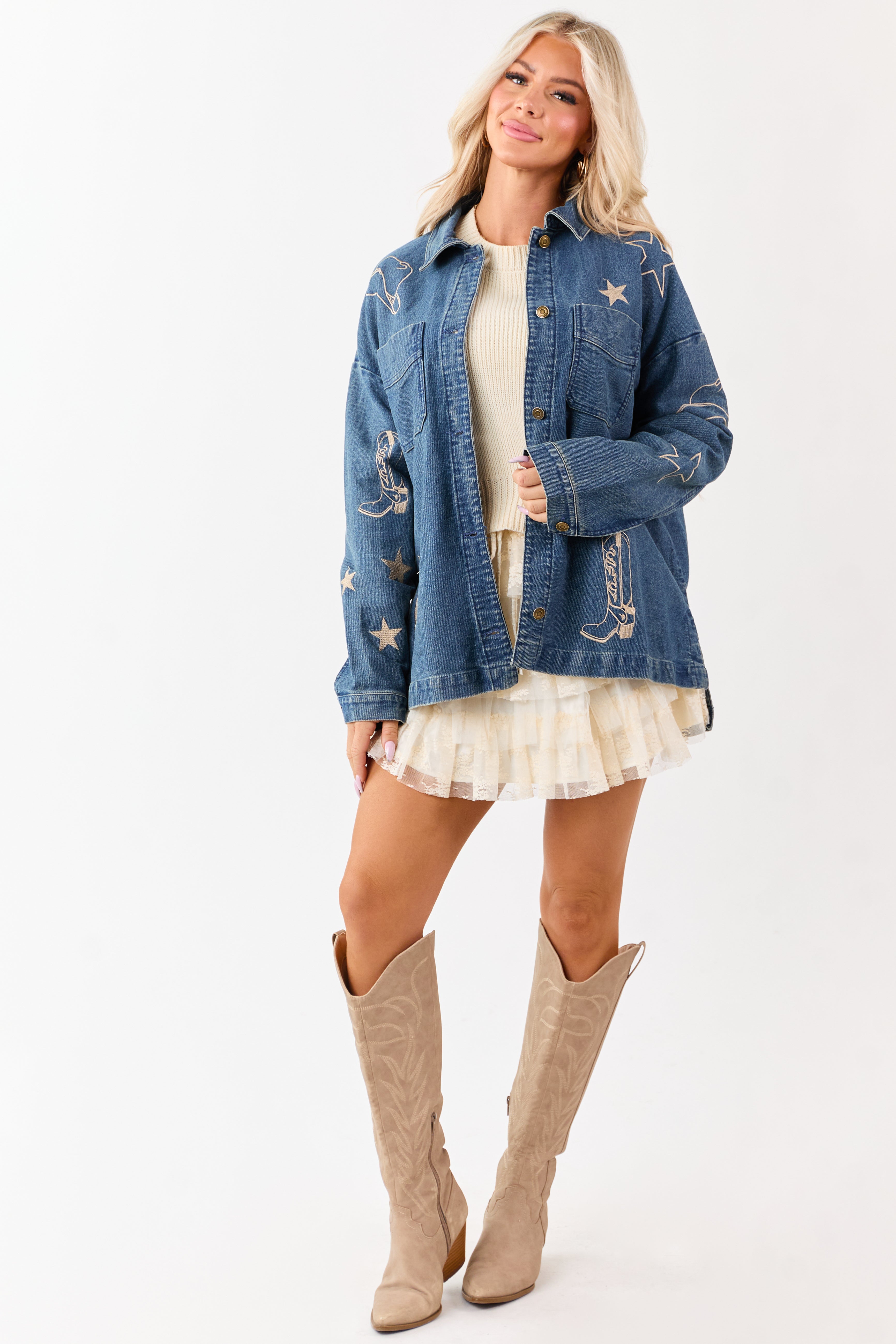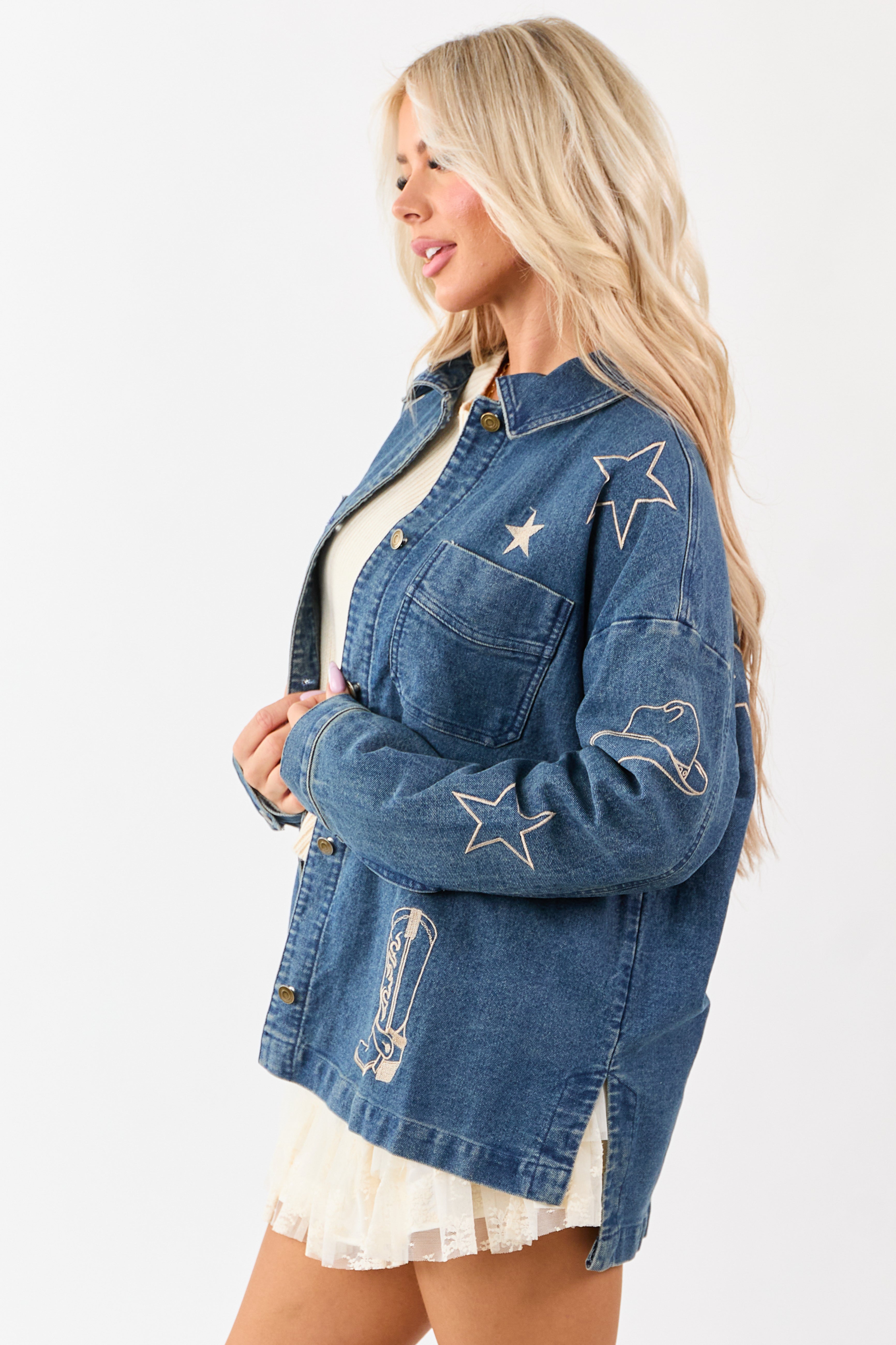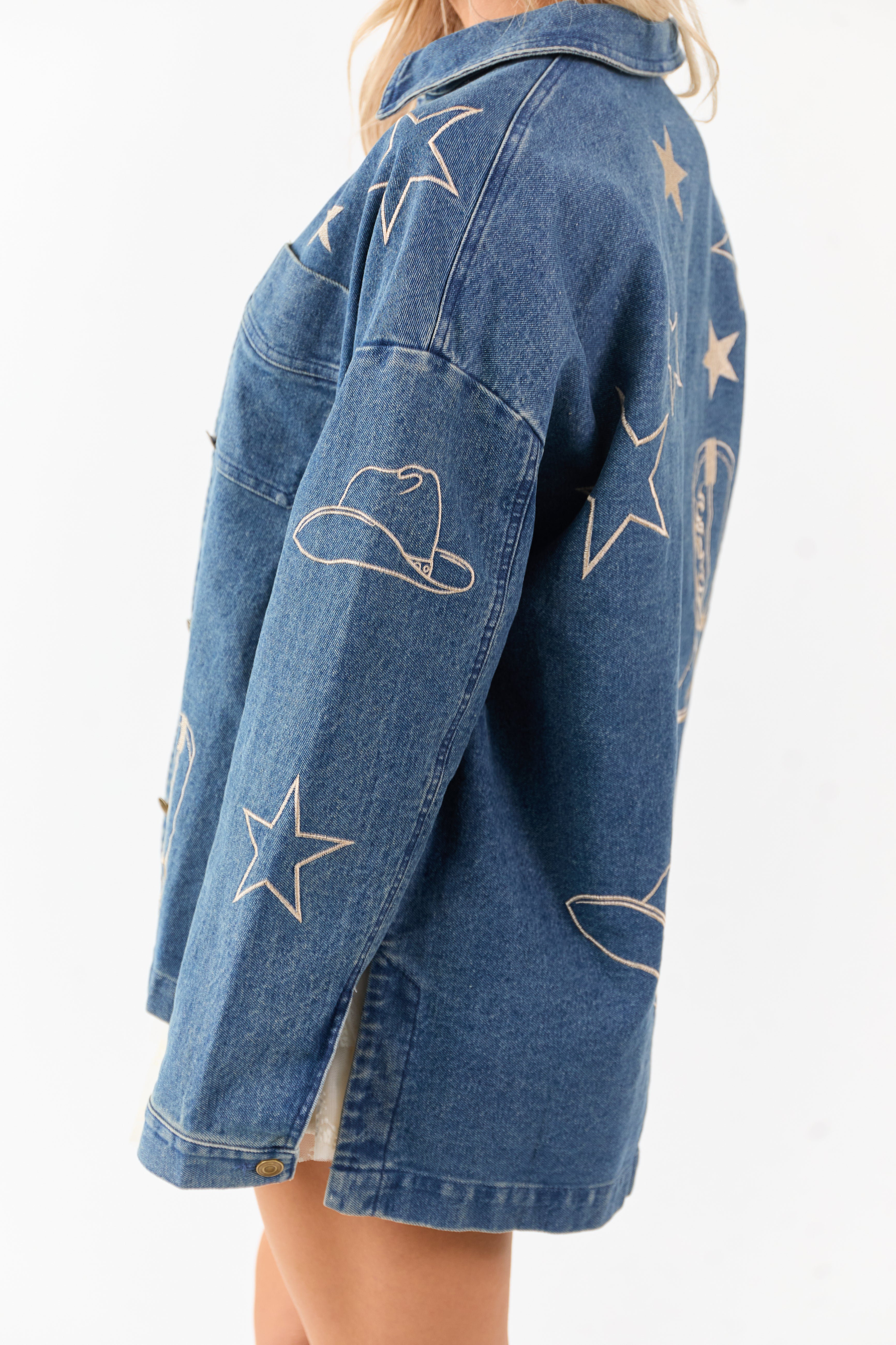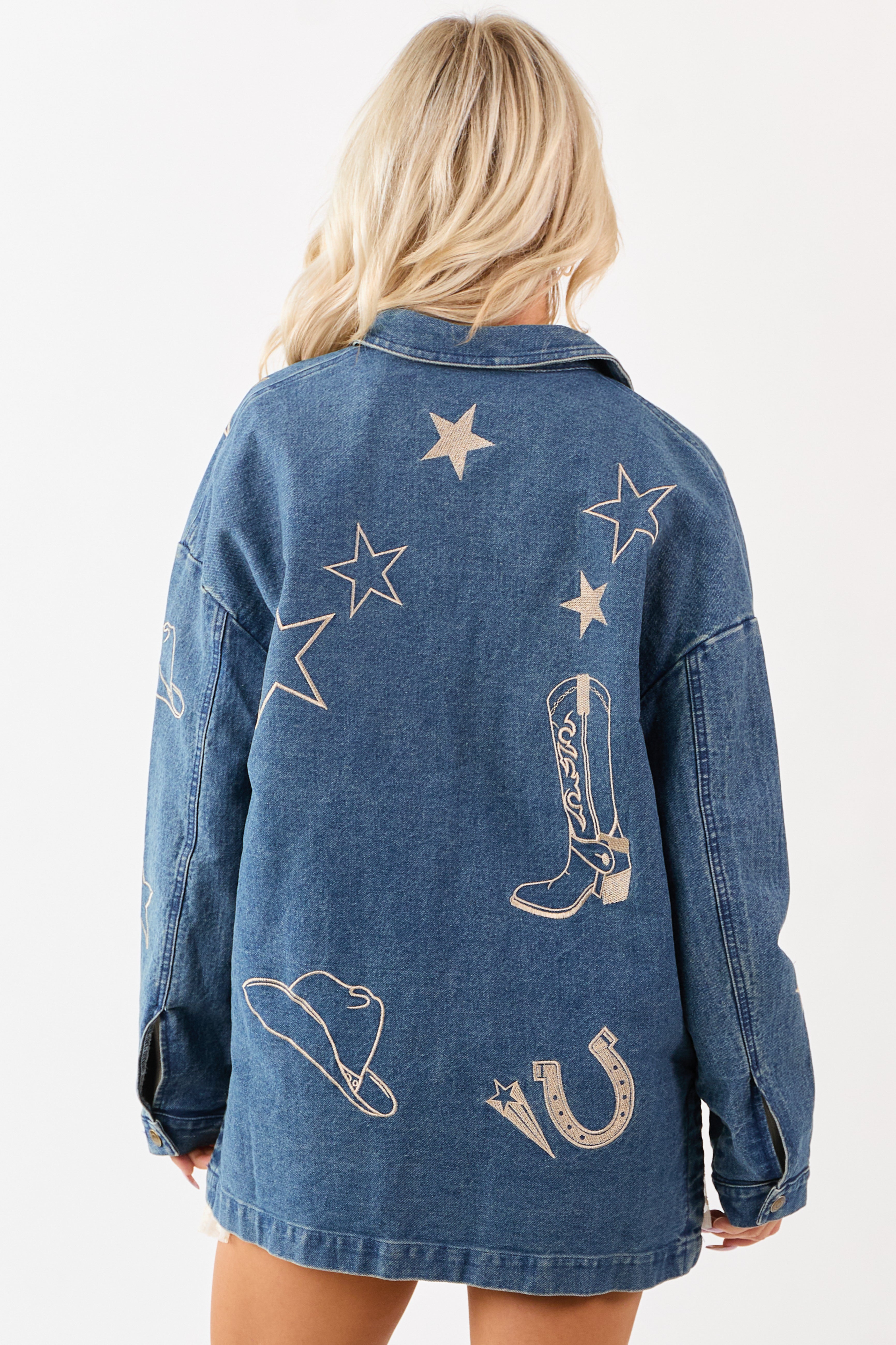 - Western-inspired embroidery adds bold detail to this oversized denim shacket.