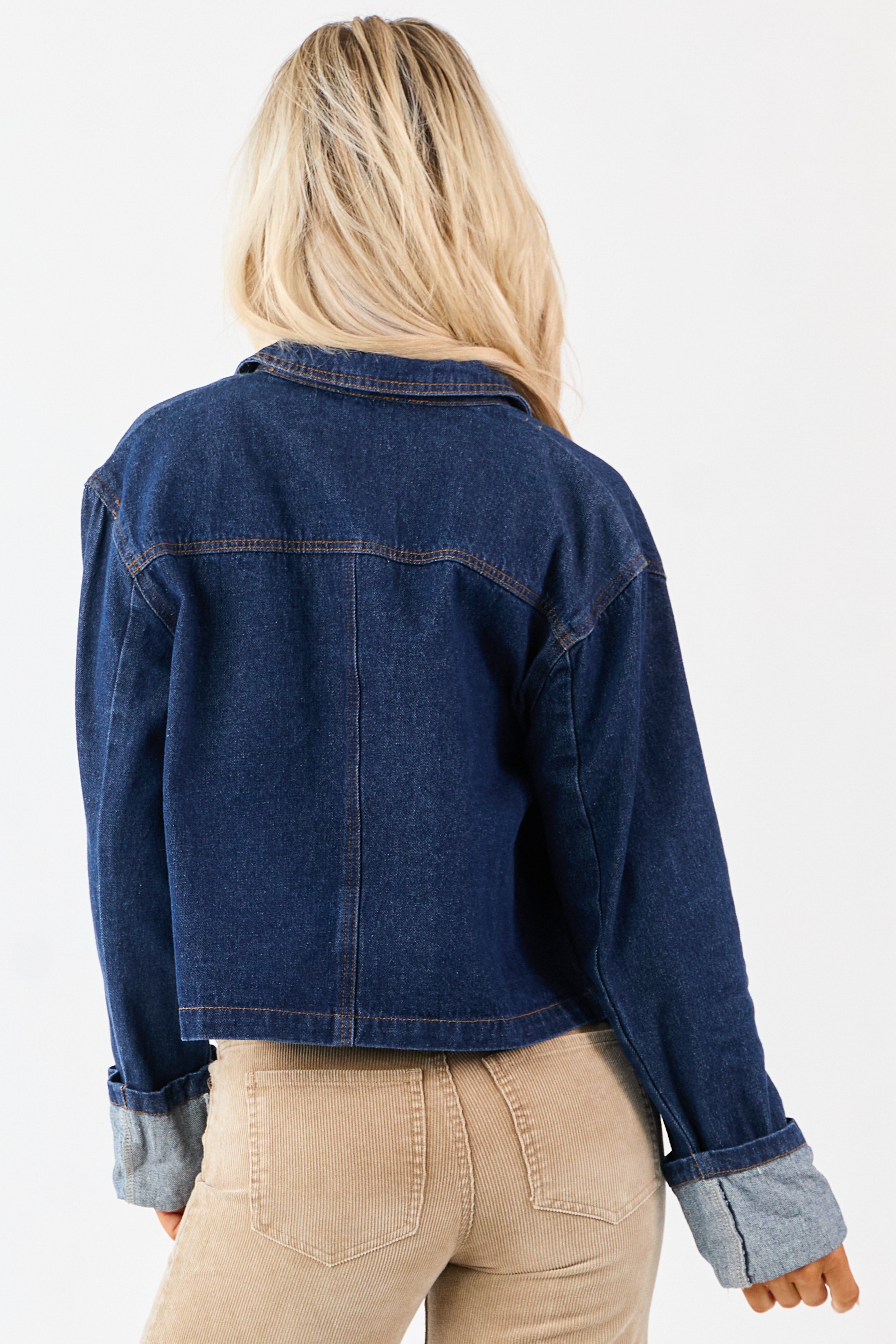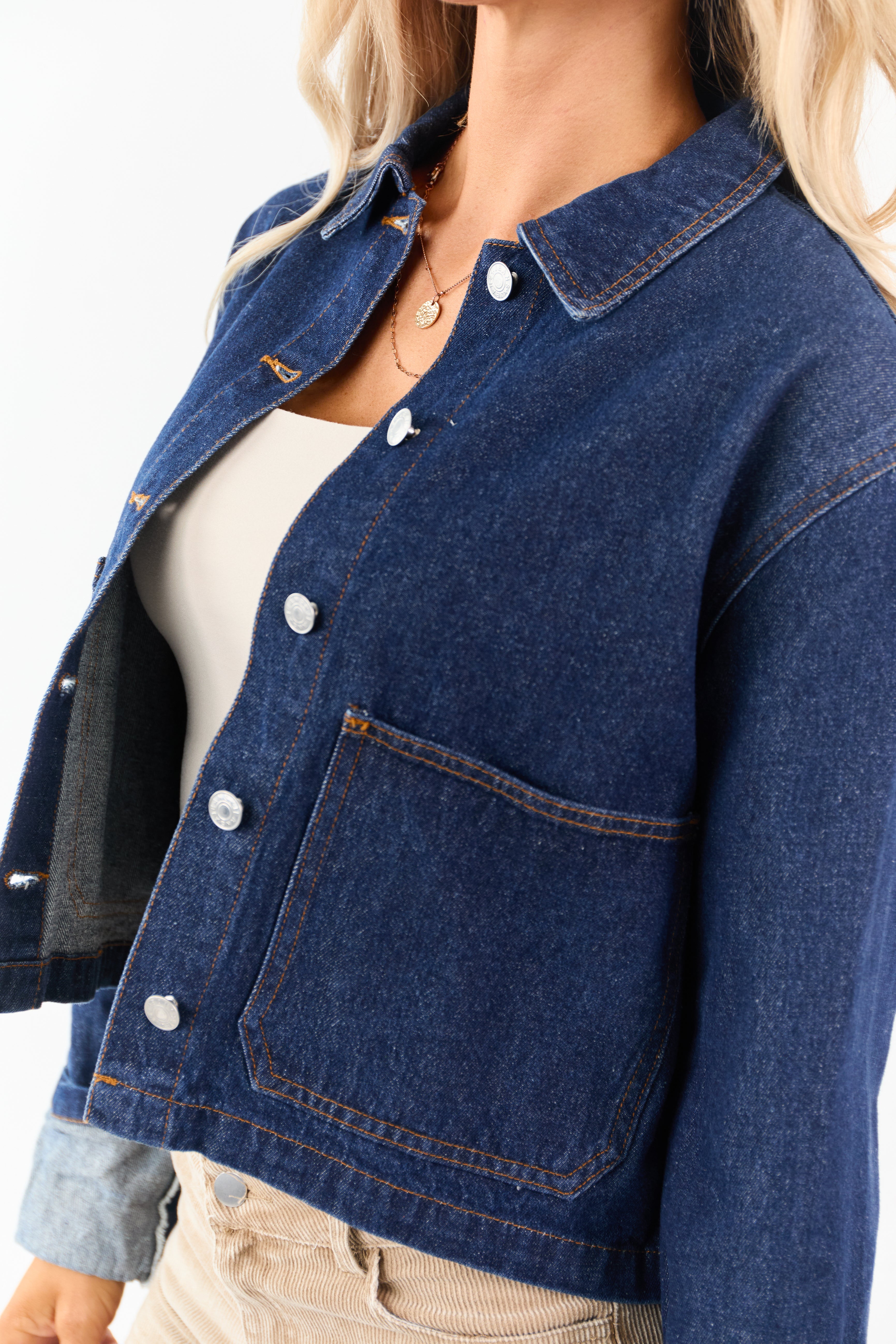 - Add instant edge with this dark denim jacket. Classic cool with a modern cut.