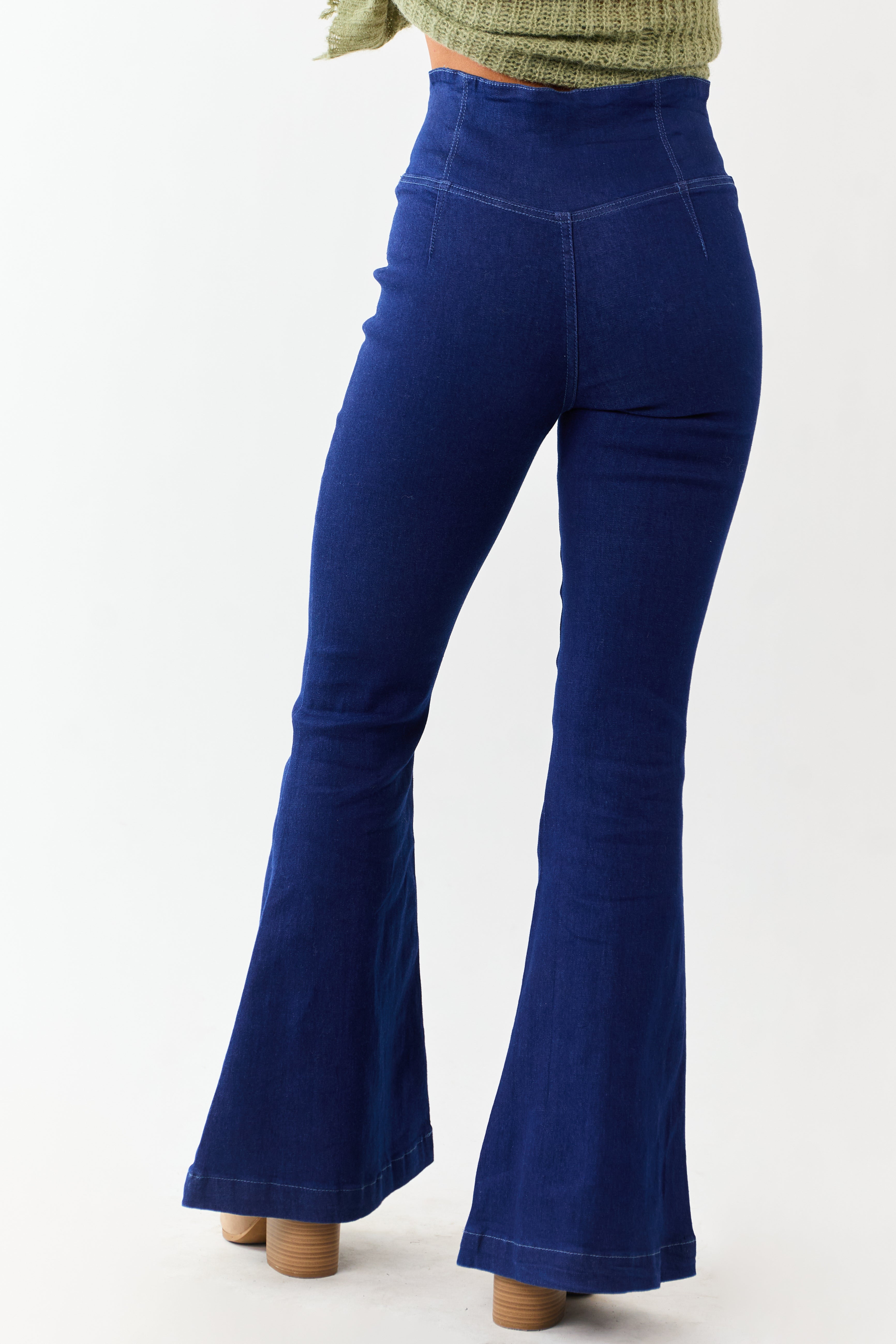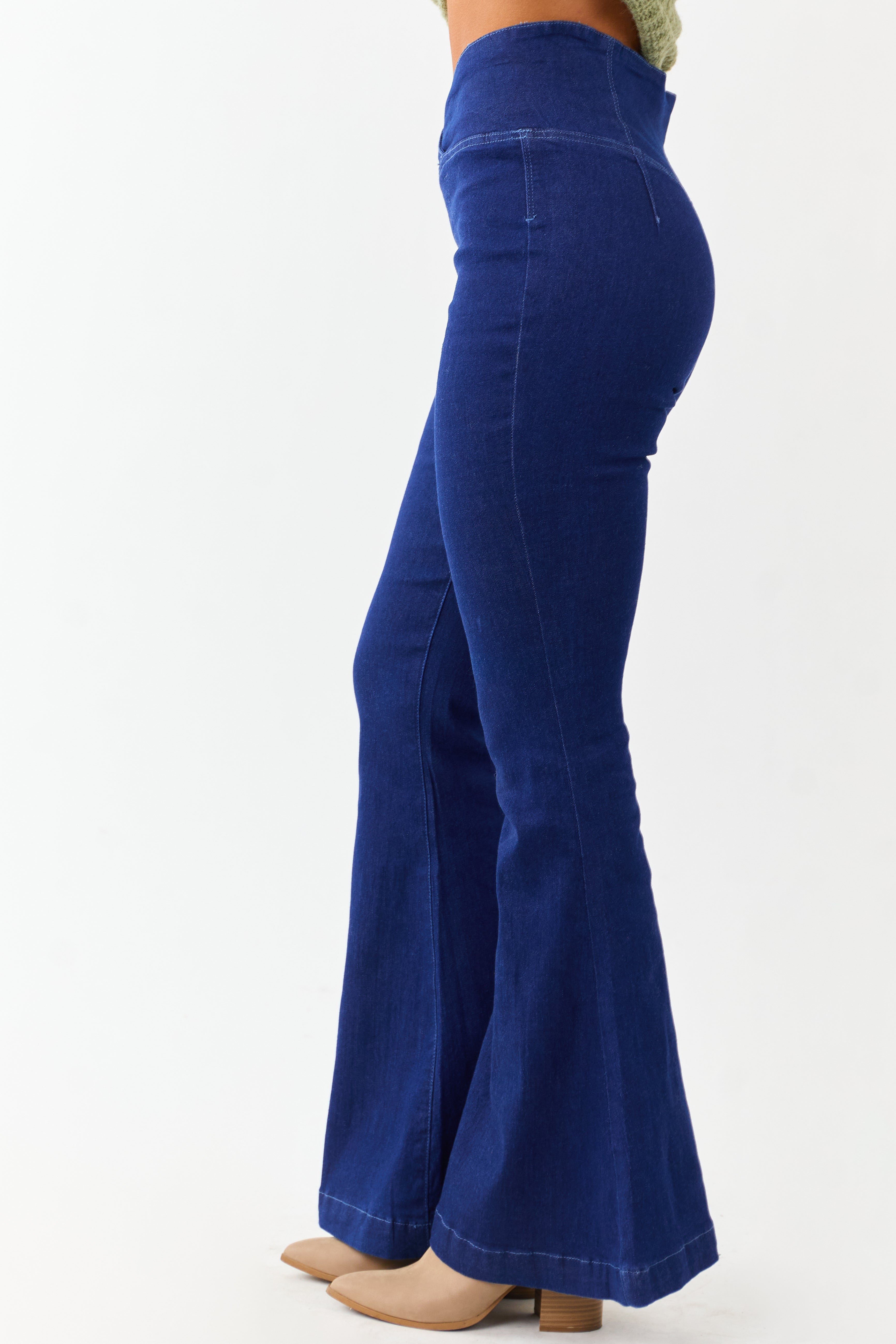 - Flatter your figure in these stretchy flare jeans with a V-wrap tummy control waist and easy pull-on fit.