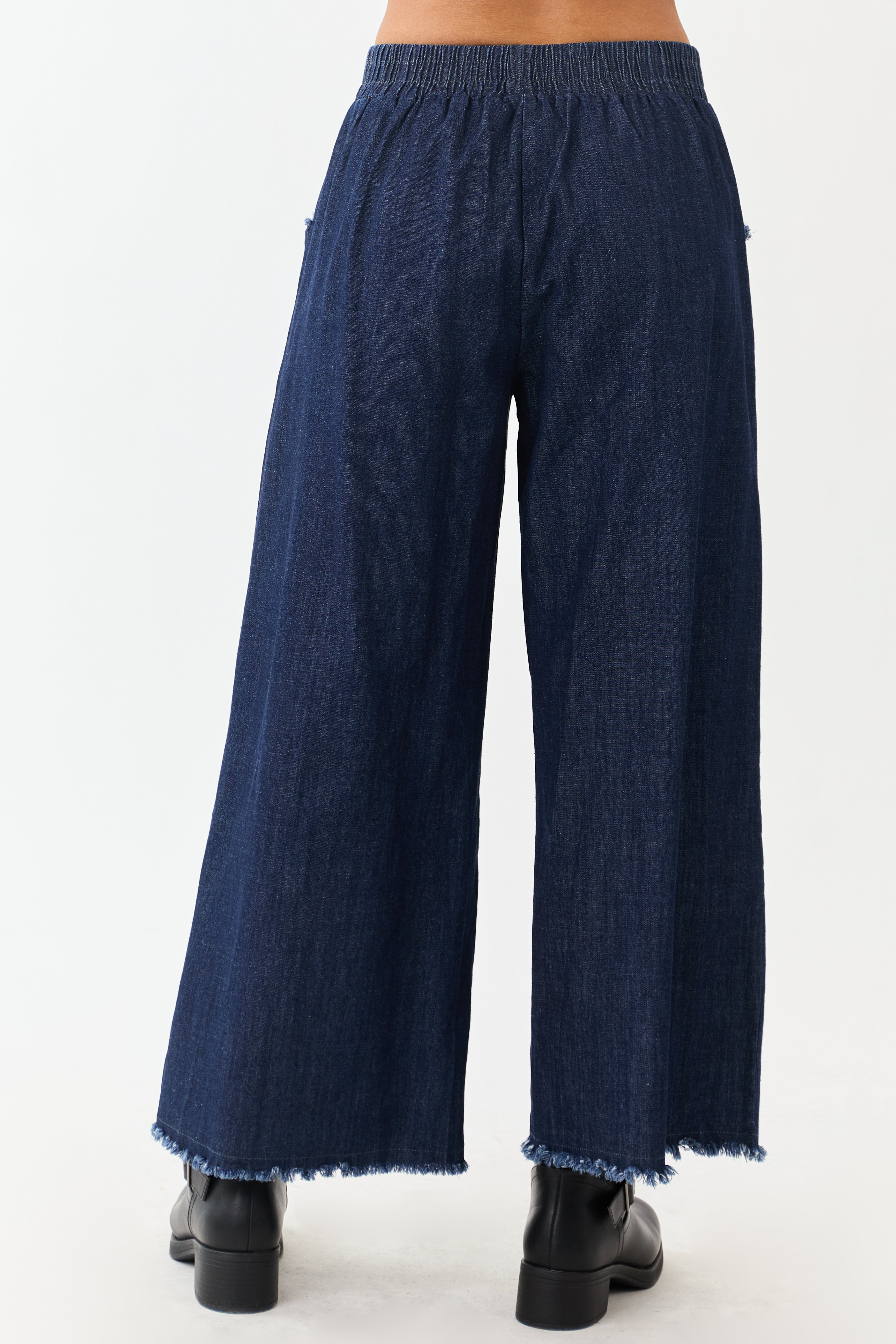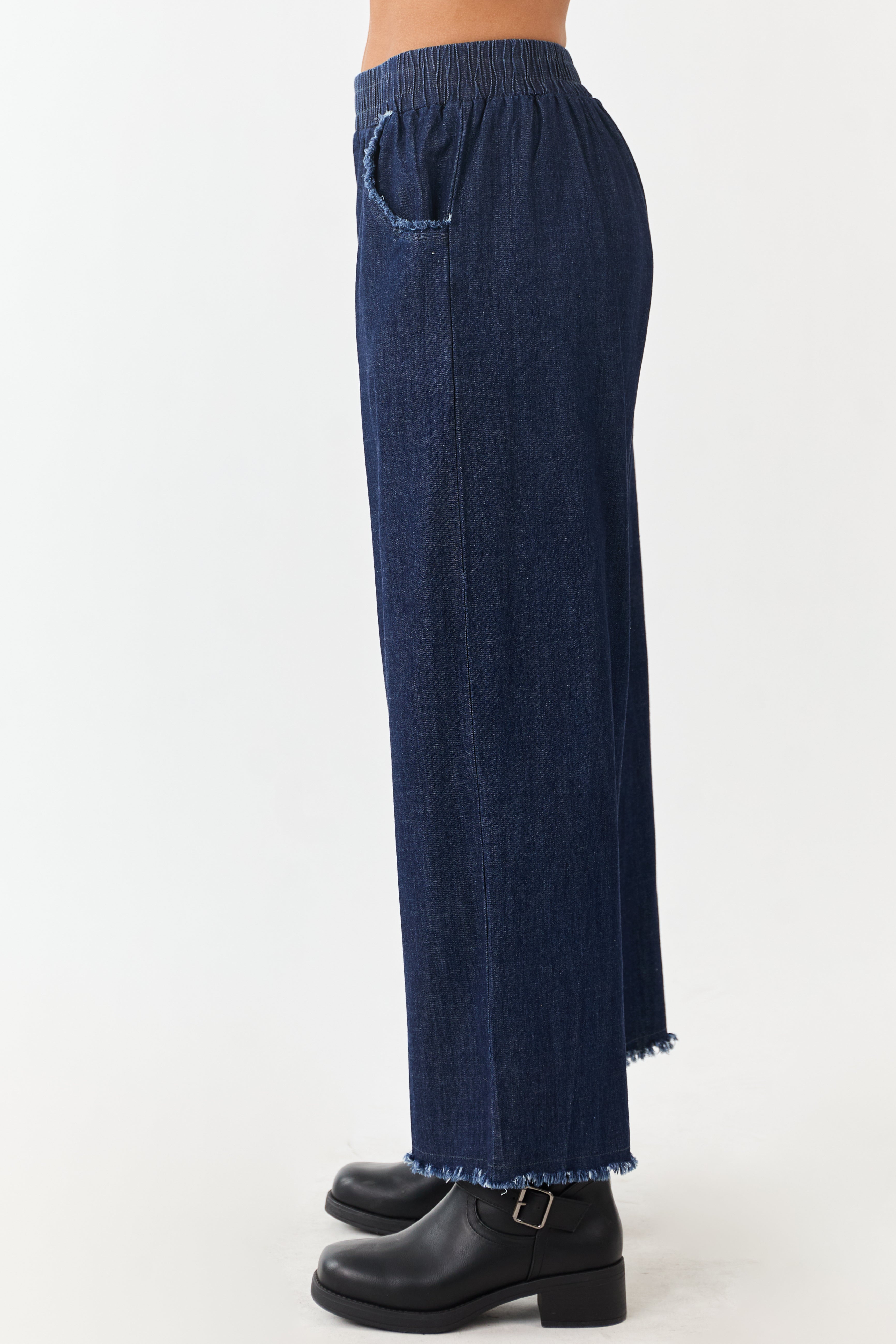 - These dark wash chambray pants feature a wide leg. cropped silhouette and comfy elastic waistband.