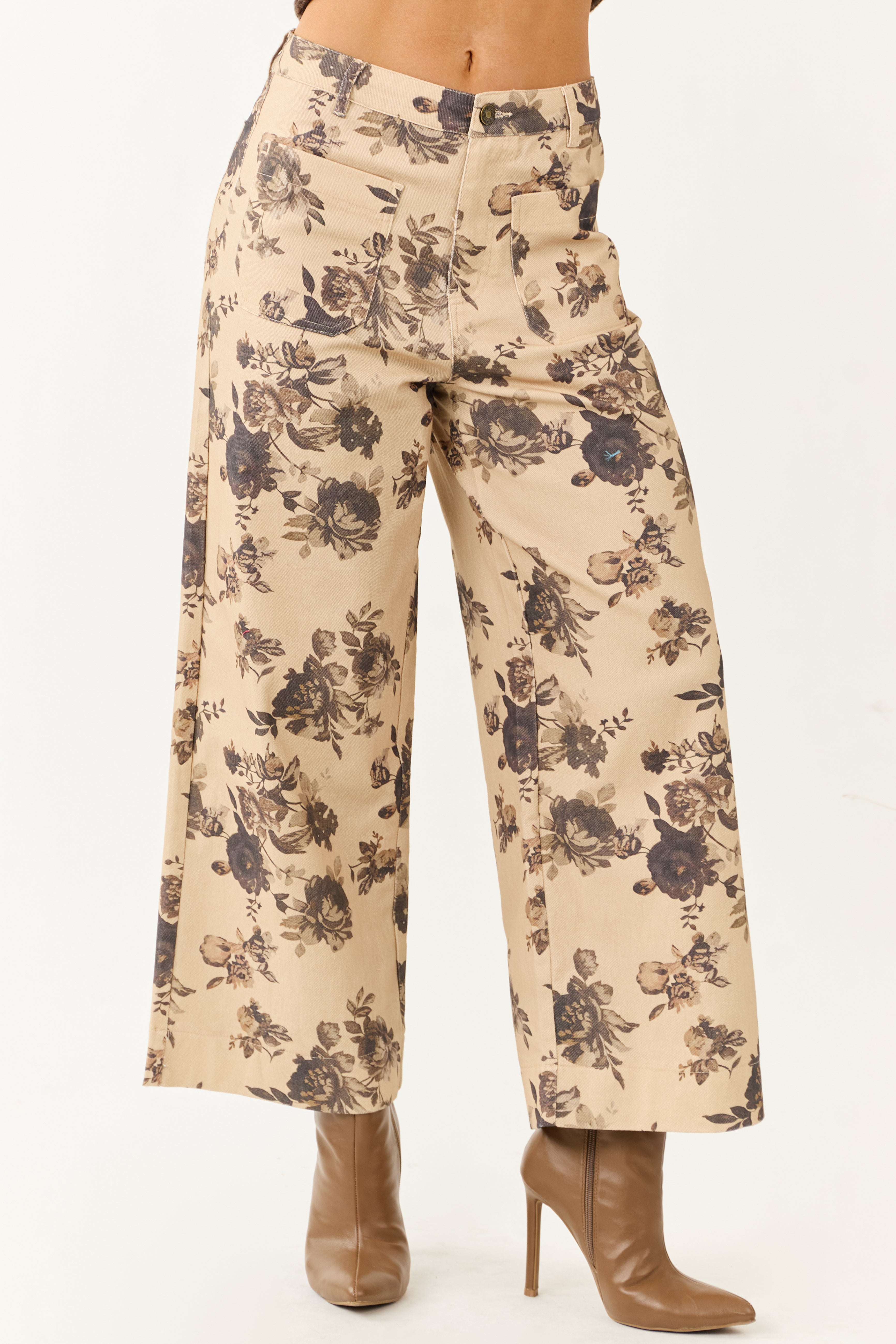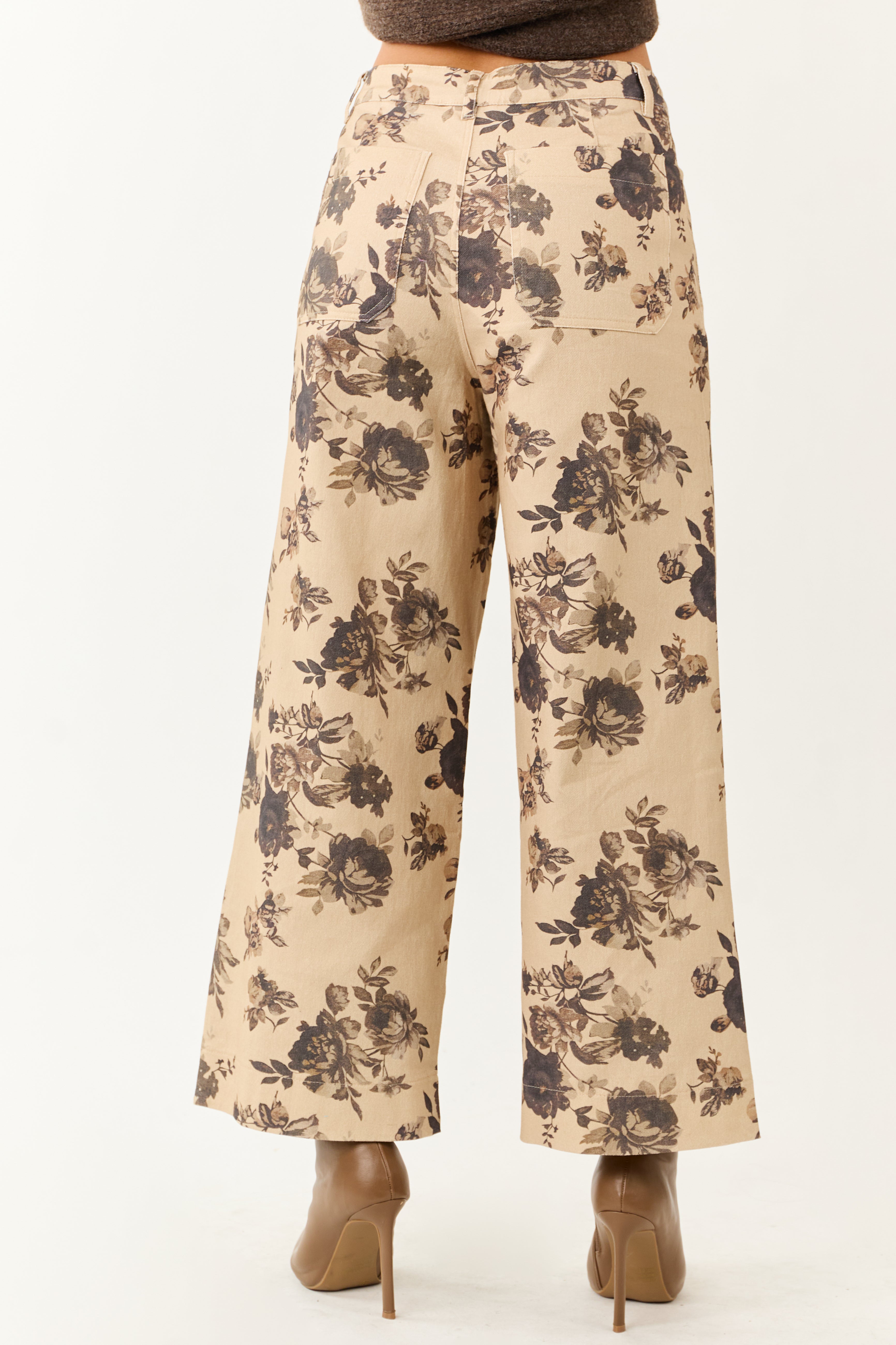 - Floral meets function in these stretchy denim pants—high rise fit and soft rose print bring vintage-inspired style to your wardrobe.