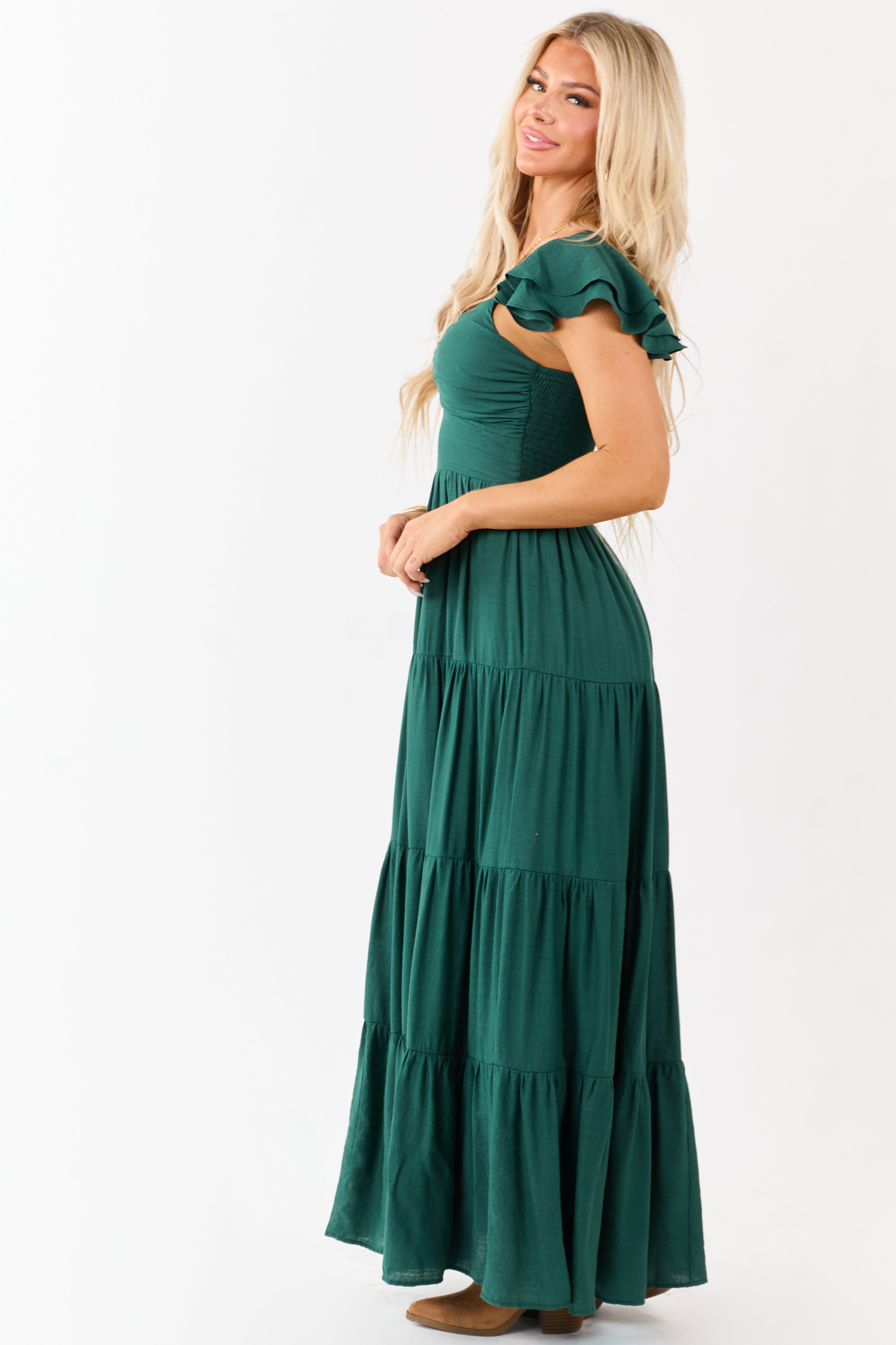 - A dreamy forest green maxi with a tiered silhouette—complete with a sweetheart neckline and smocked back for comfort.