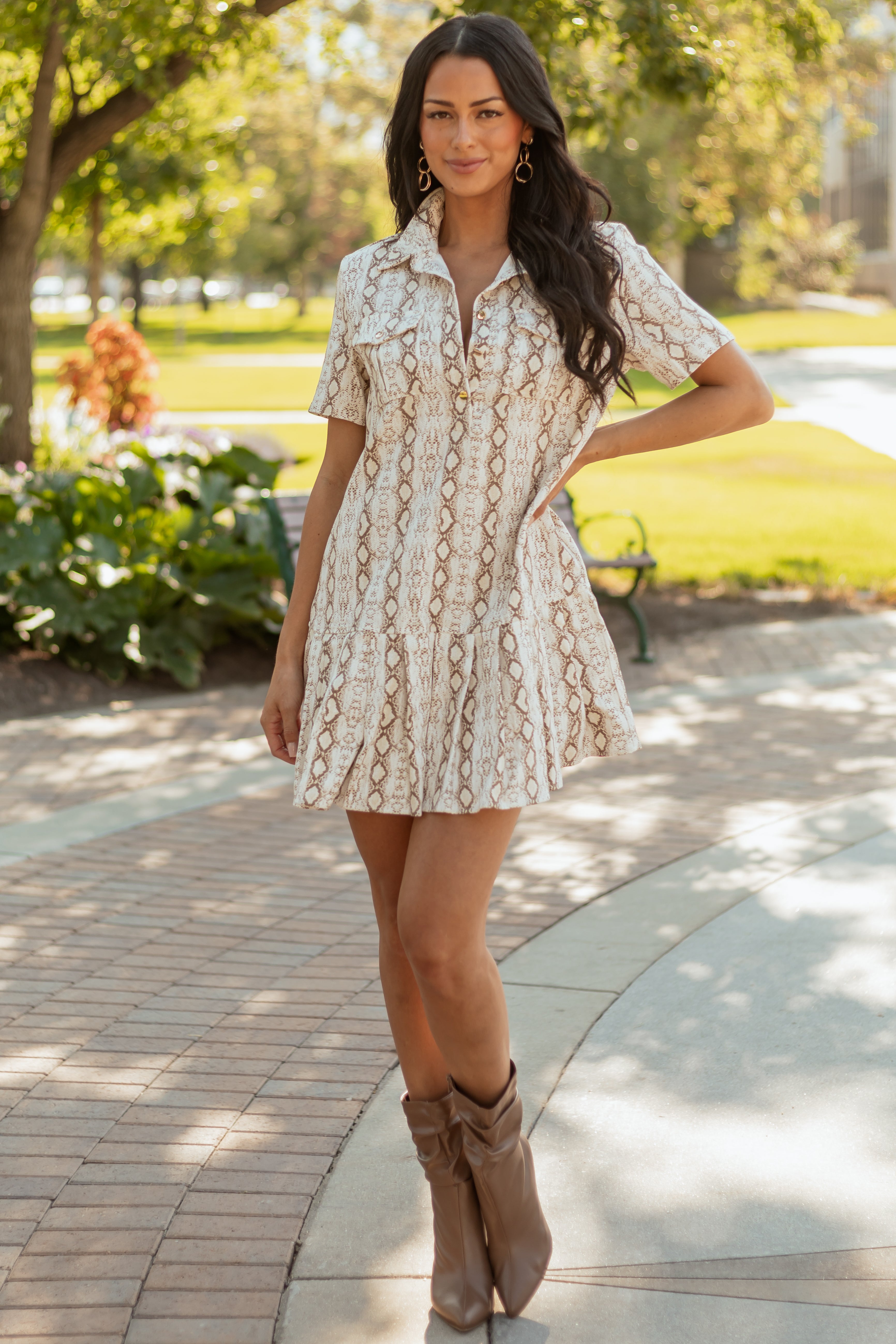 - Make a statement in this snakeskin print denim mini—featuring a half button-up front and sleek shift silhouette.
